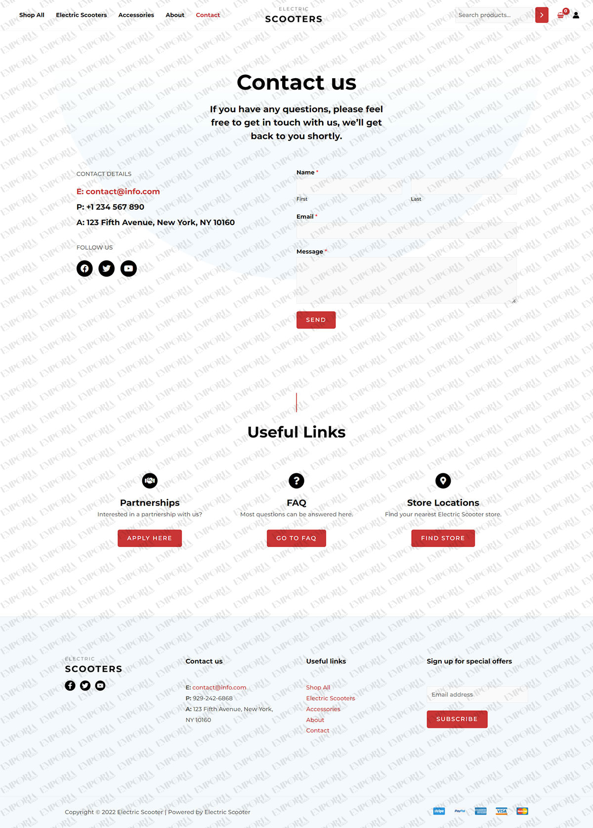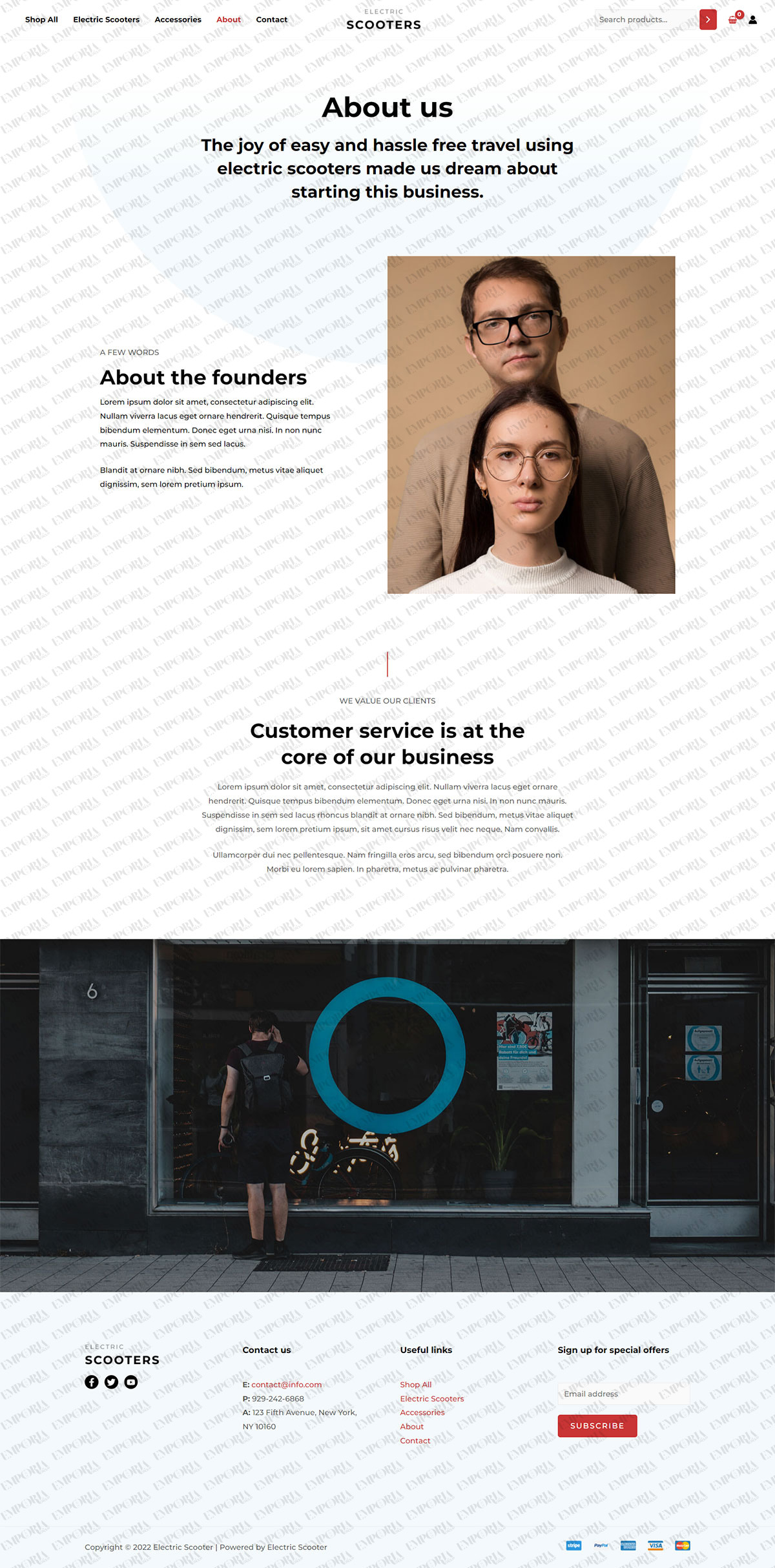 The Electric Scooter template is an eCommerce design with a contemporary feel. It opens with a large product section and unfolds into a wide open store template with a parallax effect that works incredibly well.