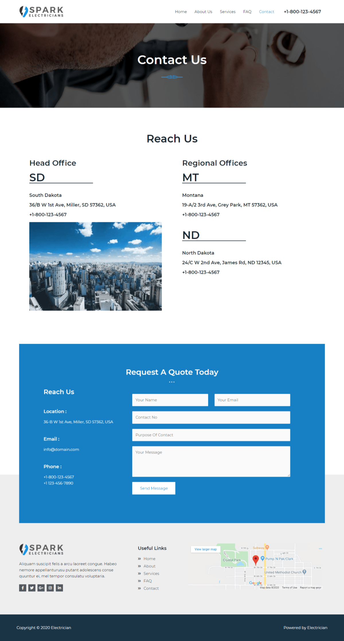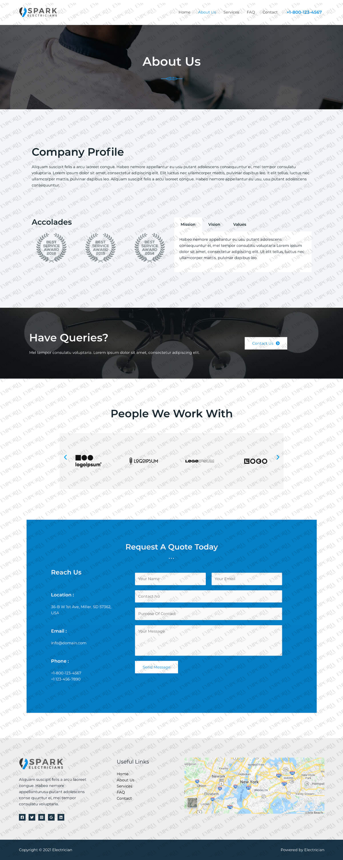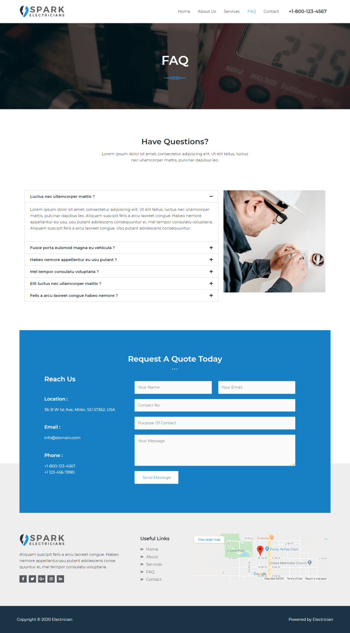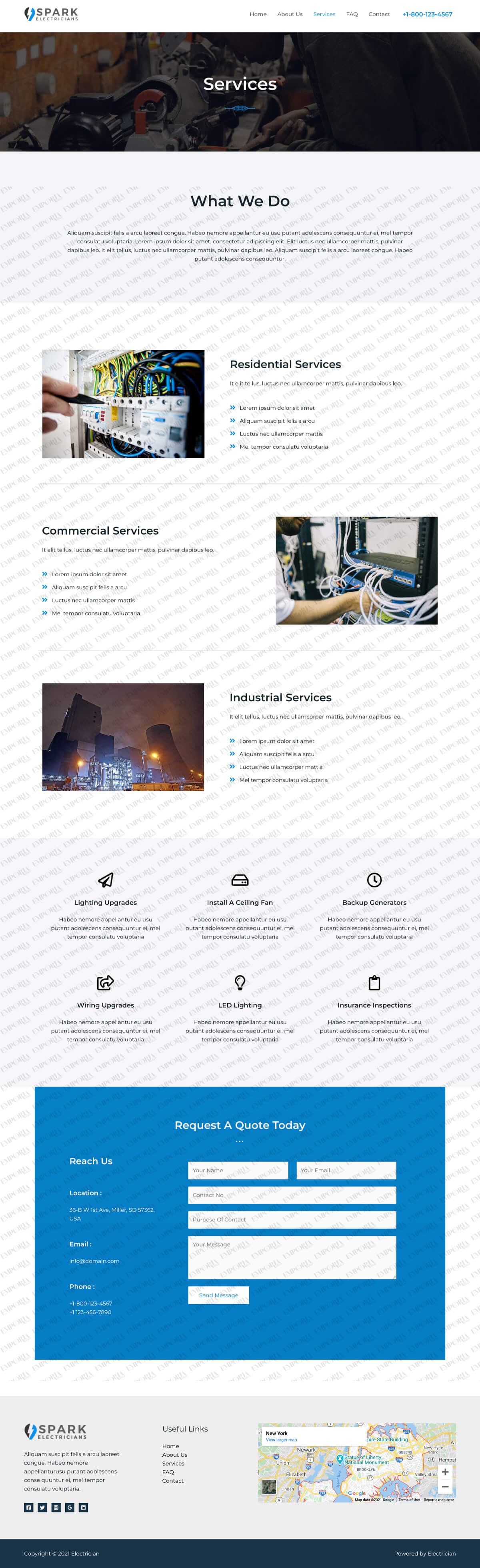 The Electrician template also includes service pages, about, FAQs and contact page. You can add more pages in seconds thanks to full compatibility with drag and drop page builders.