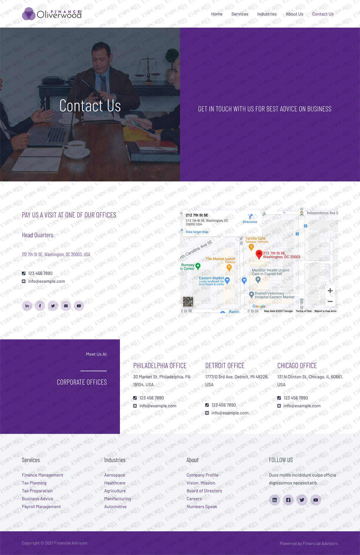 The Financial Advisors template has the gravity and authority clients look for in the financial niche. All without being too overbearing or too sensible. It’s a modern, light design with lots of images and bold contrast colors.