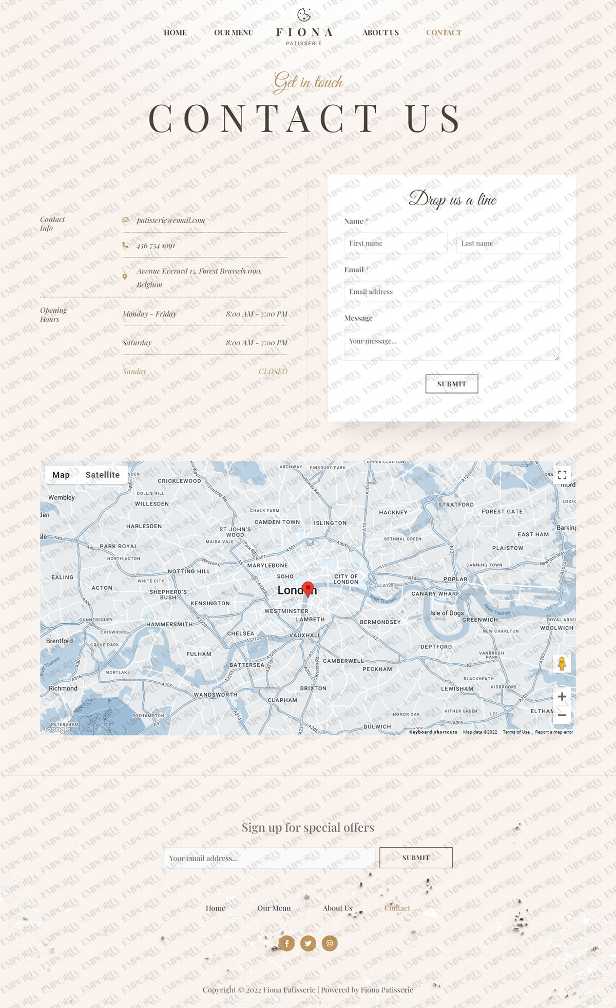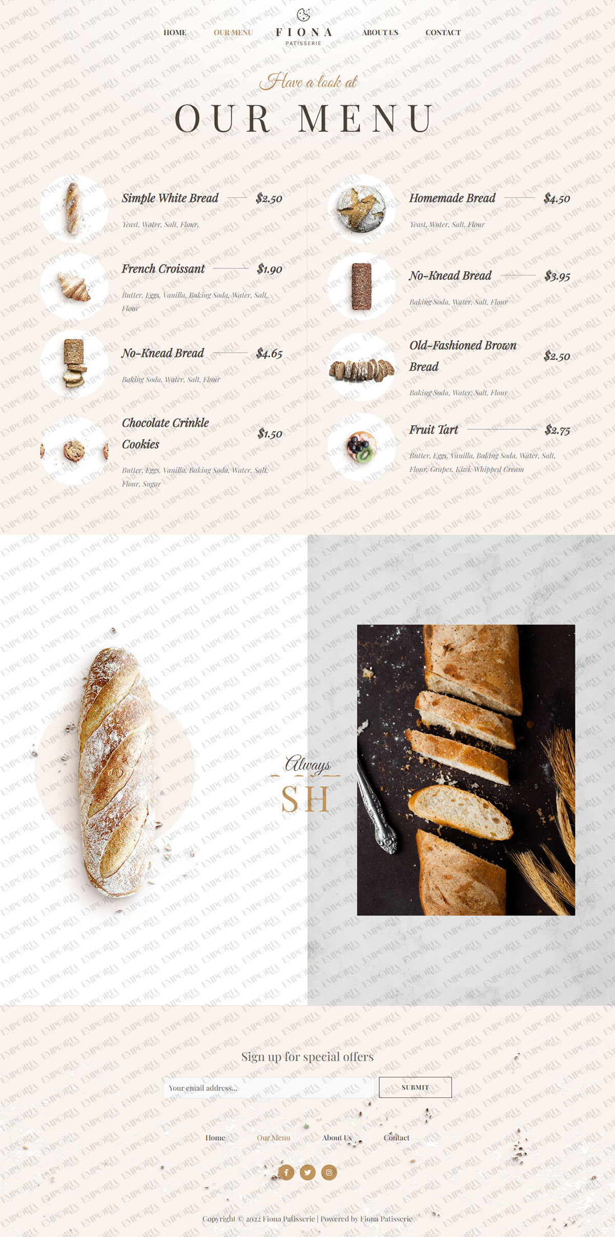 The Fiona Patisserie template is a light and engaging food template that opens with a large slider with high quality images and a simple menu up top. The page unfolds into a light, engaging design with parallax effect and more imagery.