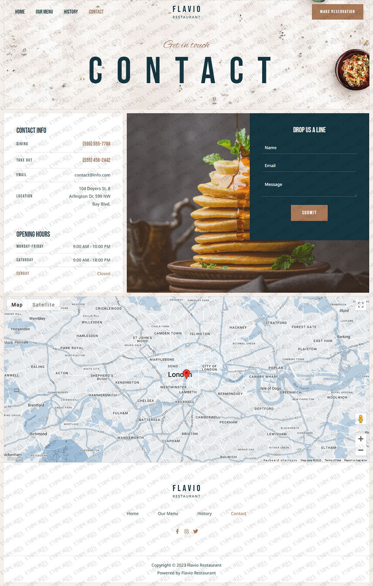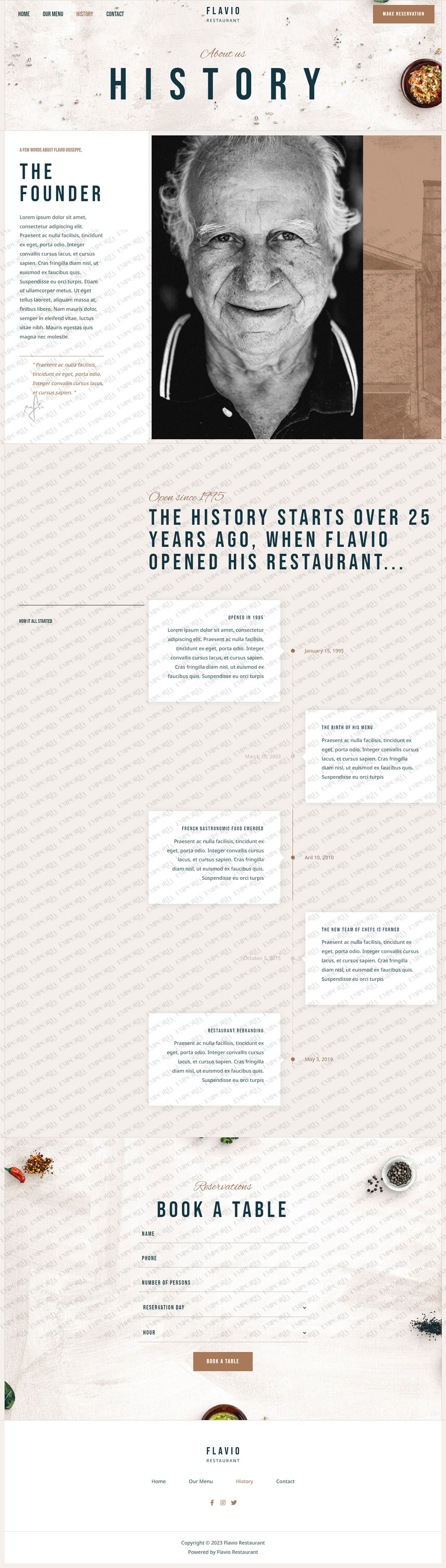 The Flavio Restaurant design has an attractive menu section with dedicated pages, a built in reservation element, attractive contact form with map and the social media elements you expect from a restaurant website. Everything can be fully customized to suit.