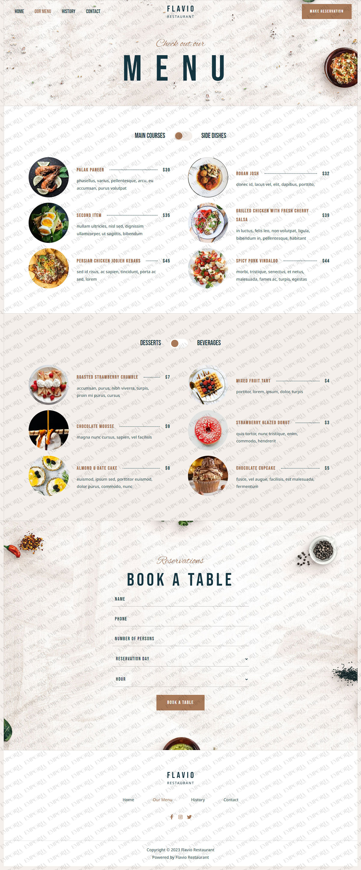 The Flavio Restaurant website template is a modern fullscreen design with a mixture of modern and handwritten fonts and beautiful images of food throughout. It’s an engaging design with lots of color and imagery to catch the eye.