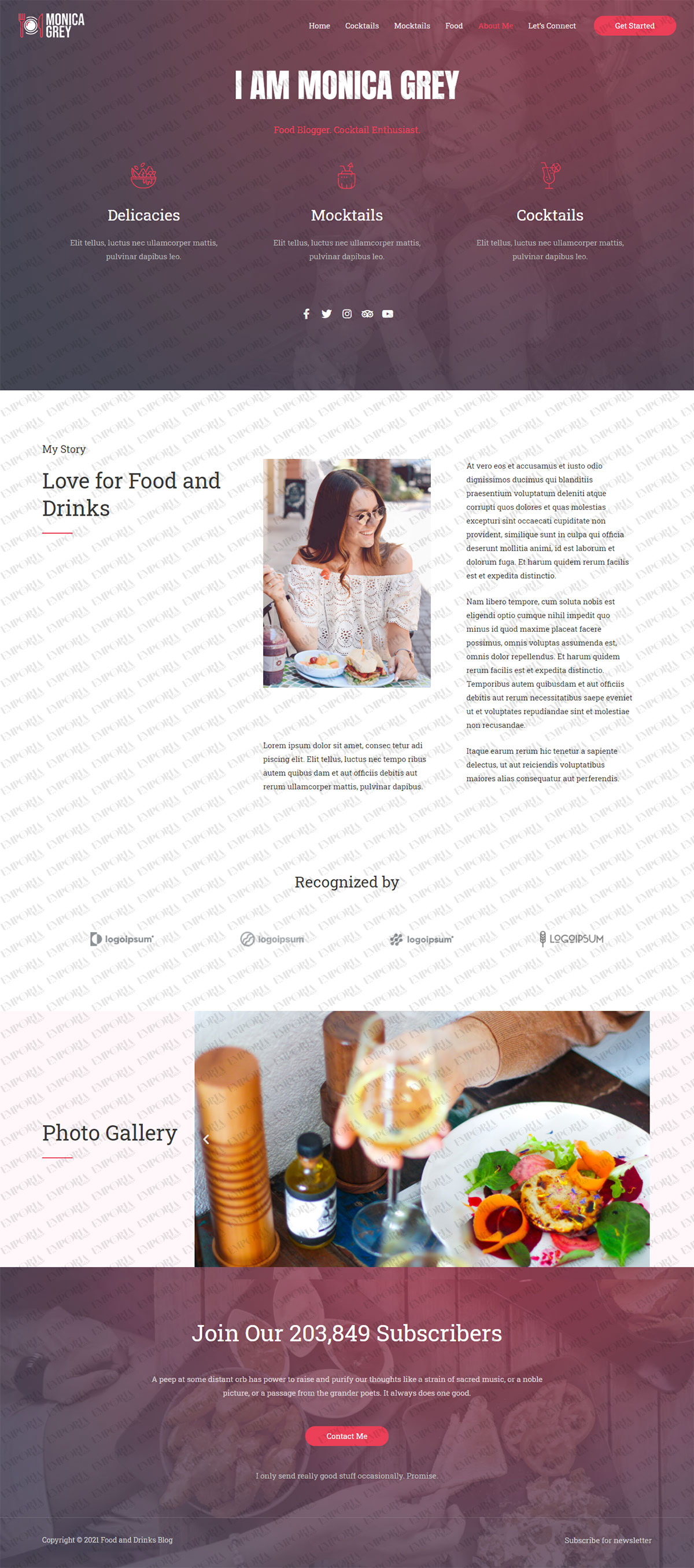 The Food and Drinks Blog template has a great design that sets it apart from the usual. It opens with a full screen image with space for a headline and call to action before opening out into a traditional blog layout. This helps create a fantastic first impression.