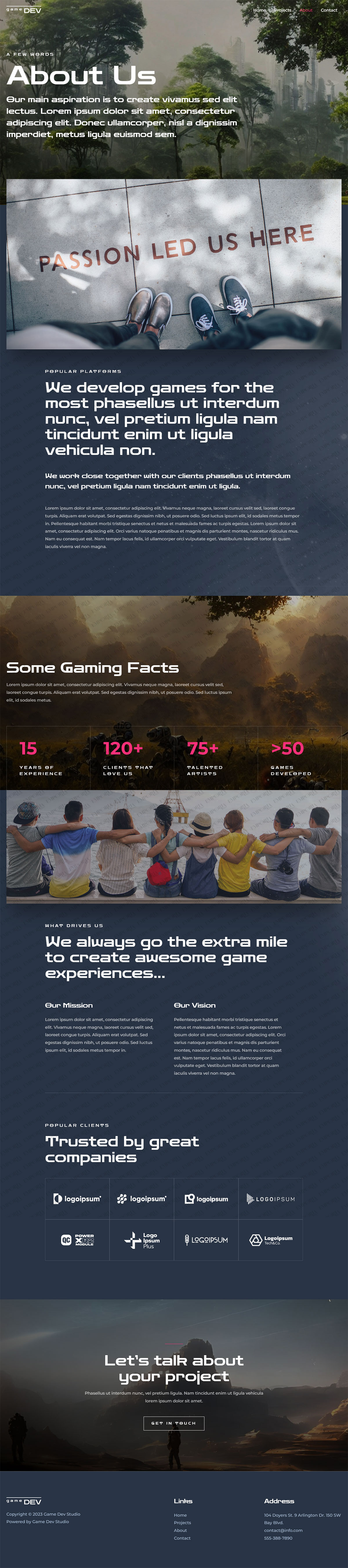 The Game Dev Studio template has everything a development studio needs in a website. Content boxes, fullscreen design with amazing background images, blocks to showcase your games and extra areas to help you tell your story.
