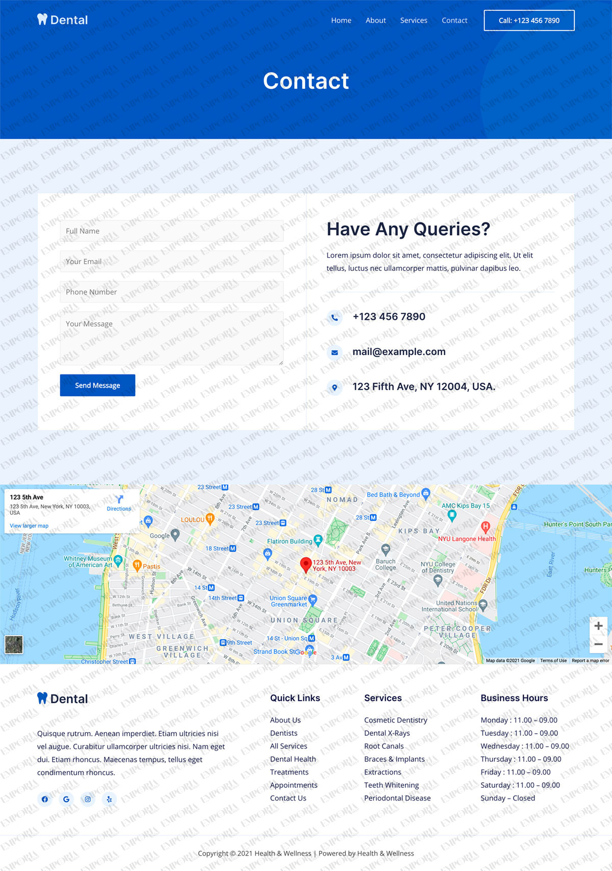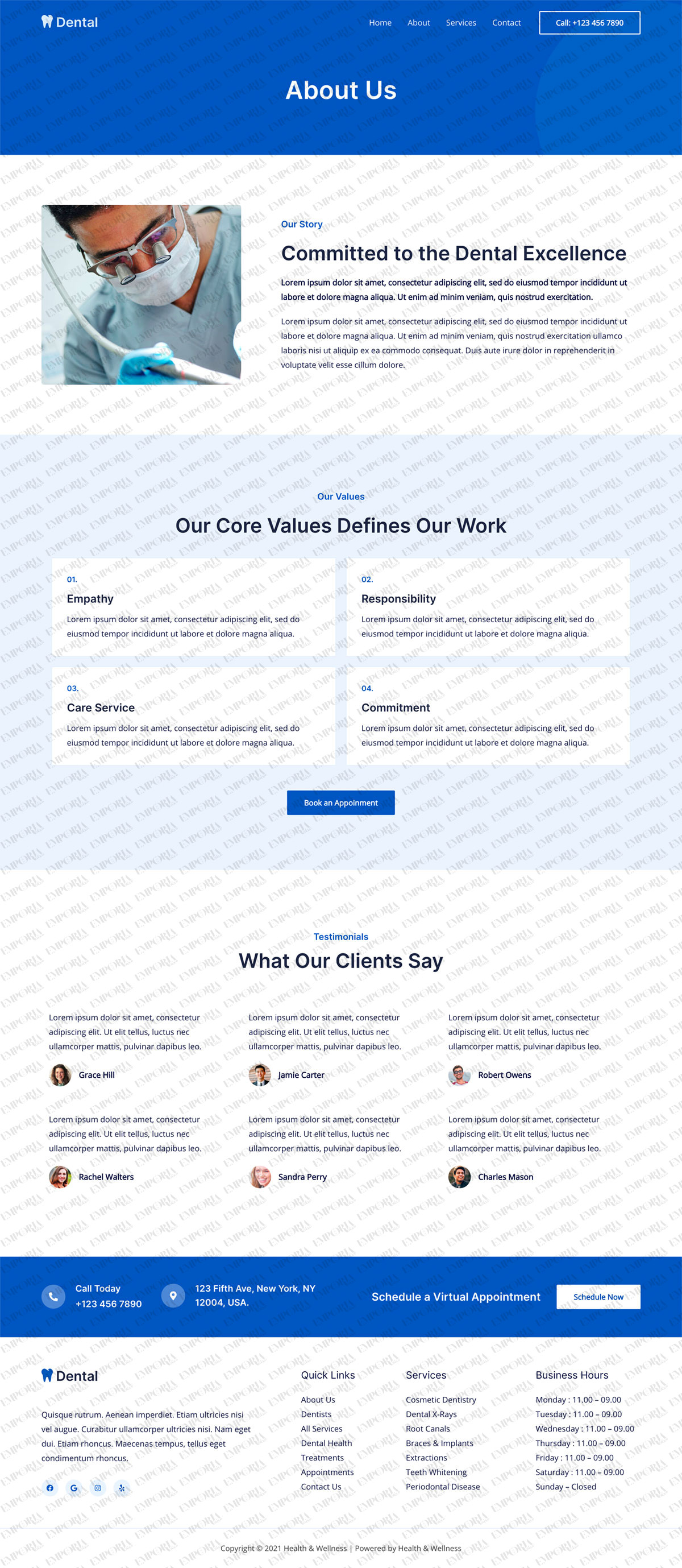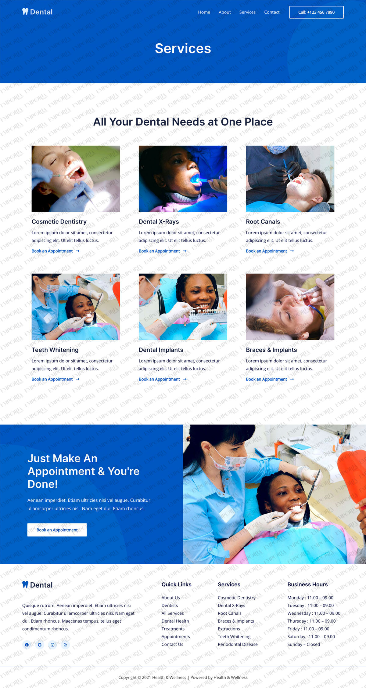 The Health & Wellness template reflects the clean, crisp feel you would want to see in a dentist or healthcare setting. It’s a modern flat web template with distinct borders, a reassuring blue colorway and modern fonts, ideal for health and wellness.
