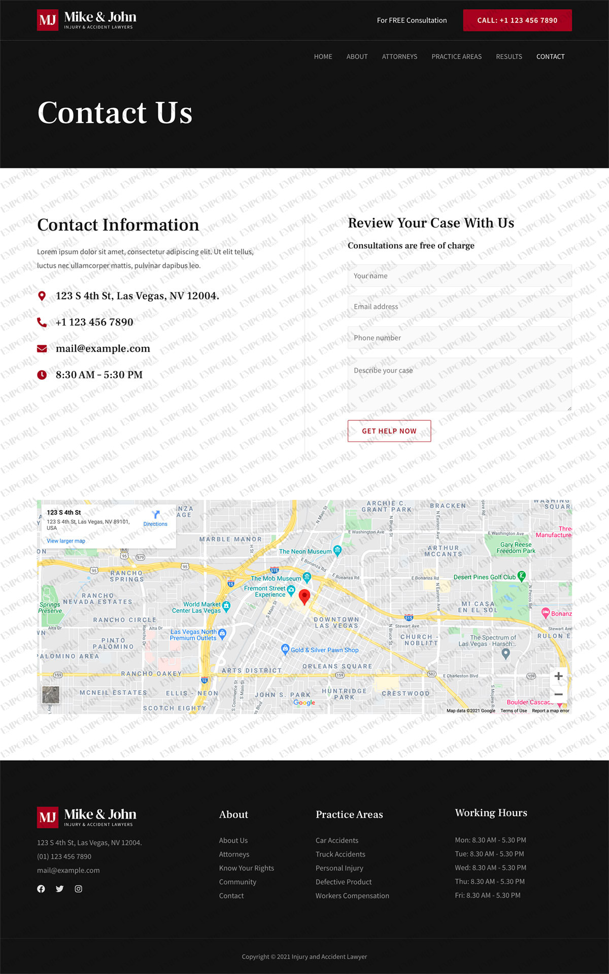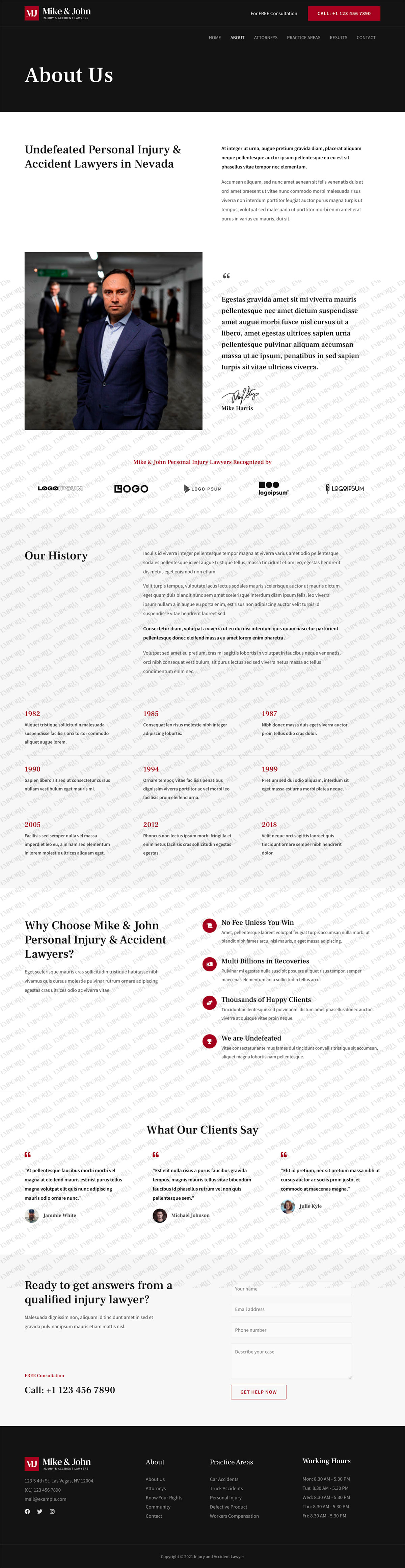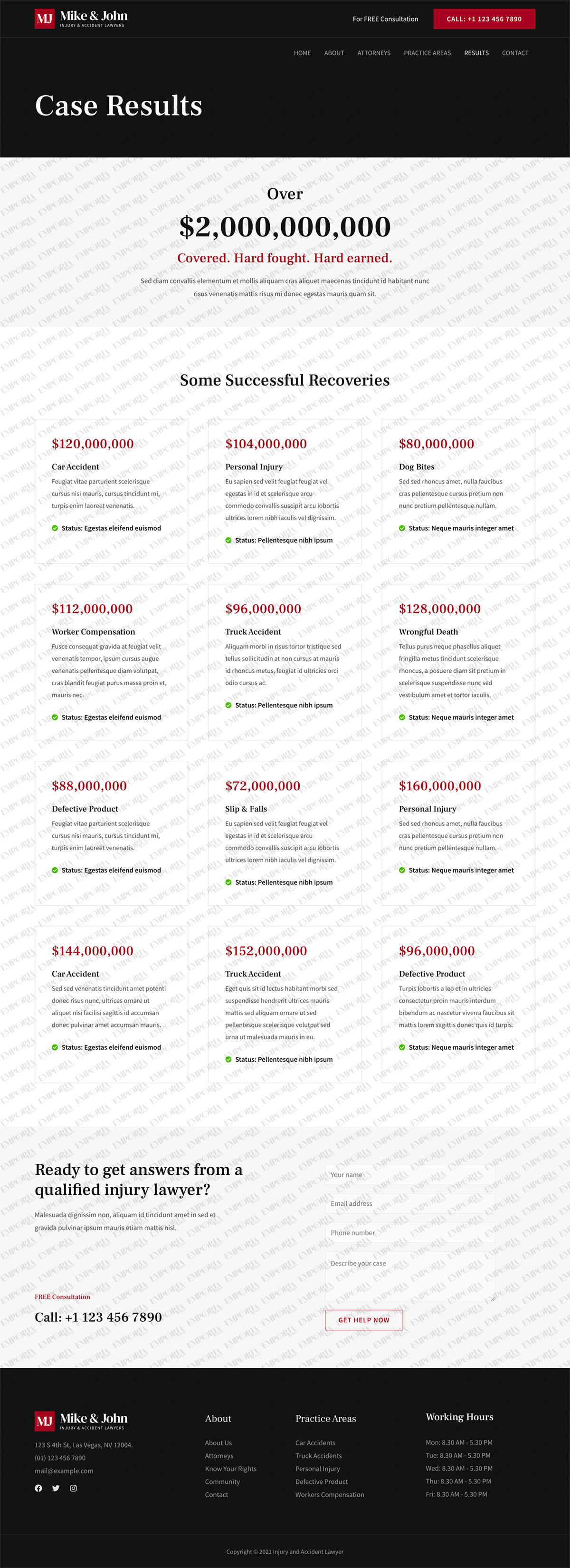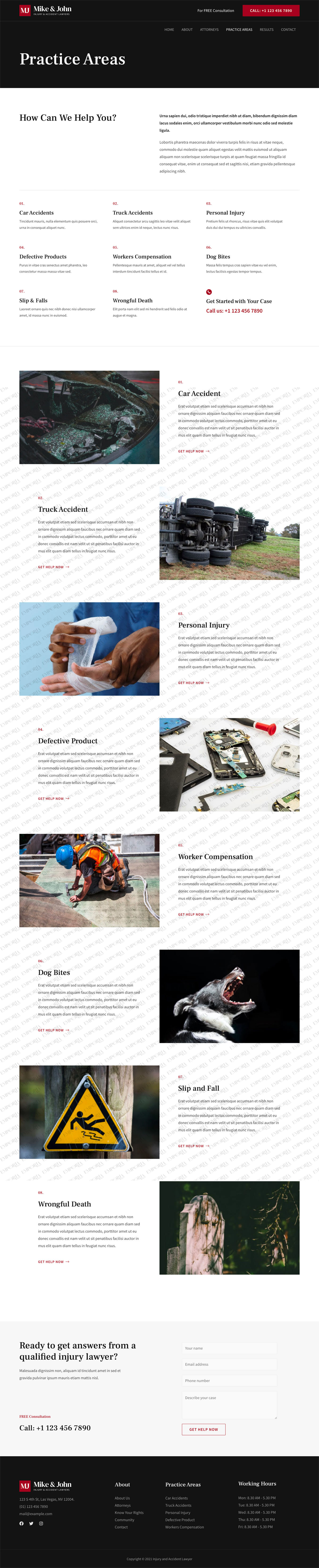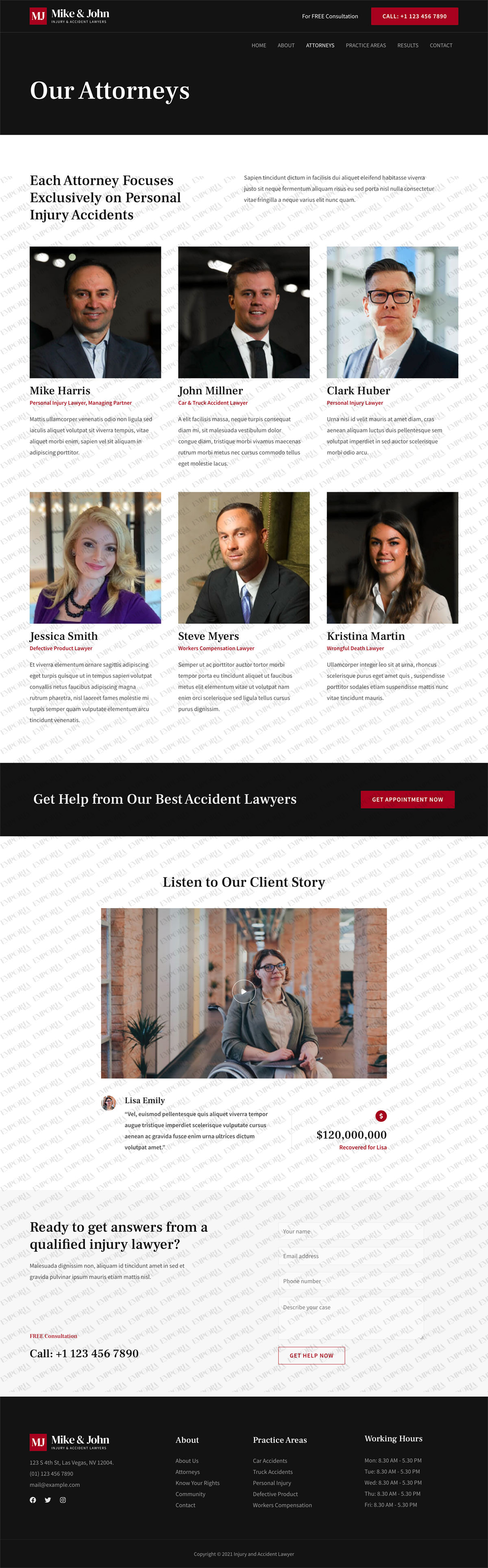 The Injury and Accident Lawyer template is a sober business template that’s perfect for law firms, lawyers and the legal industry. It uses light and dark design with a strong contrast color to build authority and trust.