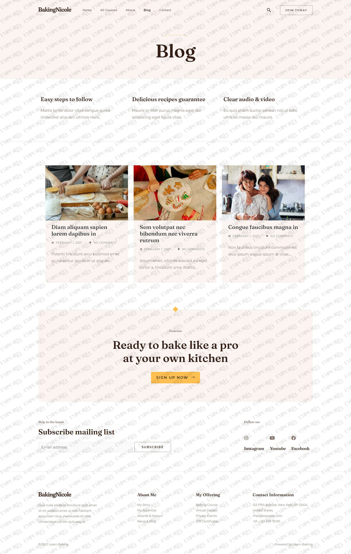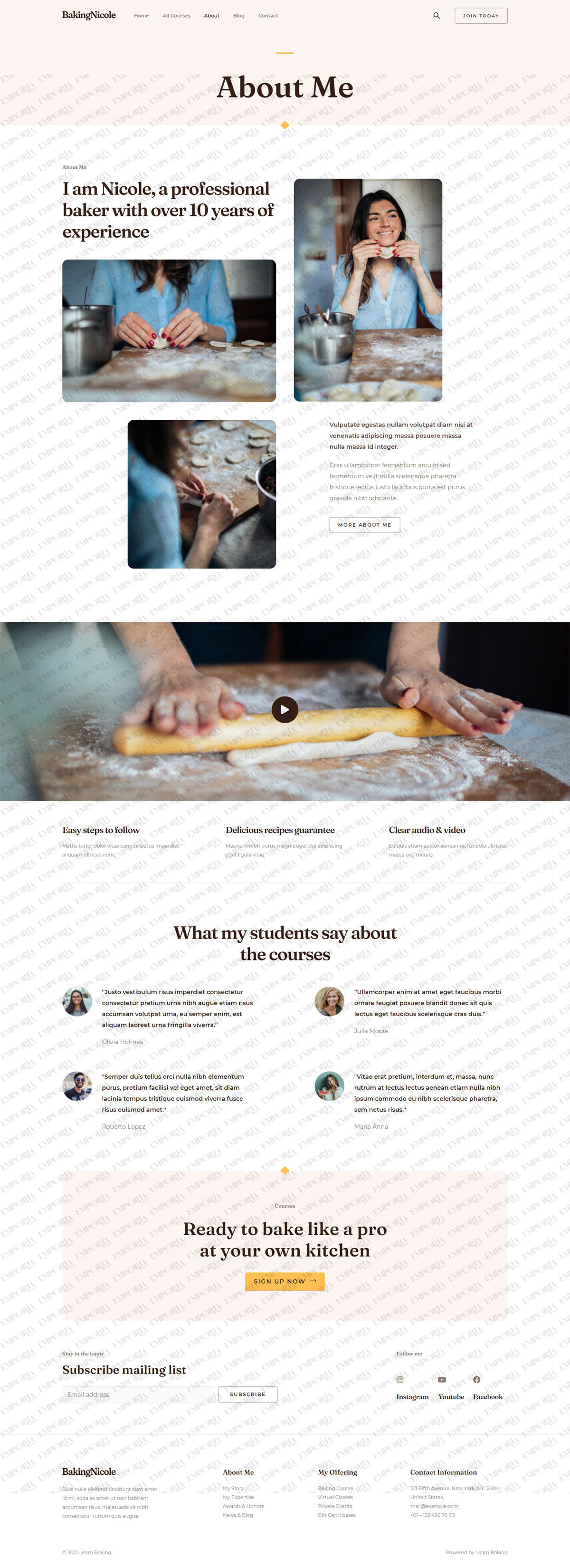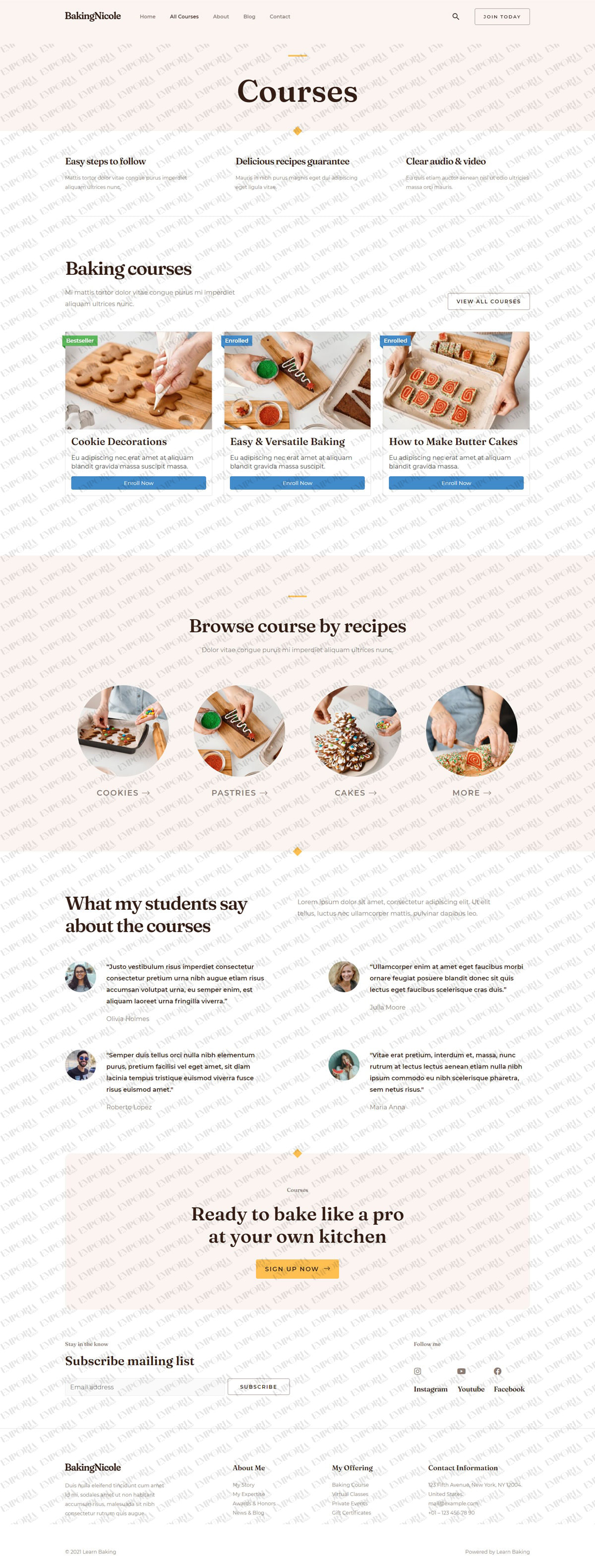 An online platform helps break boundaries and reach a wider audience. And with our Learn Baking template, you can offer online courses on baking cookies, pastries, cakes, and more to just about anyone.