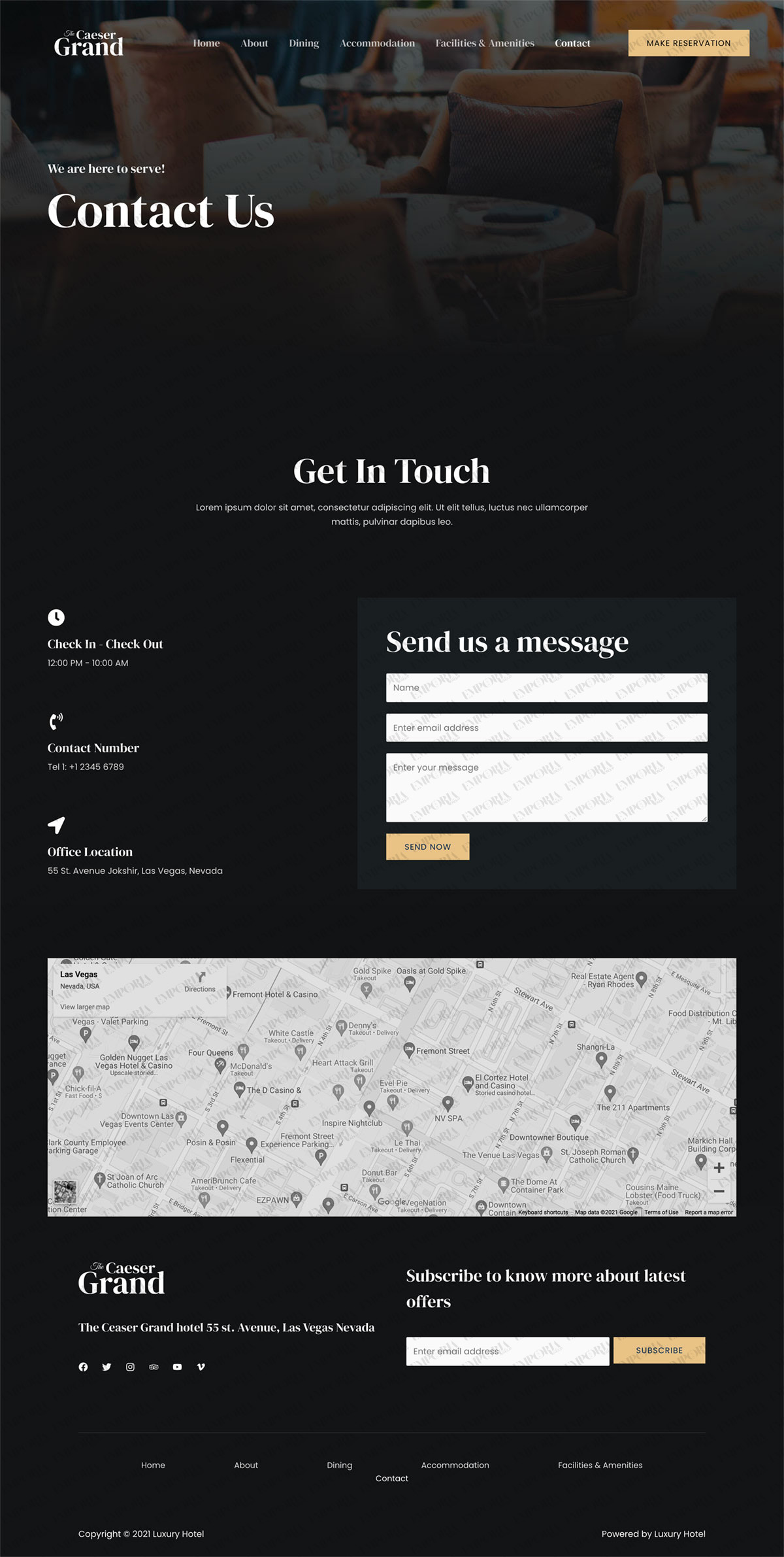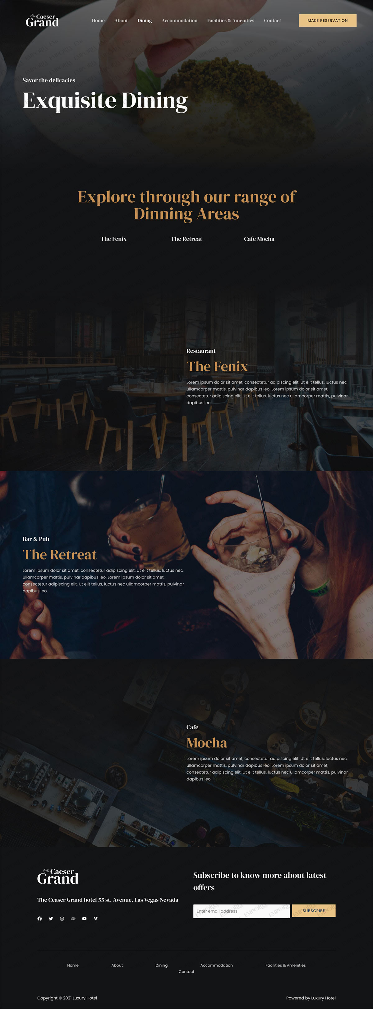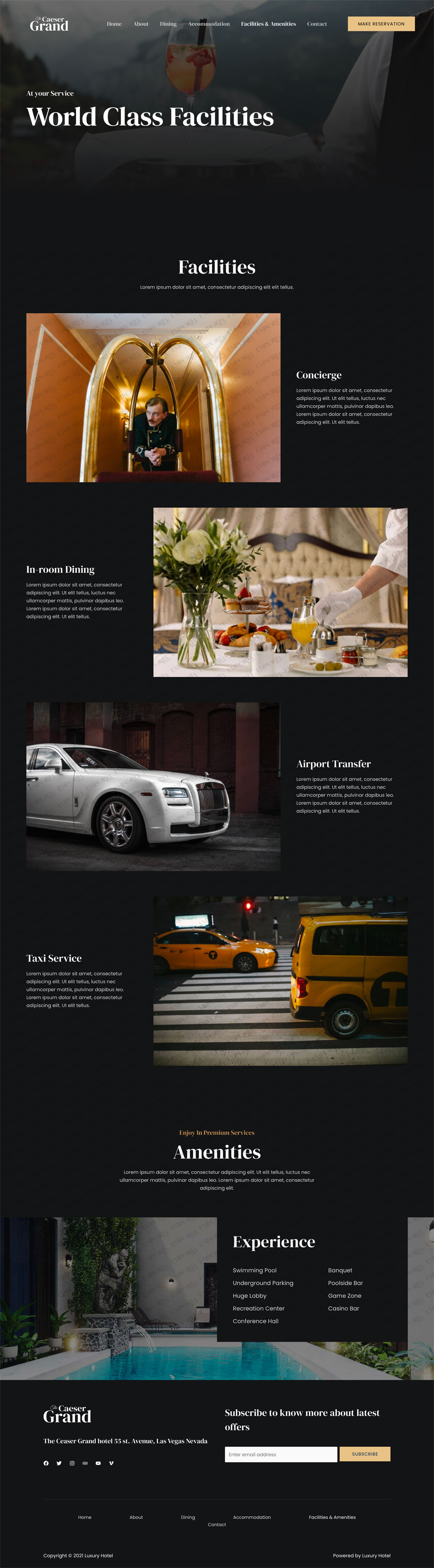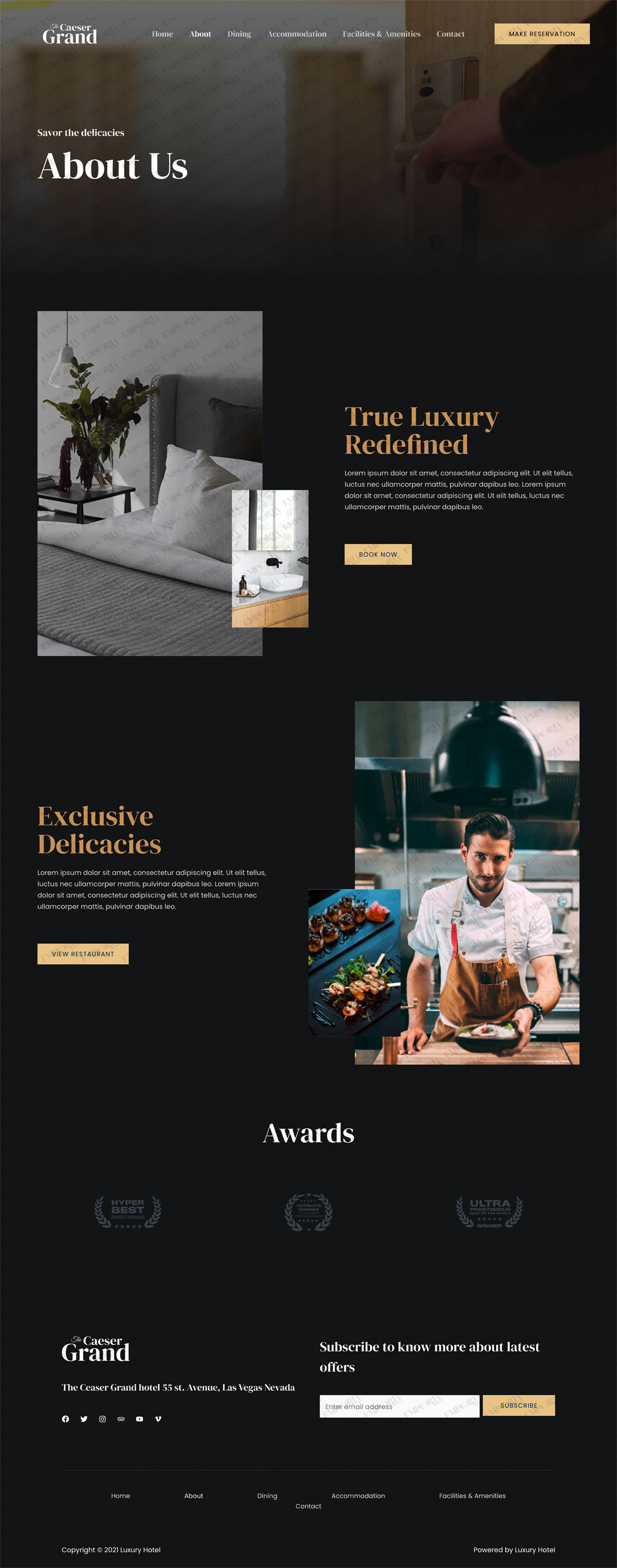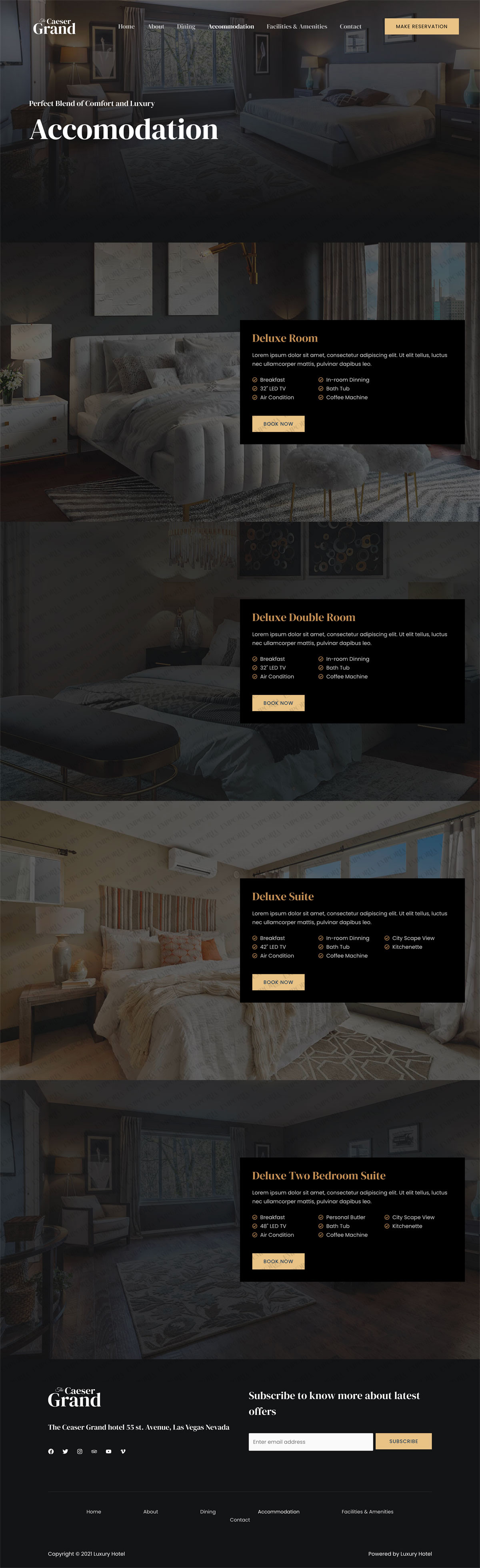 The Luxury Hotel template uses a dark design and gold color to create a feeling of elegance and luxury. It includes an attractive slider to paint the picture of a lifestyle and a parallax effect with hotel images as the background. All designed to help sell rooms.