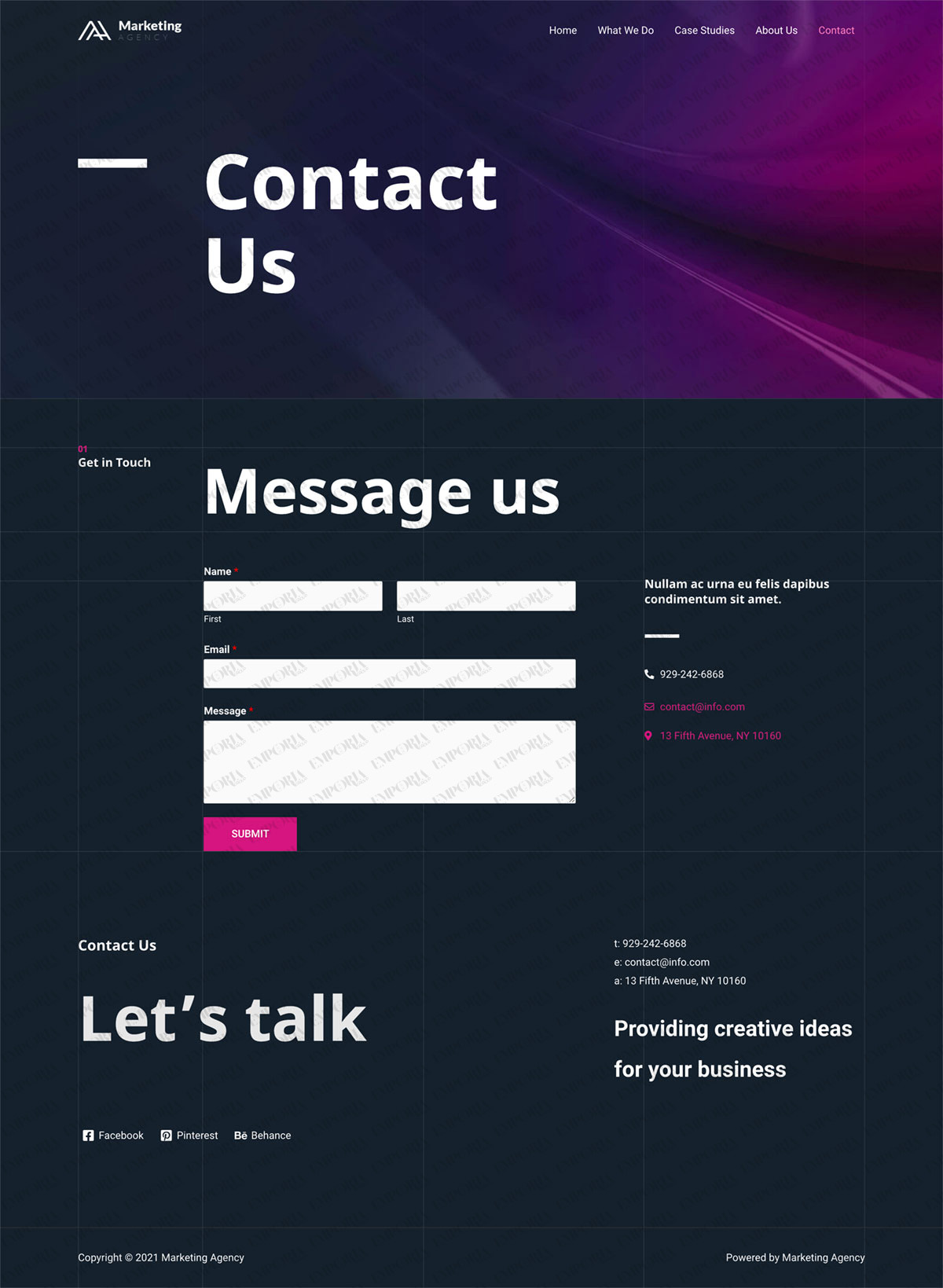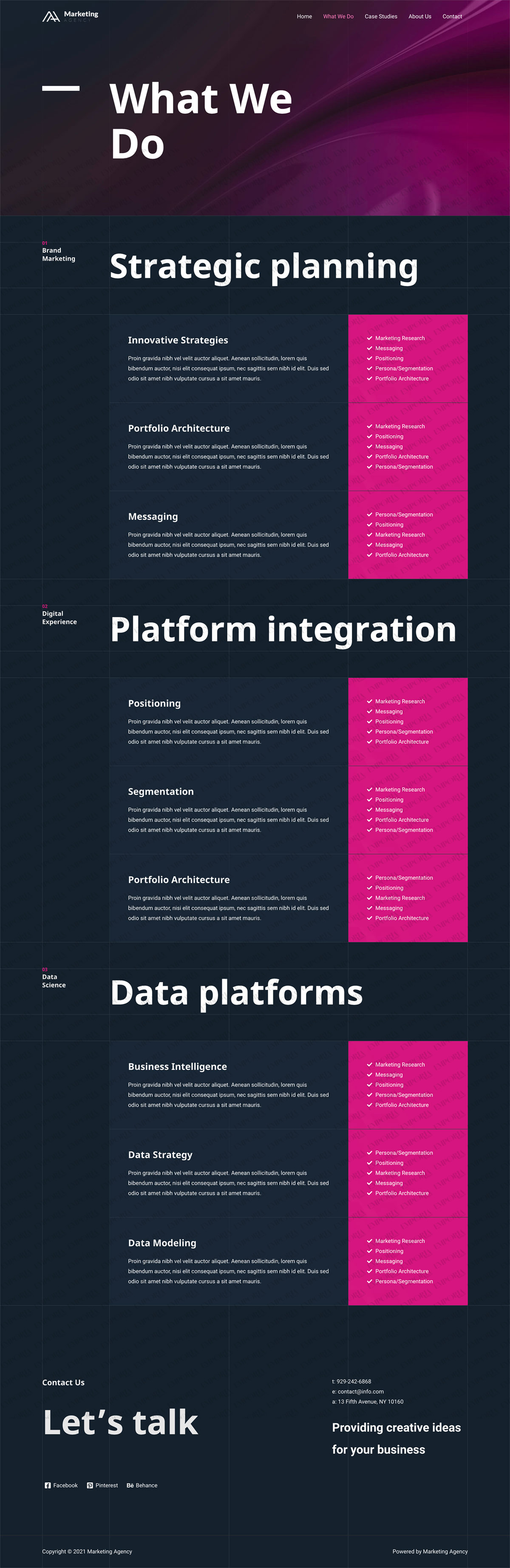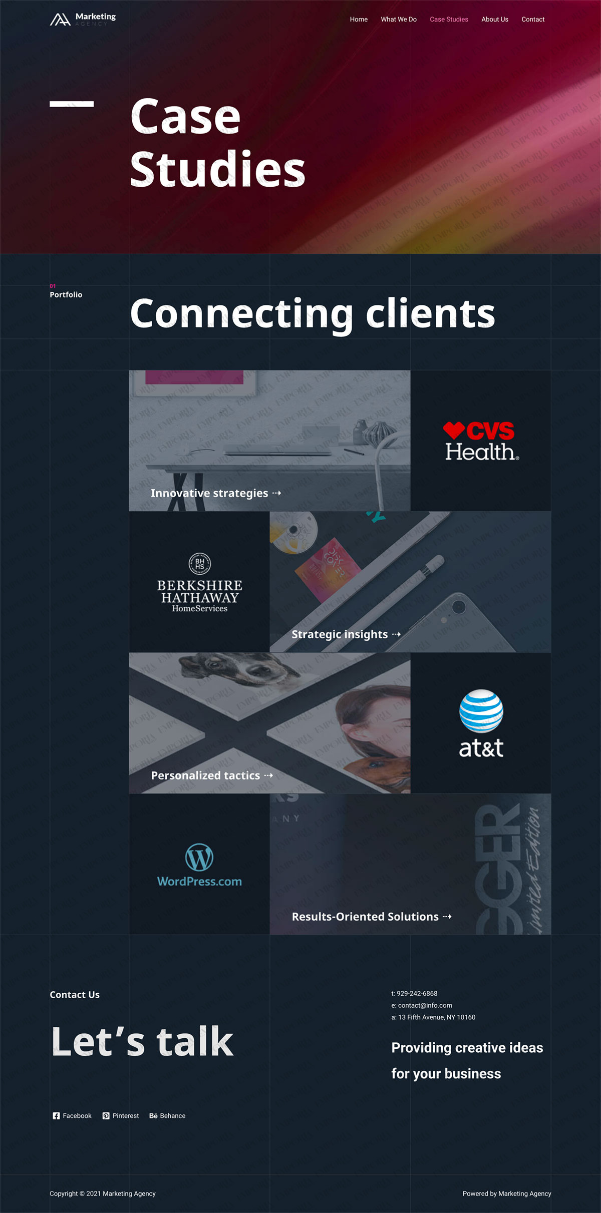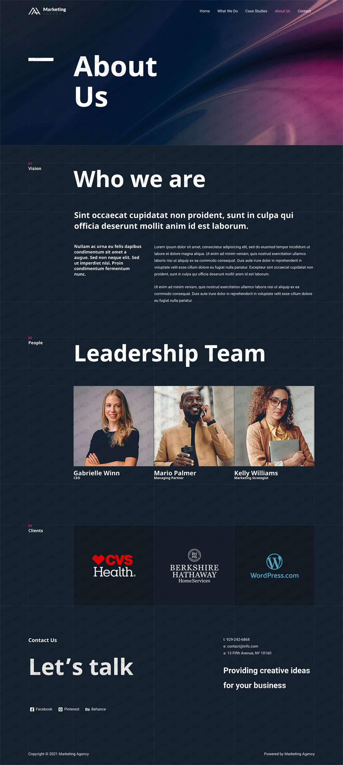 The Marketing Agency template uses dark design to great effect. It’s bold, colorful and designed to attract attention. Ideal for digital businesses, freelancers and creative agencies.