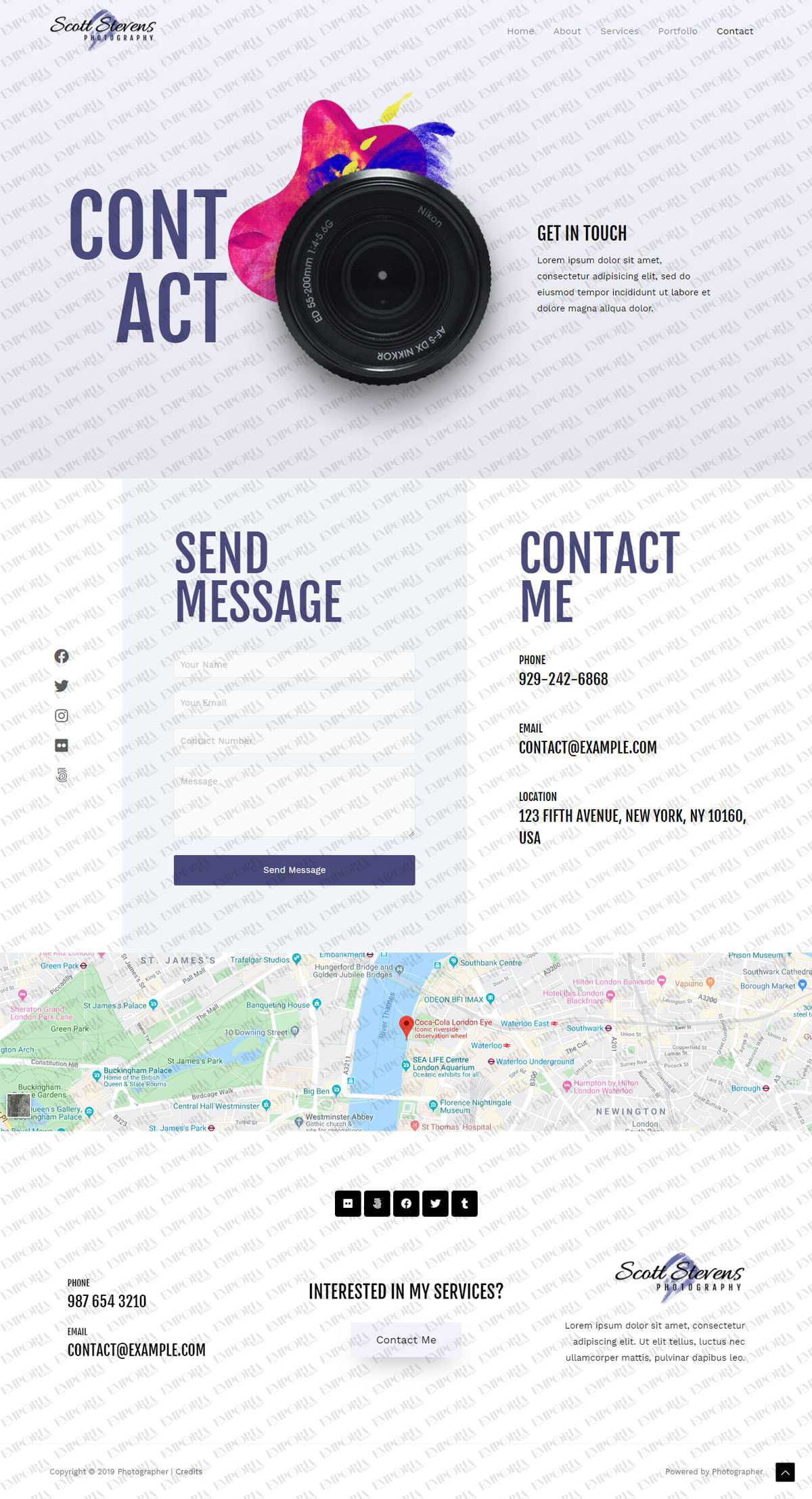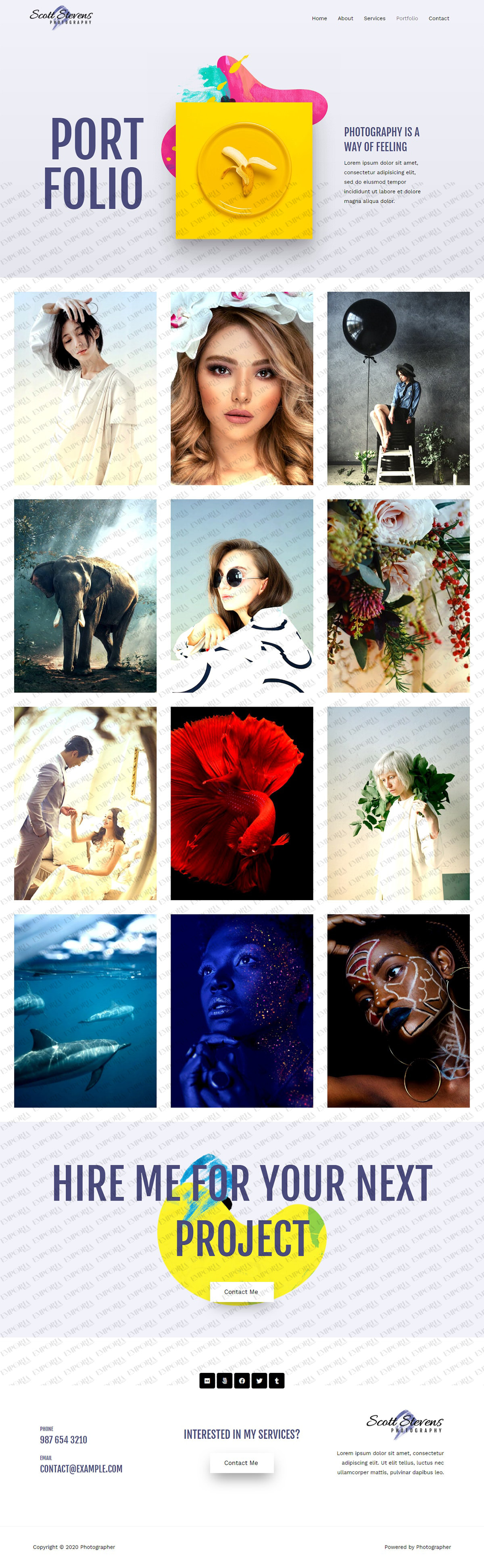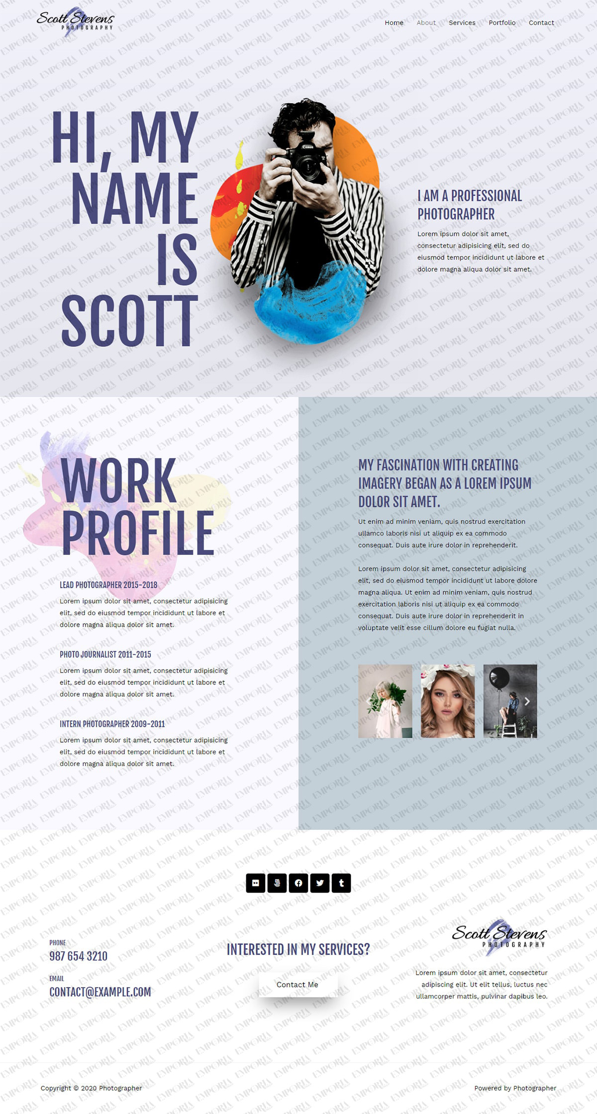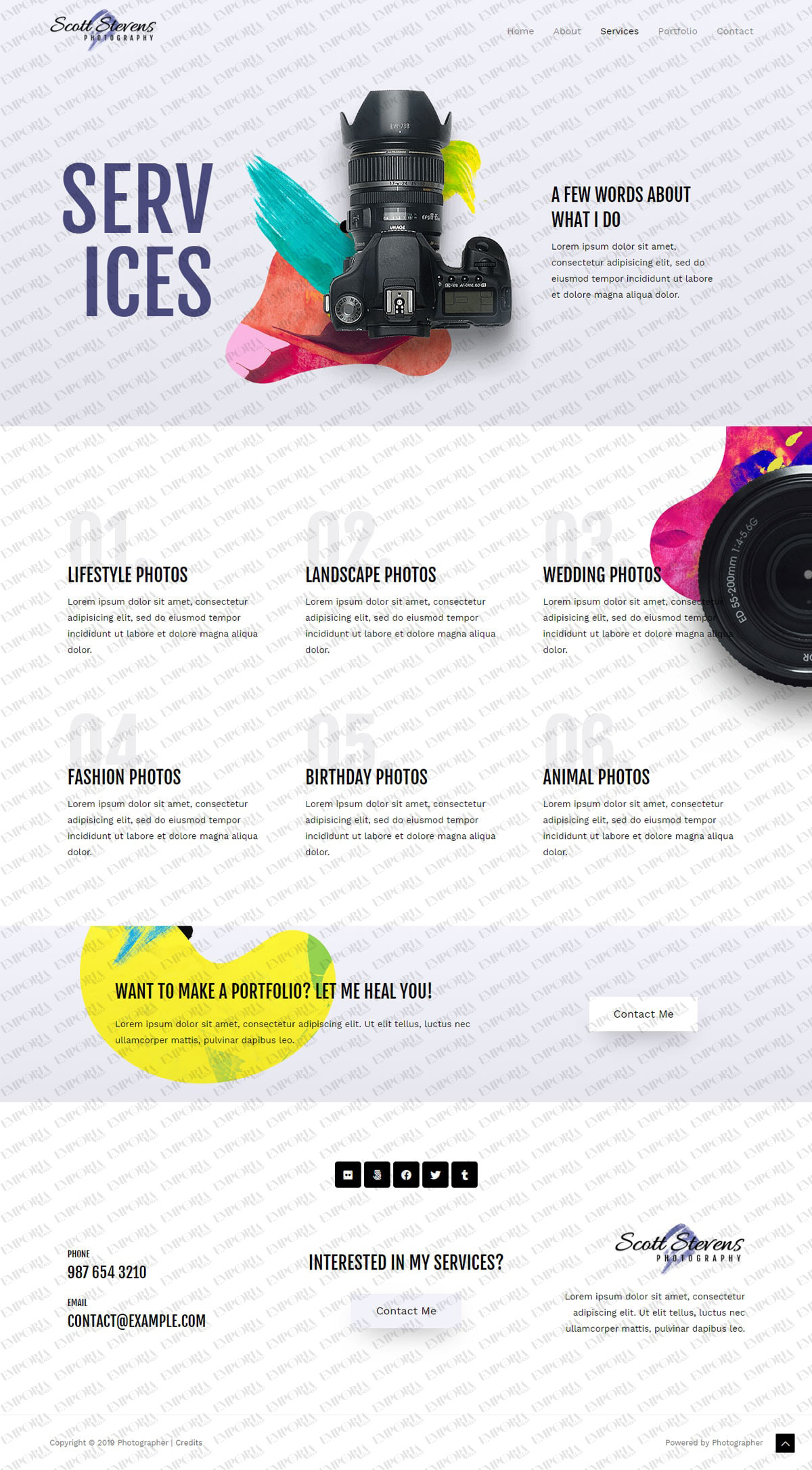 The Photographer website template opens in an exceptional way with an awesome graphic and headline. Scroll through the parallax effects to access content areas where you can tell your story and outline your products and services.