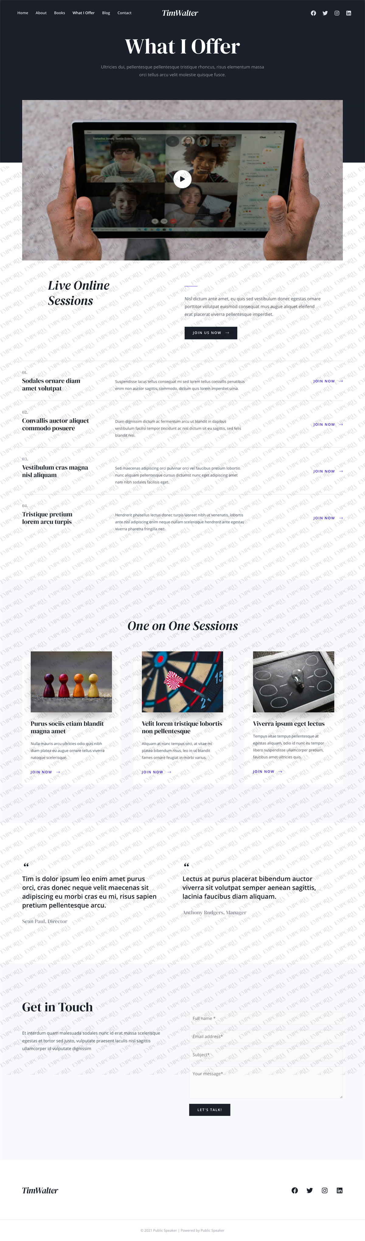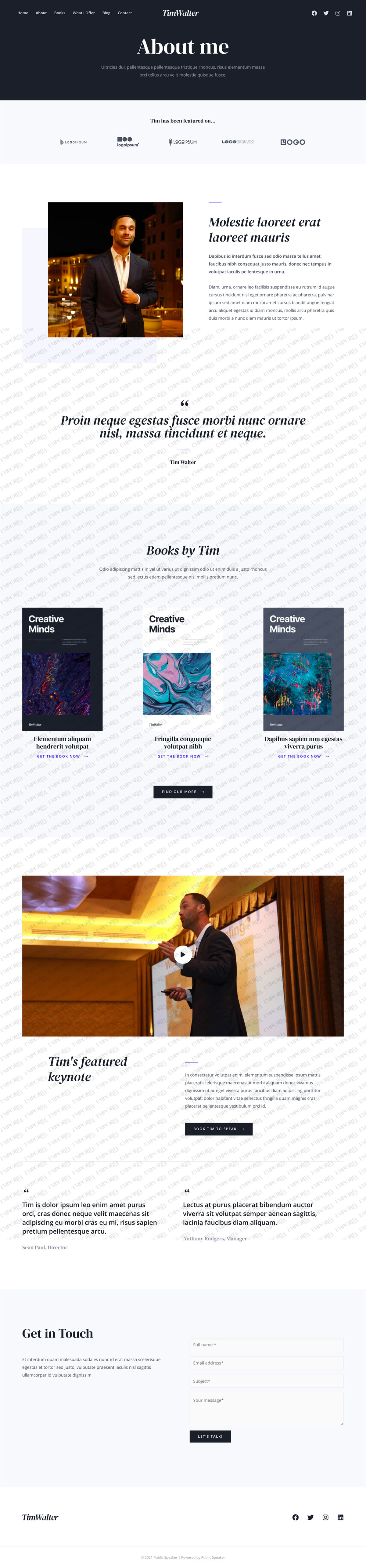Want to fill your calendar with speaking engagements? Build a website! To make it easier, we’ve crafted the Public Speaker web template. It’s a thoughtfully crafted template with everything you need to promote yourself as a professional speaker.