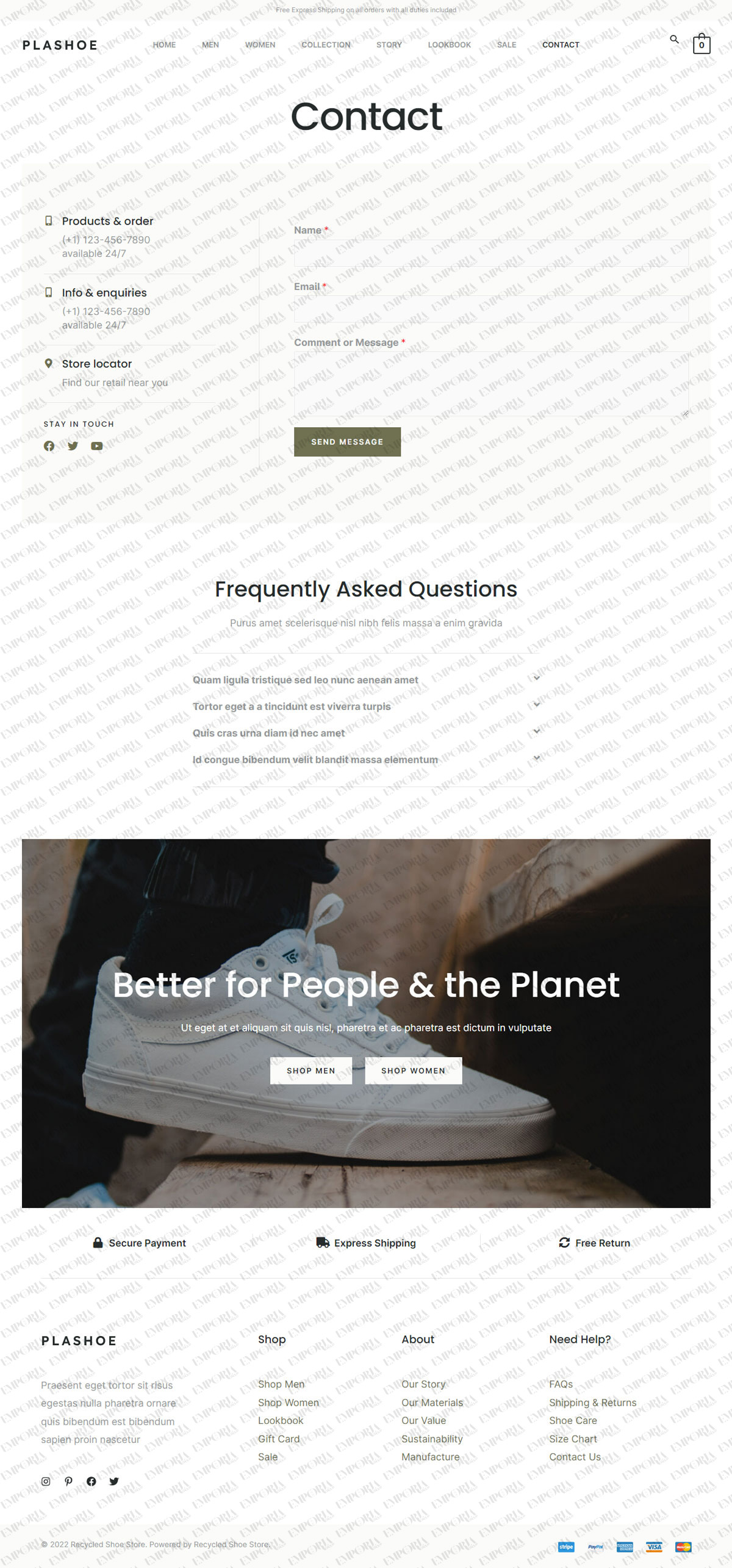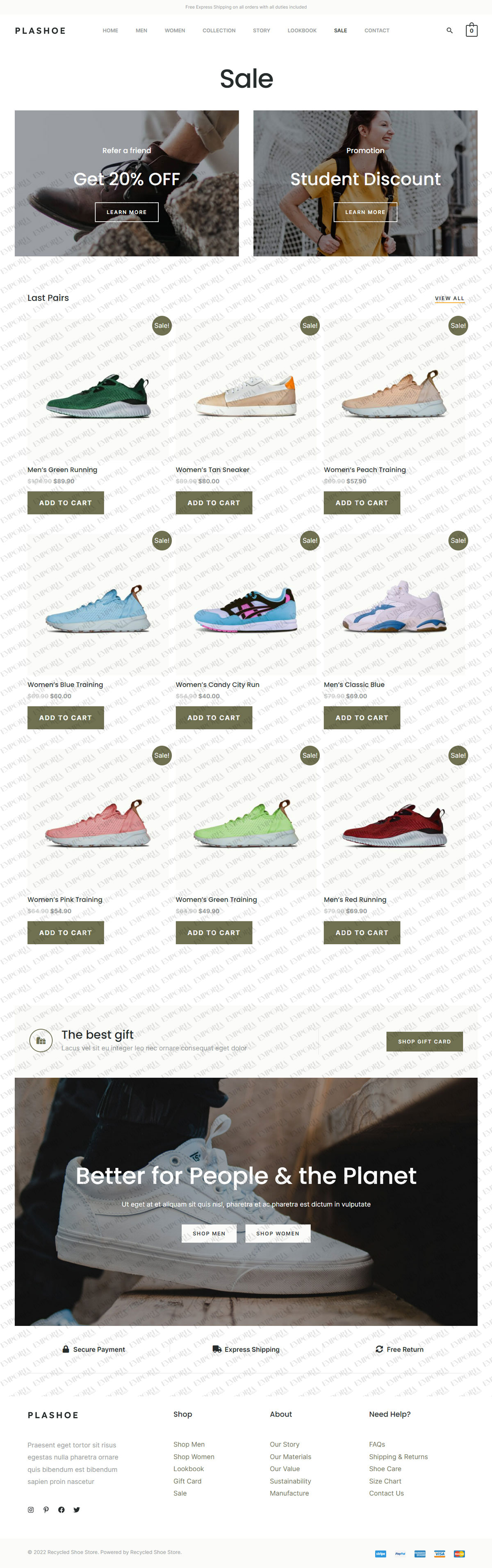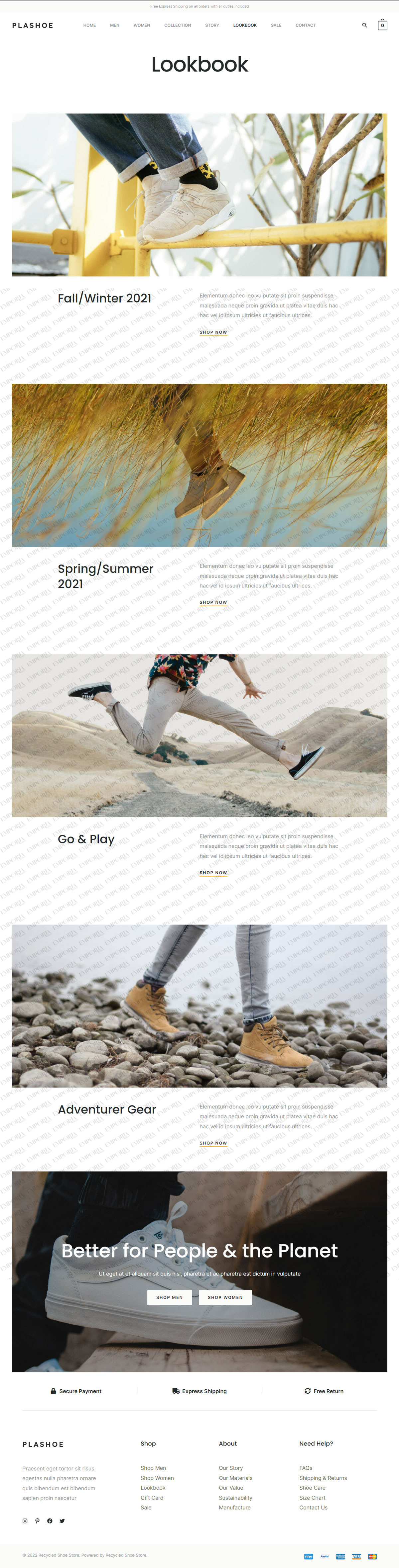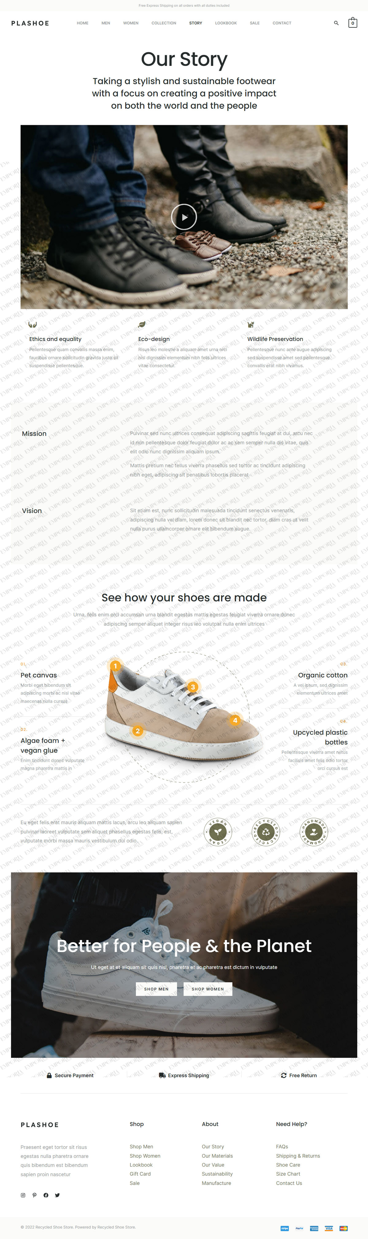 The Recycled Shoe Store template is a contemporary eCommerce design with full screen image on the homepage and lots of whitespace throughout. It’s an attractive design that could be fully customized for any type of store.
