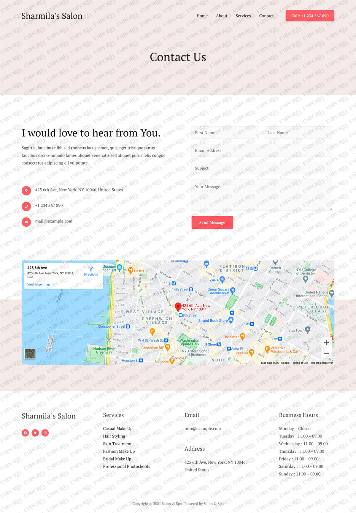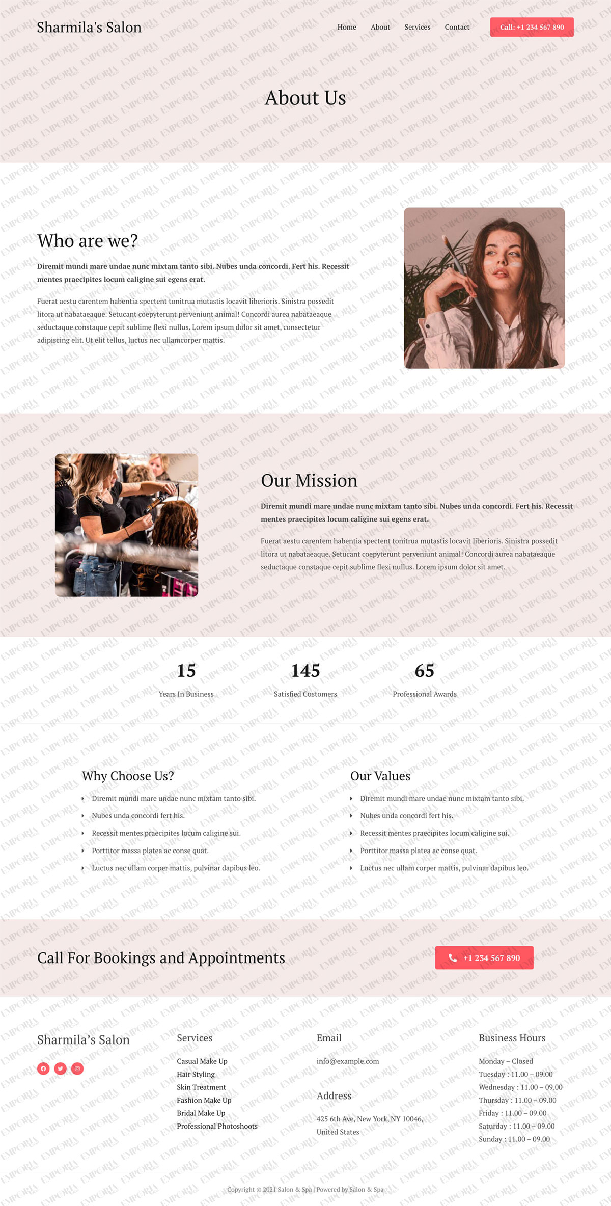 The design uses white and pastel colors with a stronger color for calls to action. Image use is plentiful, which is ideal for a visual industry like hair and beauty. There is space to showcase your products and services and an attractive contact form too.