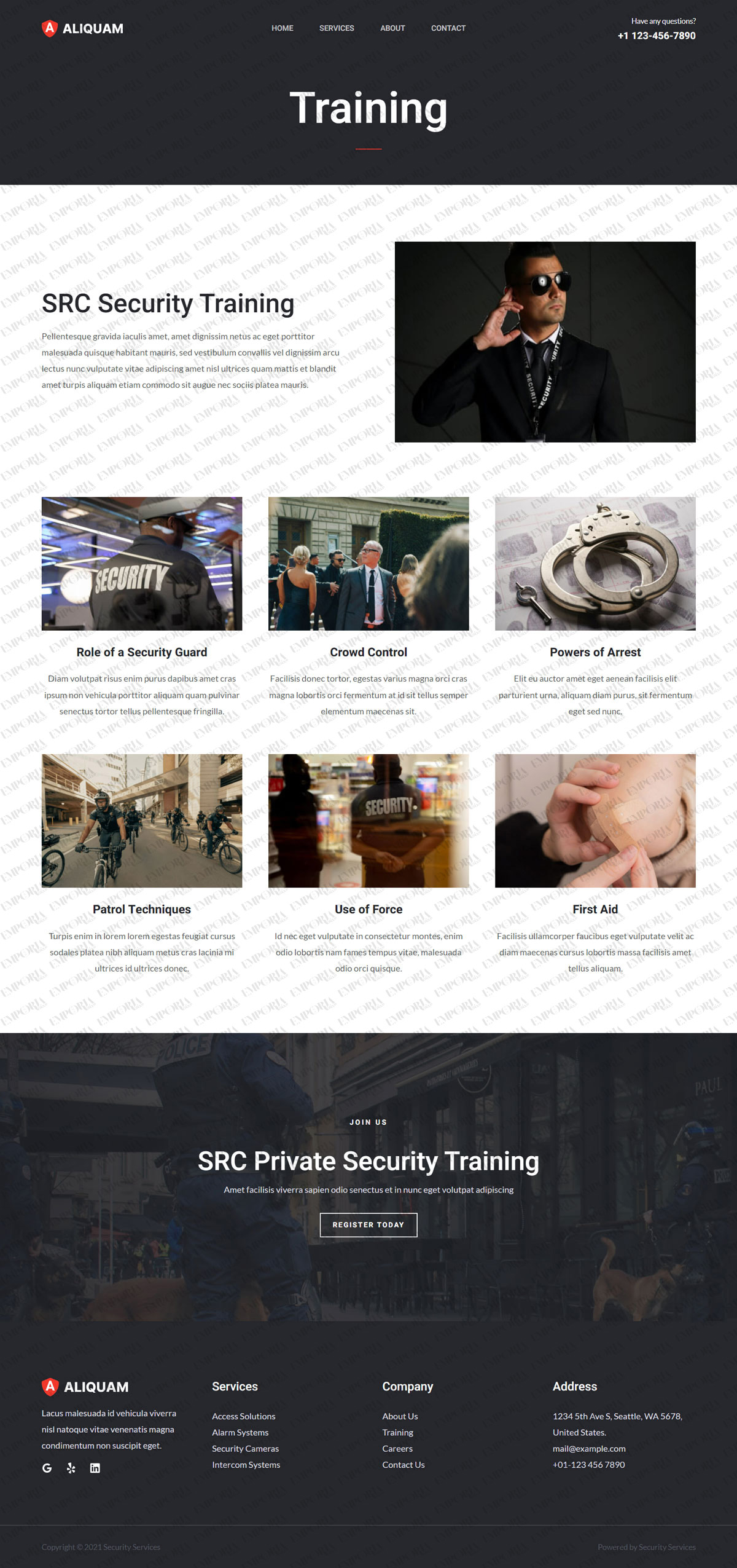Security Services is an impressive design created to portray the seriousness of the topic without being overbearing. The dark homepage image is contrasted by white fonts and a bright red color to help keep you grounded.
