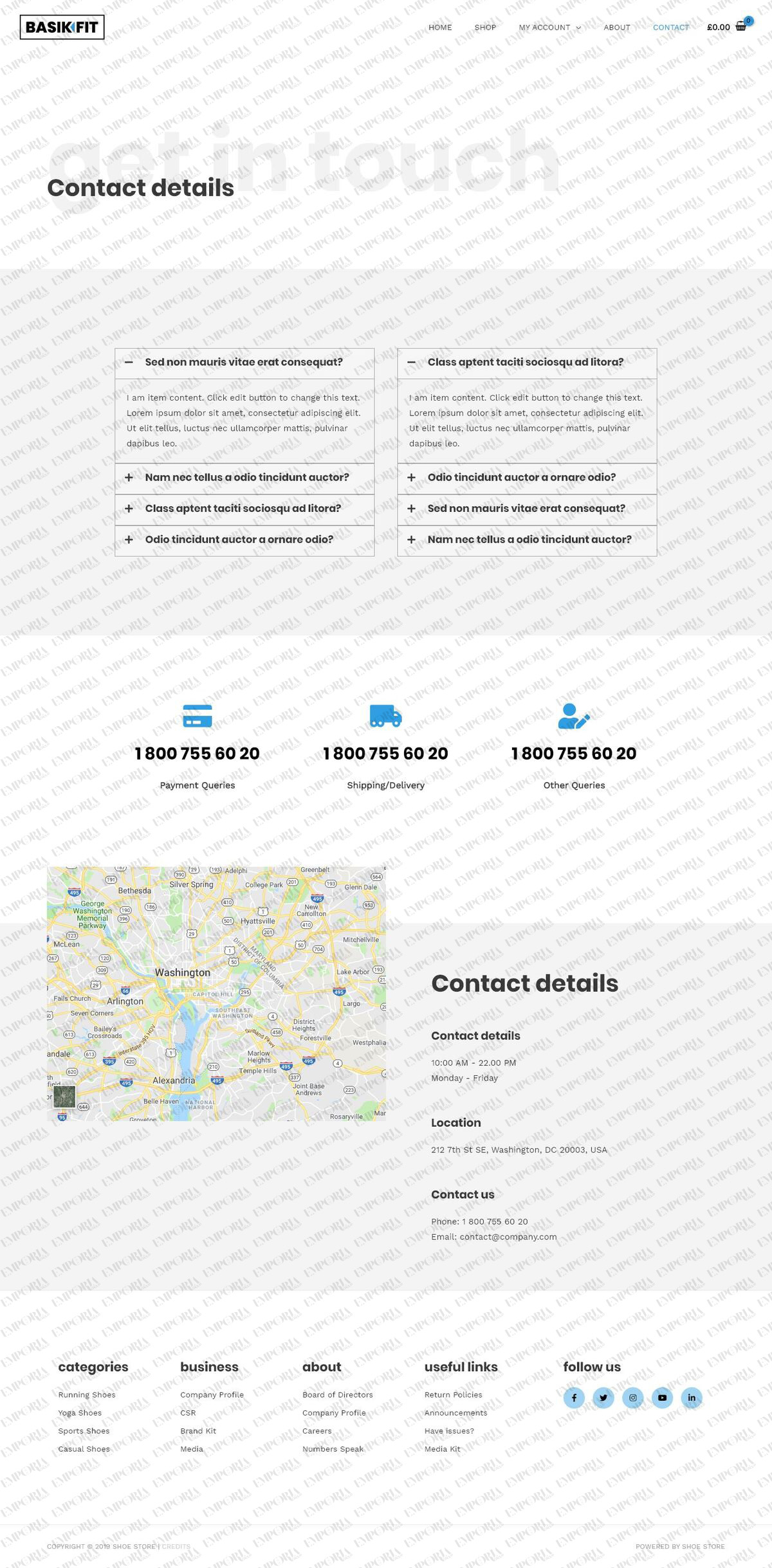 The Shoe Store template engages as soon as you open the page. It’s an eCommerce website template that sets the scene with a full screen image with graphic overlay and then unfolds into a white page with several product areas, a slider, product highlights and more.