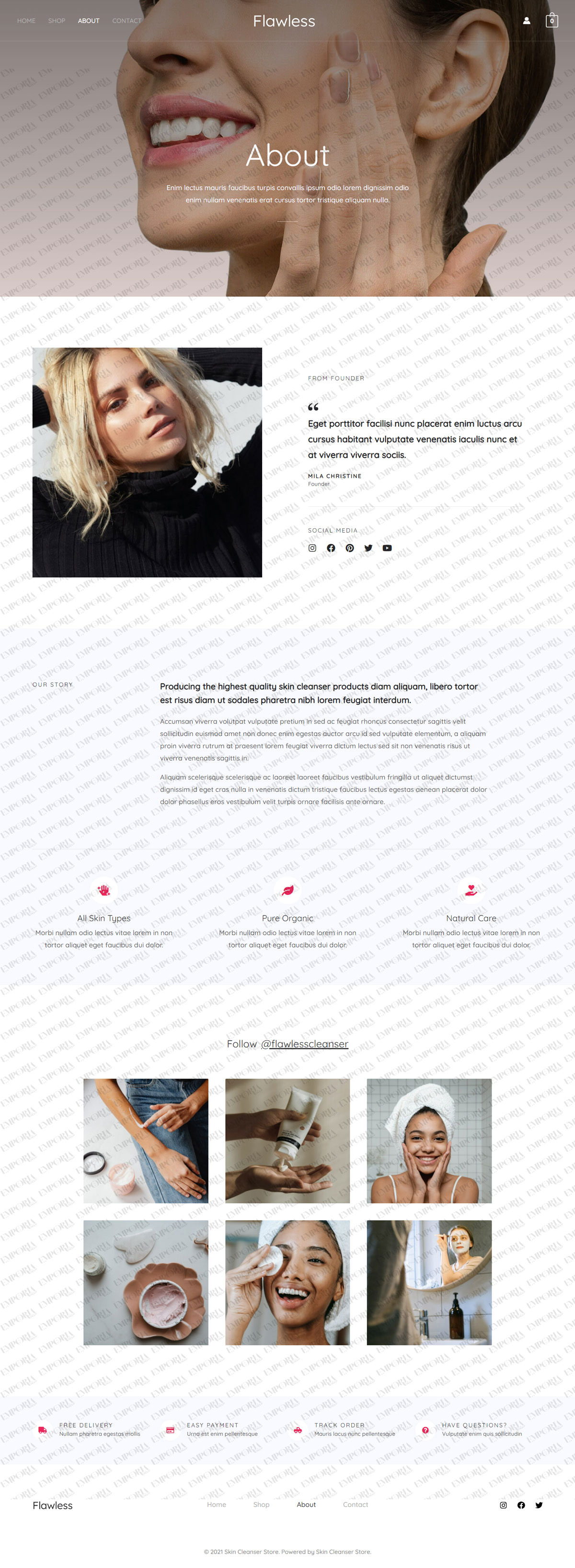 Use the impressive hero image to promote your best product. Include the latest products, best sellers, customer reviews, and beauty tips on the homepage. With seamless social media integrations, showcase photos from your social feel too.