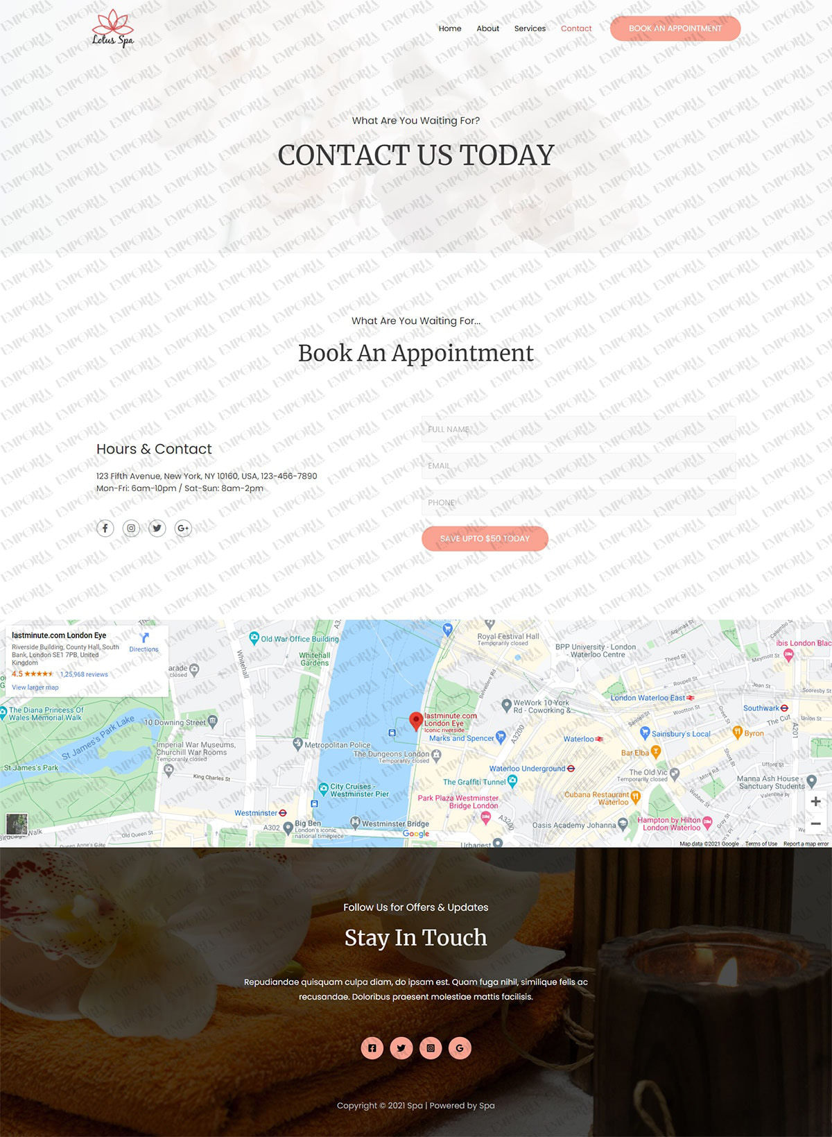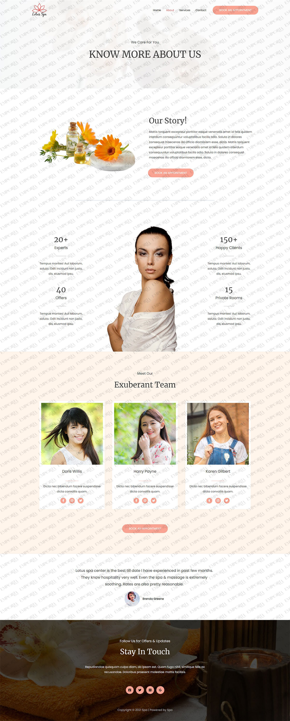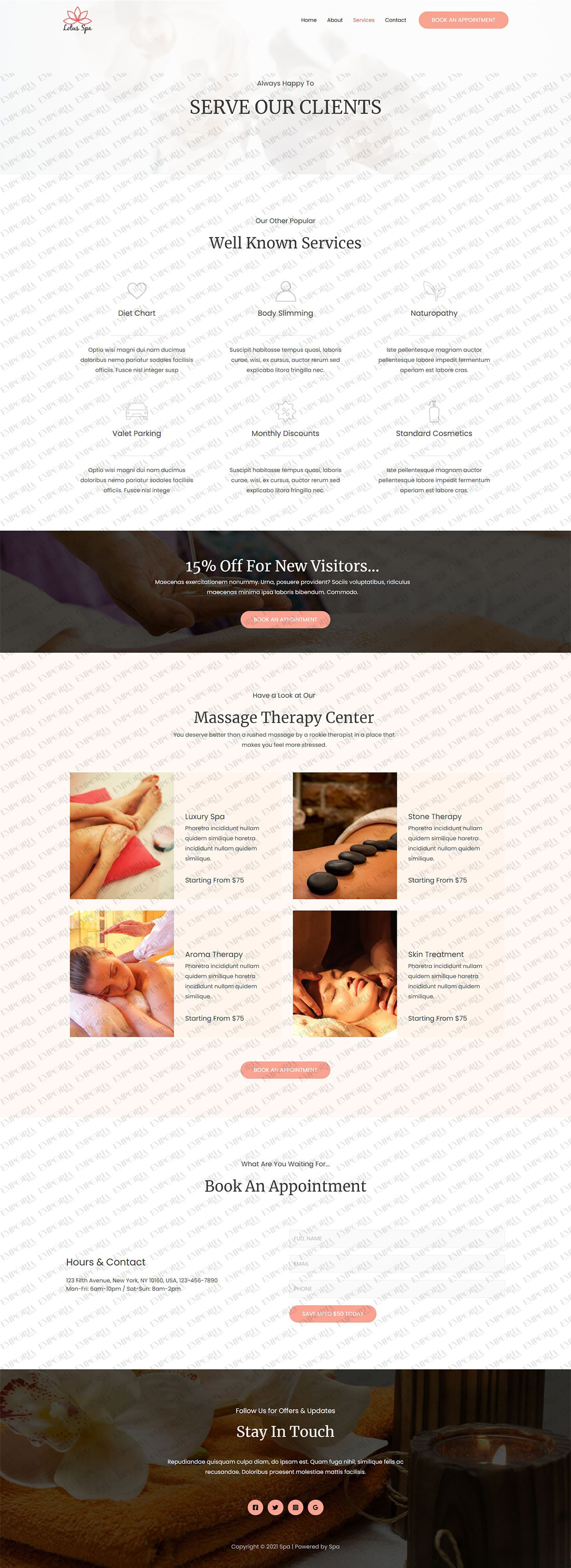 The Spa website template has a relaxed vibe ideal for the industry. It uses comfortable colors, reassuring fonts and images and helps create that caring feel the industry is well known for.