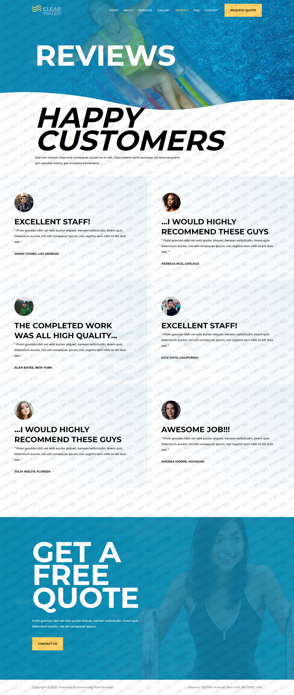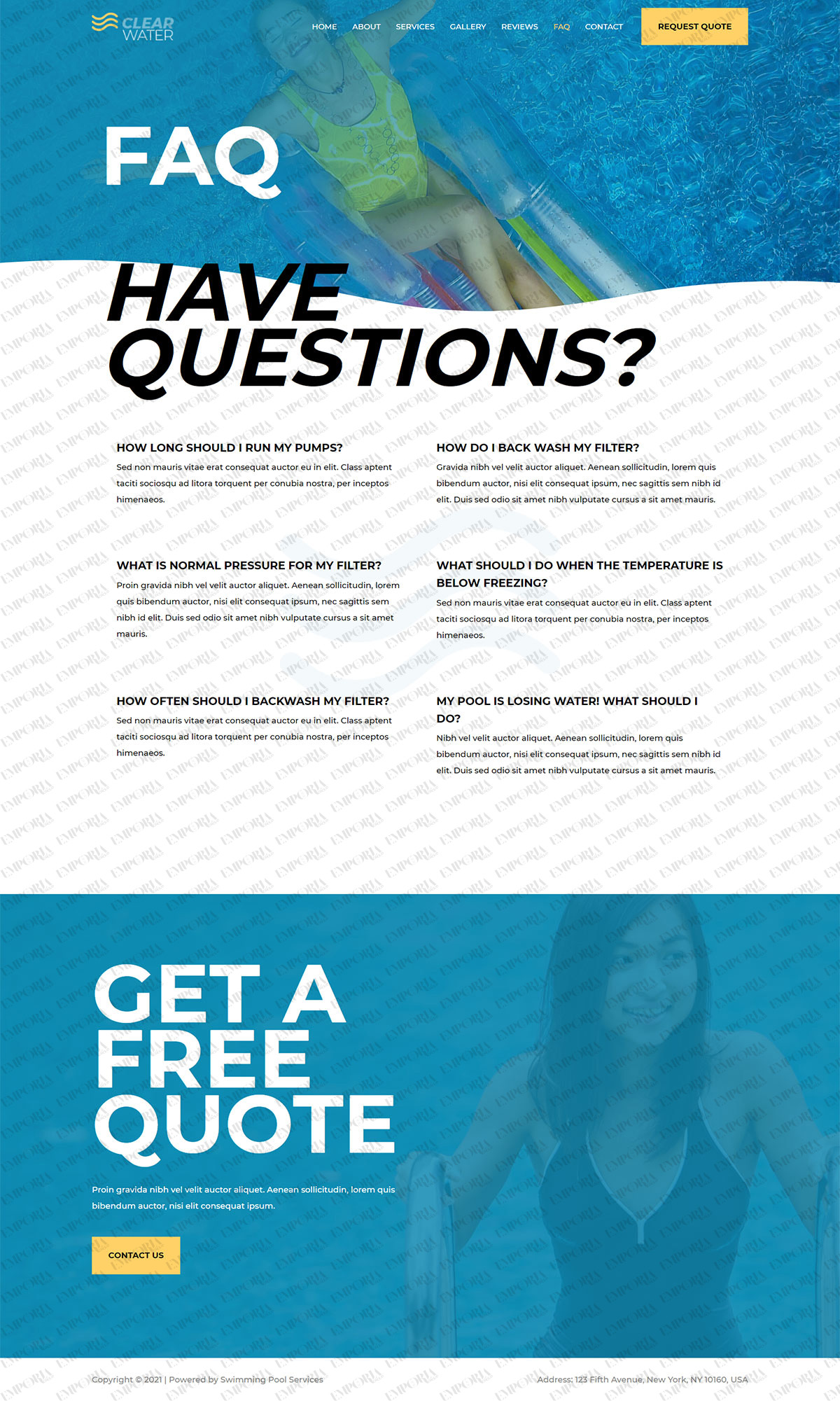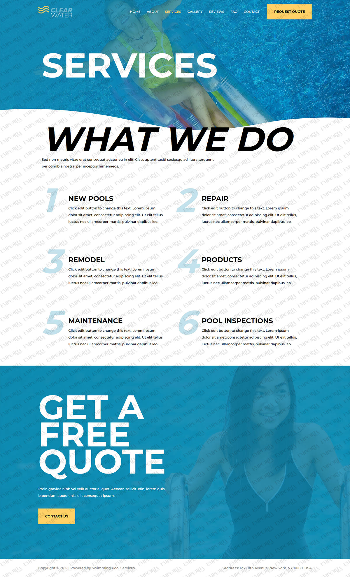 The Swimming Pool Services template begins strongly with a full size image of a pool with an engaging blue and white colorway. A bold contrast color works well for calls to action while alternating dark and light fonts keep you scrolling.