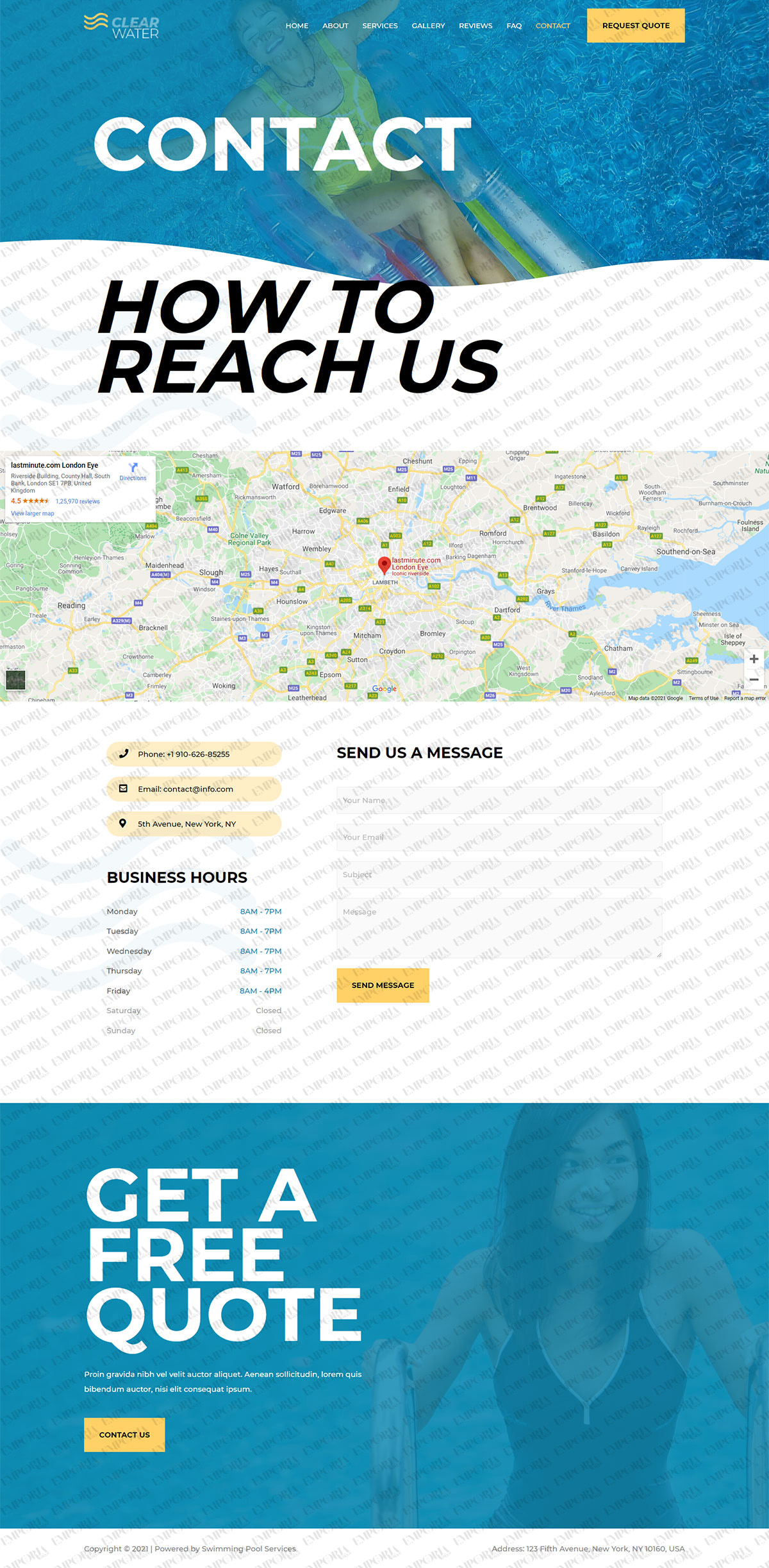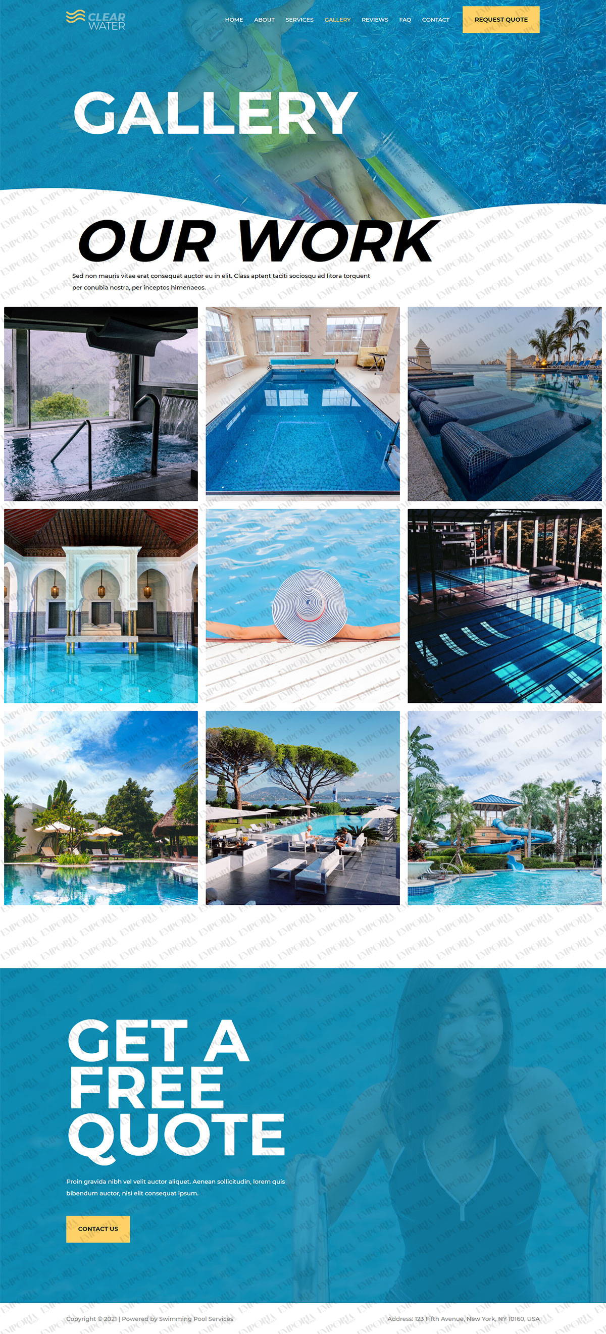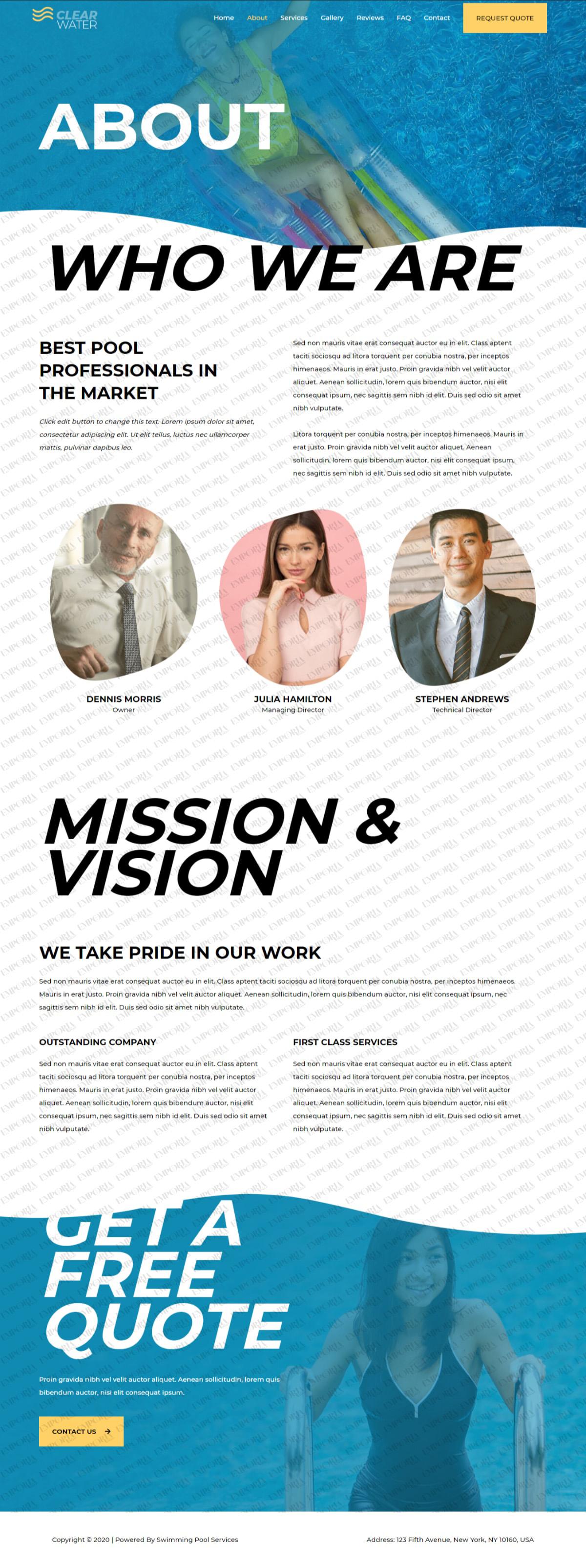 The Swimming Pool Services template begins strongly with a full size image of a pool with an engaging blue and white colorway. A bold contrast color works well for calls to action while alternating dark and light fonts keep you scrolling.