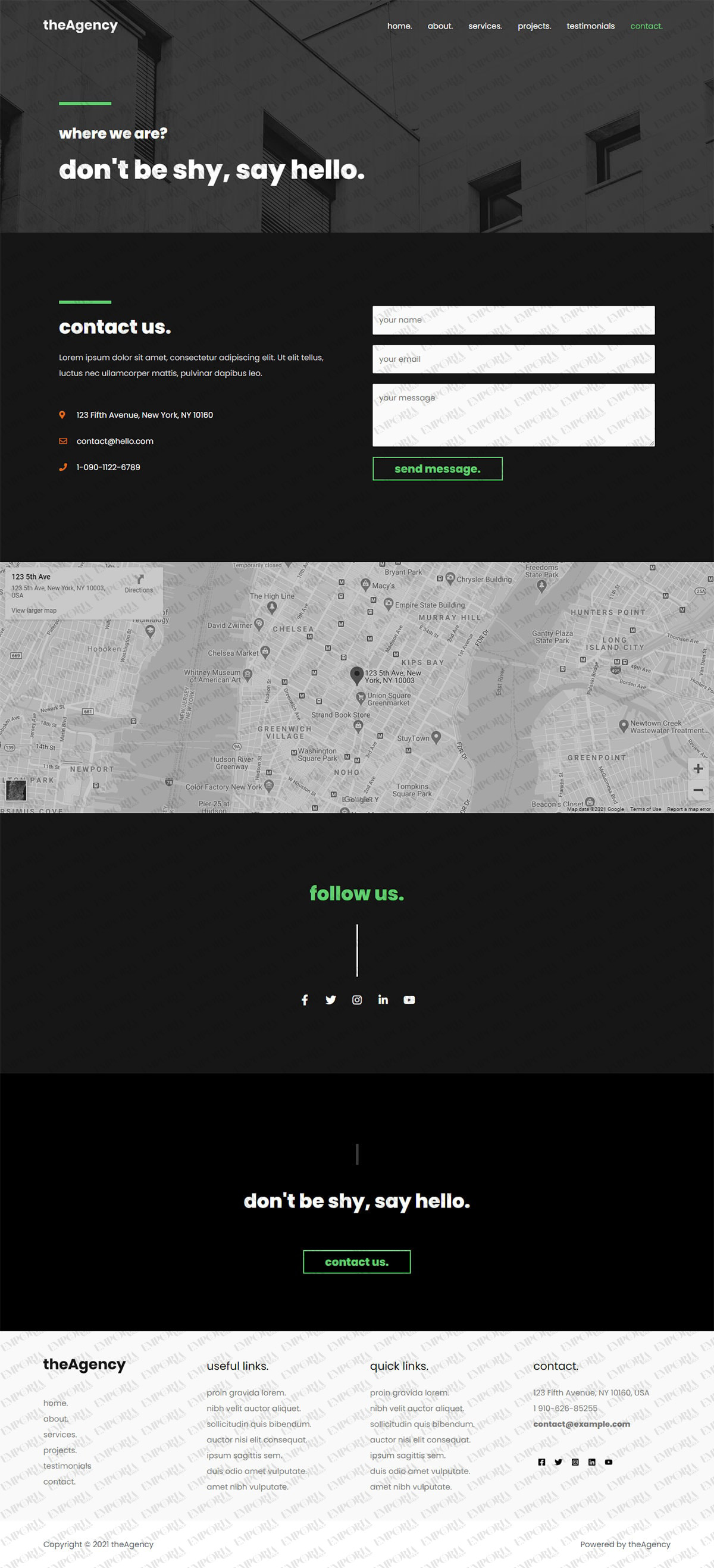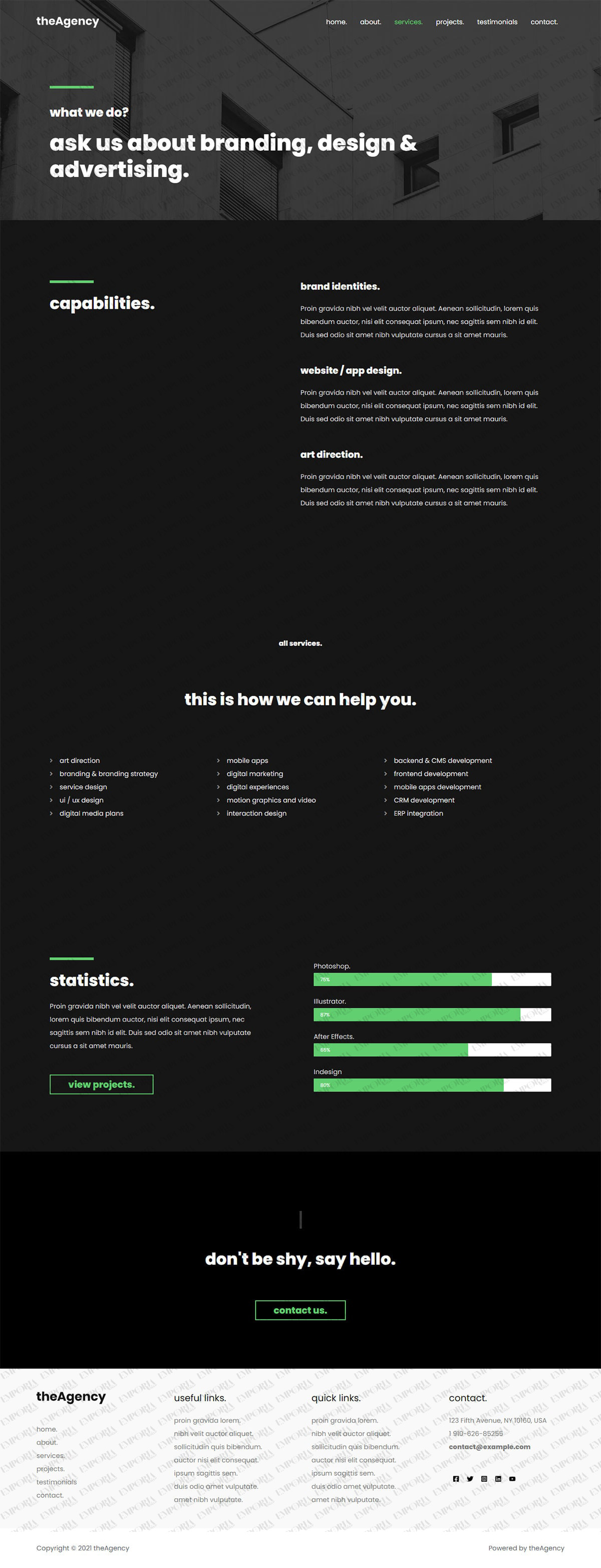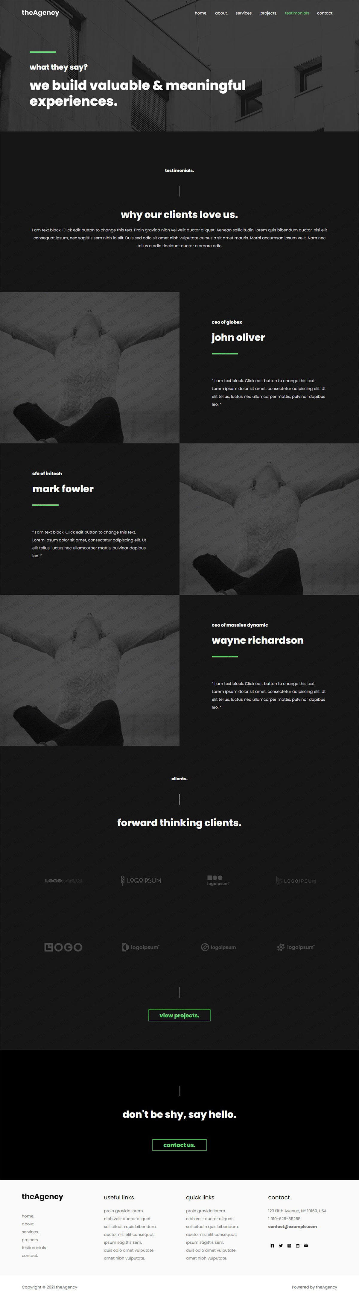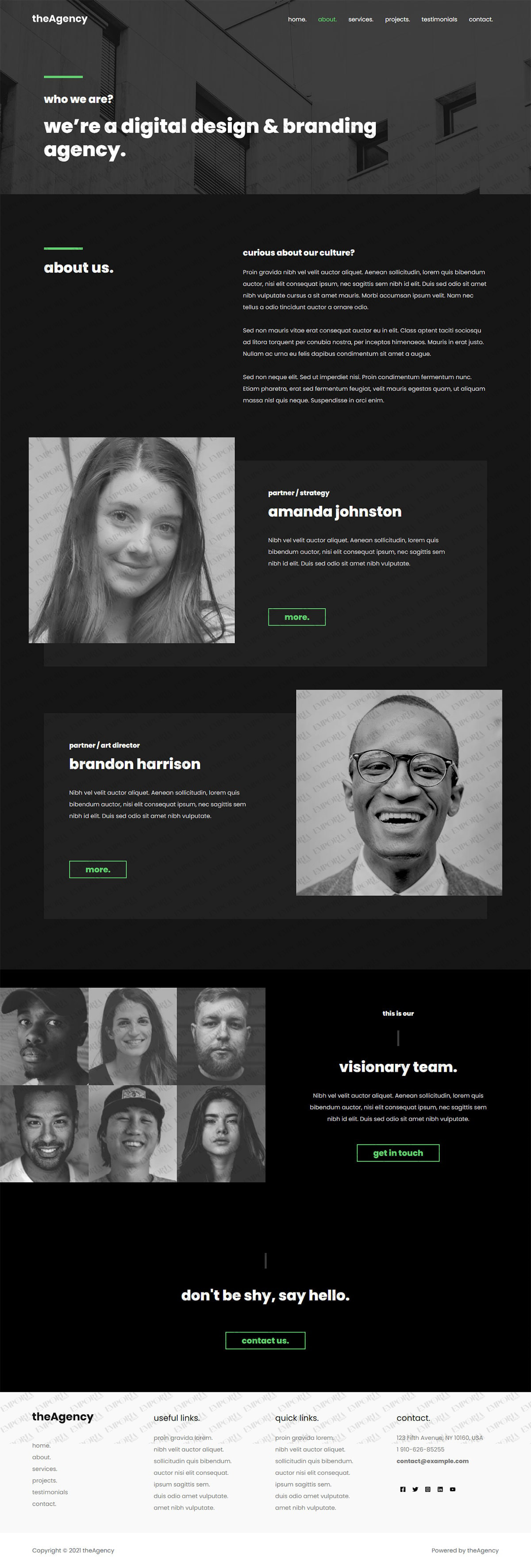 theAgency template is a modern dark theme that reflects the cutting-edge nature of many digital agencies. It uses a simple shaded image to great effect along with sans serif fonts and a green colorway to add interest.