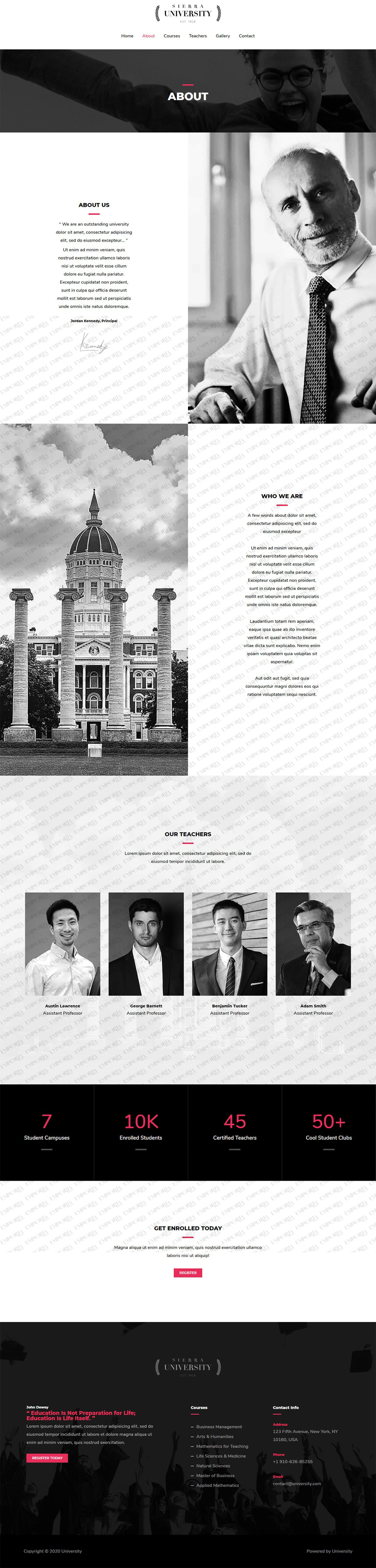 The University template opens with an emotive success image that sets the scene. Combined with a central menu and simple header, it achieves a lot with very little. The homepage is largely grayscale but uses color for graphics buttons and images to help them stand out.
