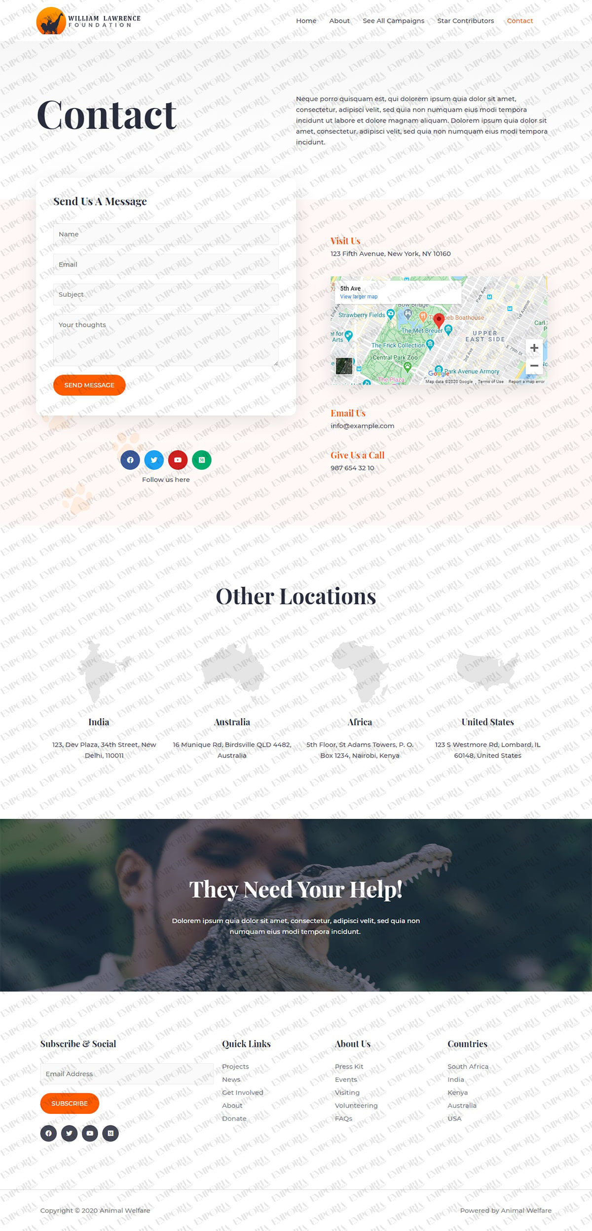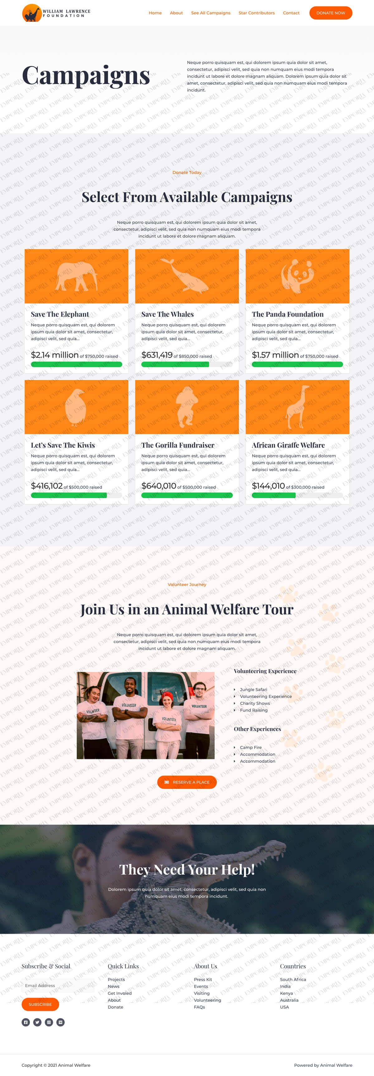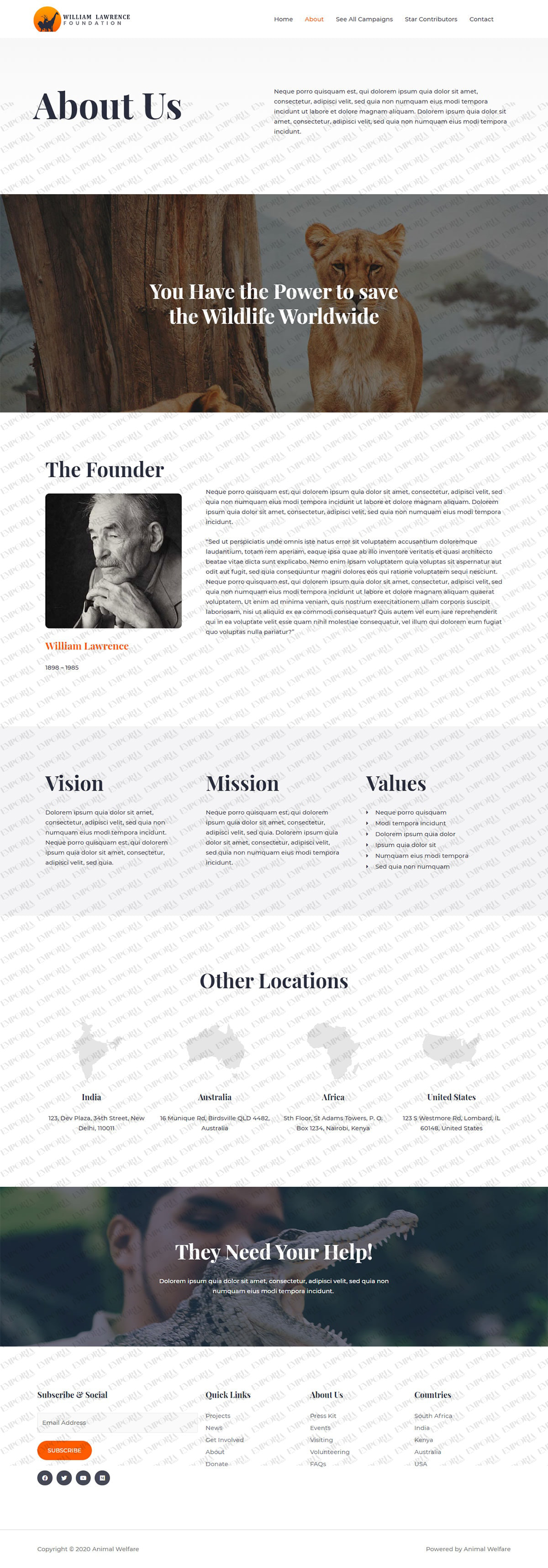 The Animal Welfare template uses a bold full screen shaded image and contrasting colors to make an impact. The image sets the scene perfectly while the white and orange fonts ensure your message is heard loud and clear.