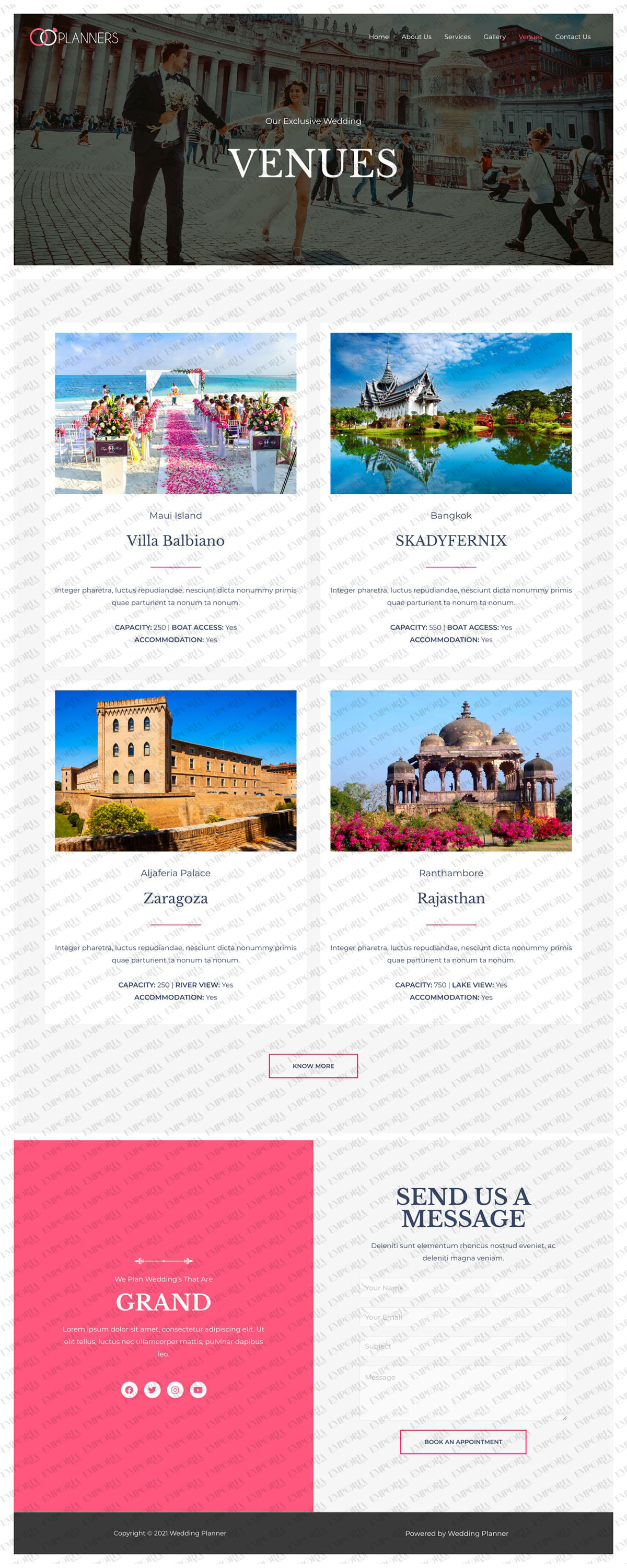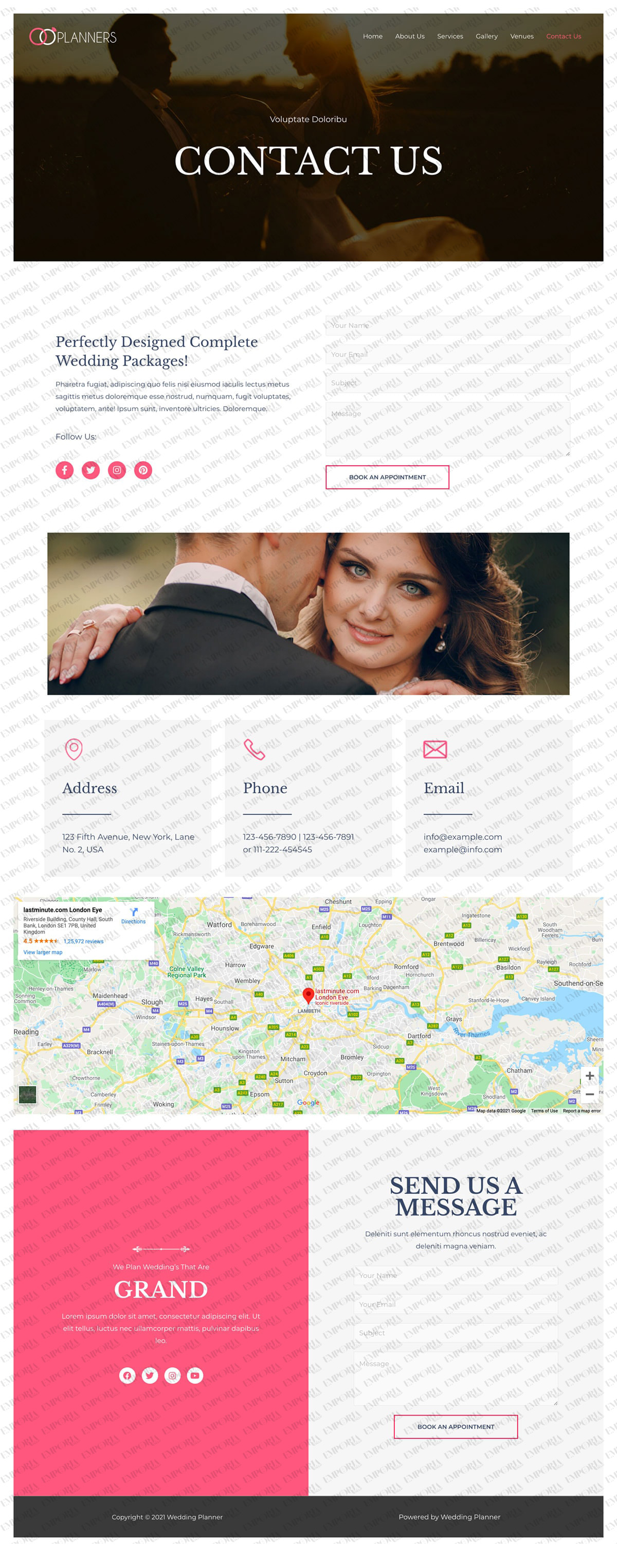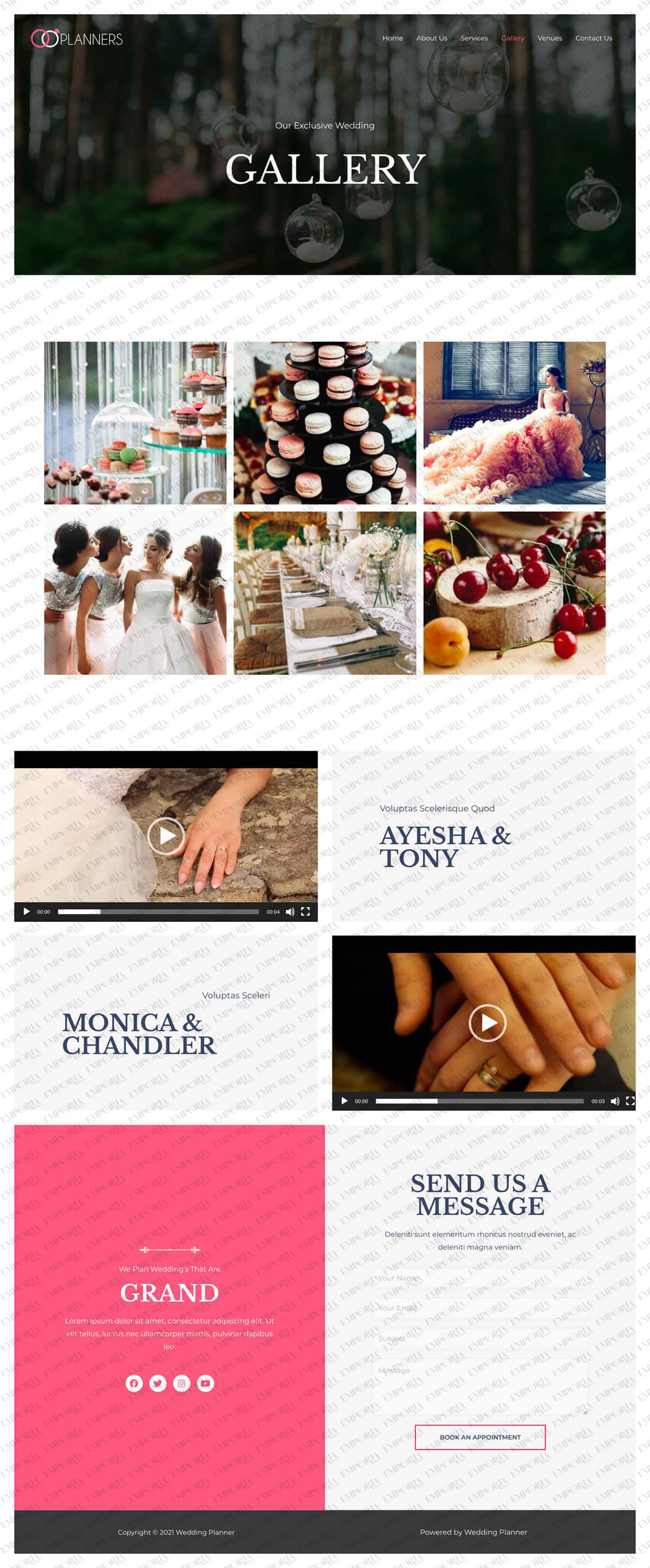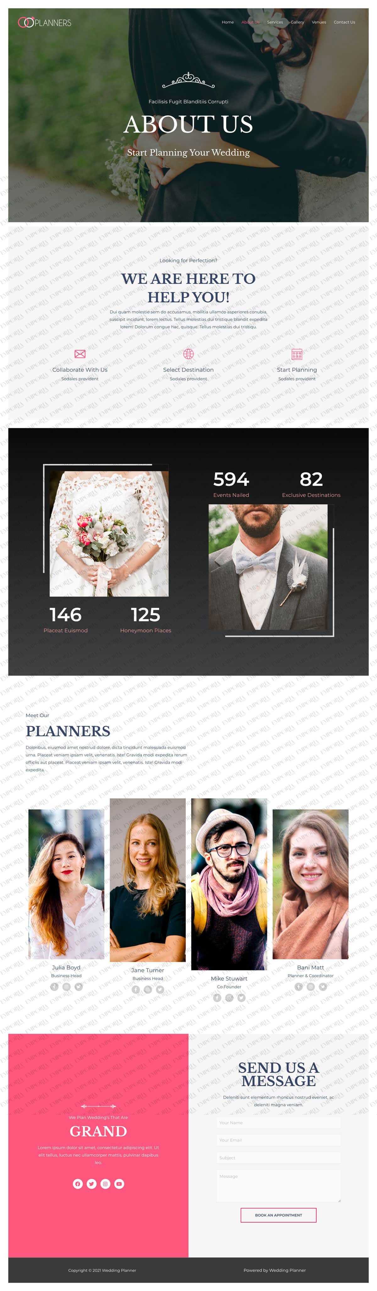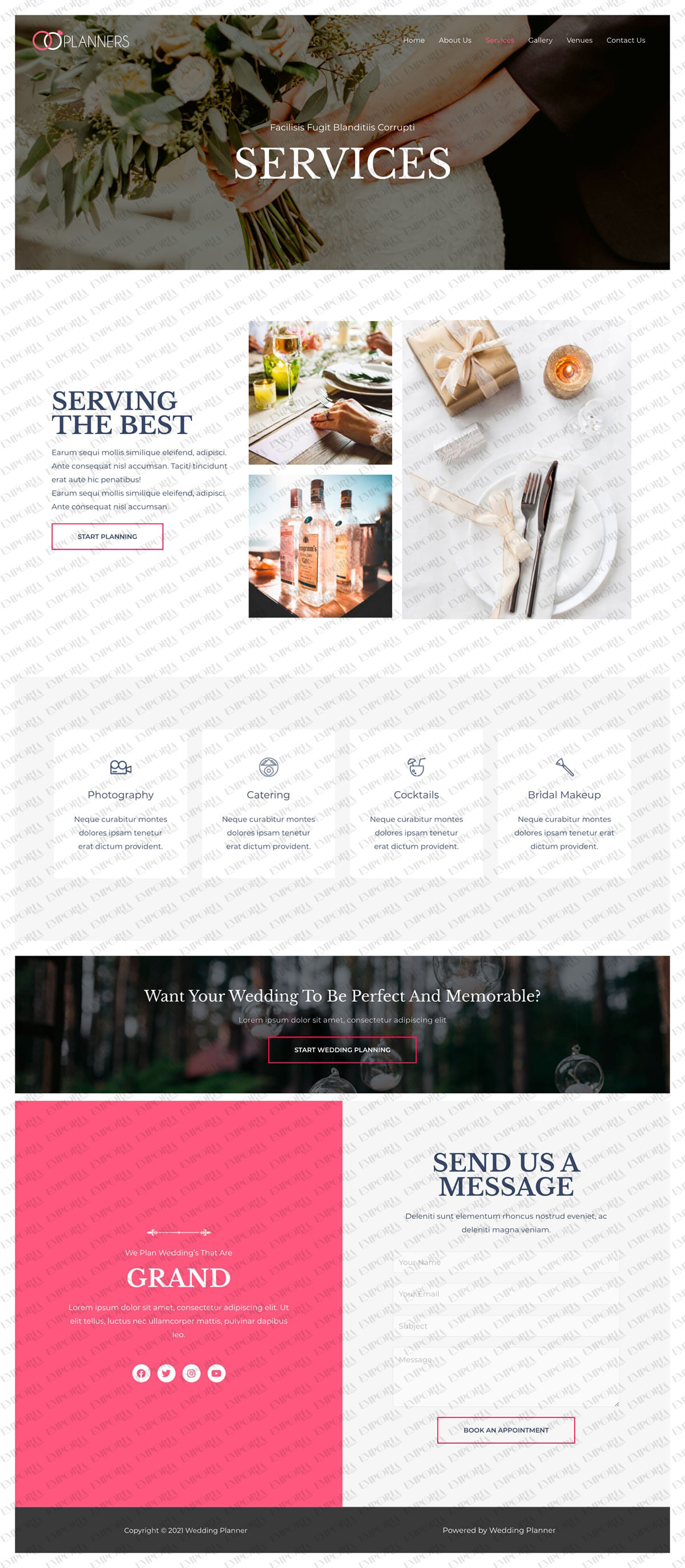 The template includes well balanced pages with flexible content areas to show your products and services, showcase previous weddings you planned, include testimonials and all those things we expect from a website like this. With a built-in portfolio, attractive contact page and that composed look, this template is a real winner!