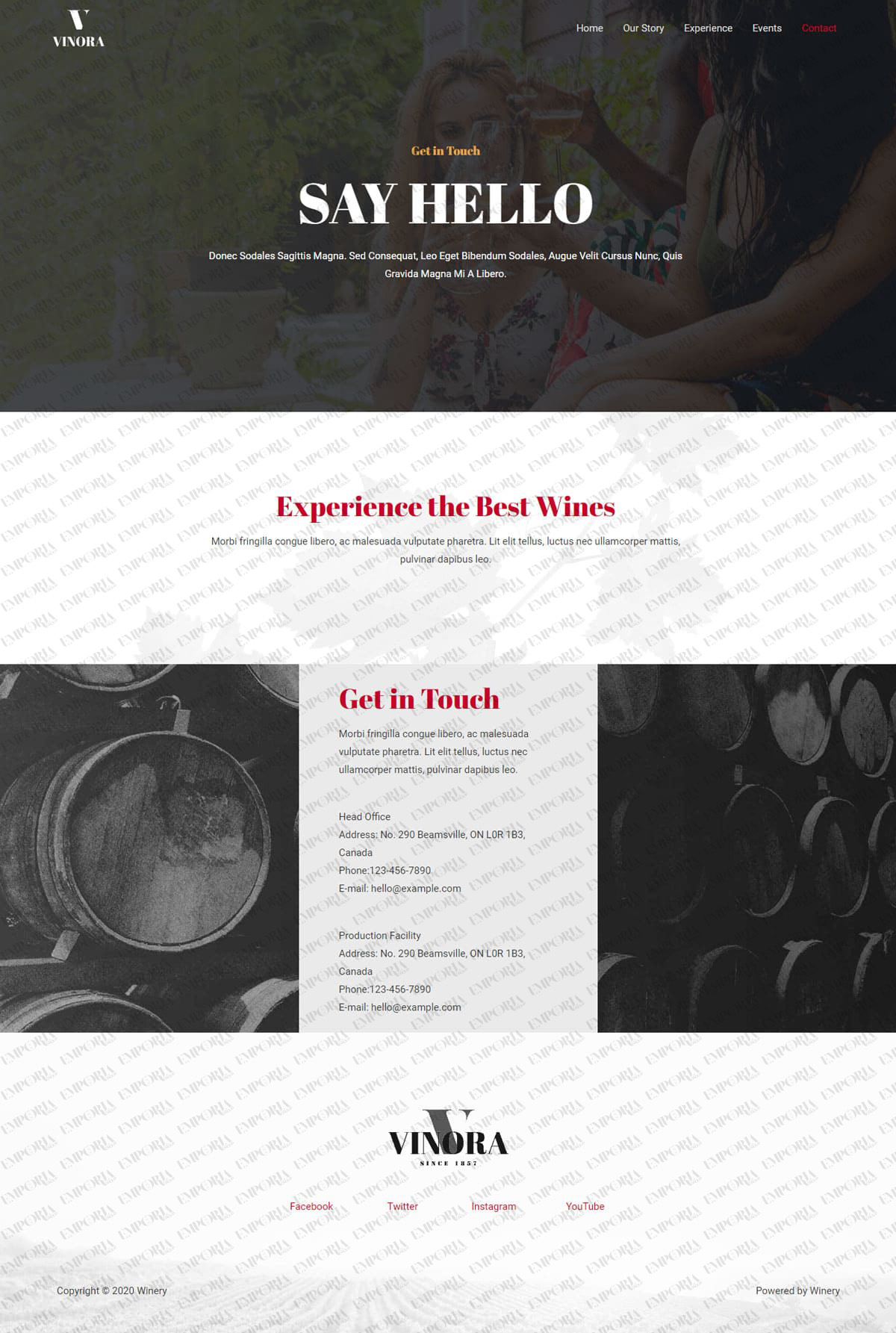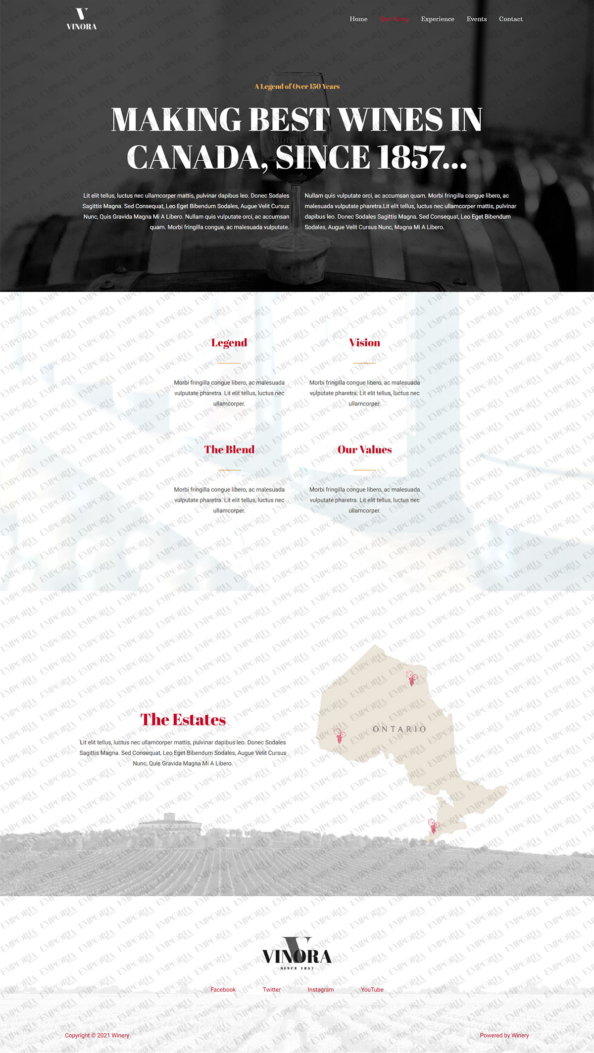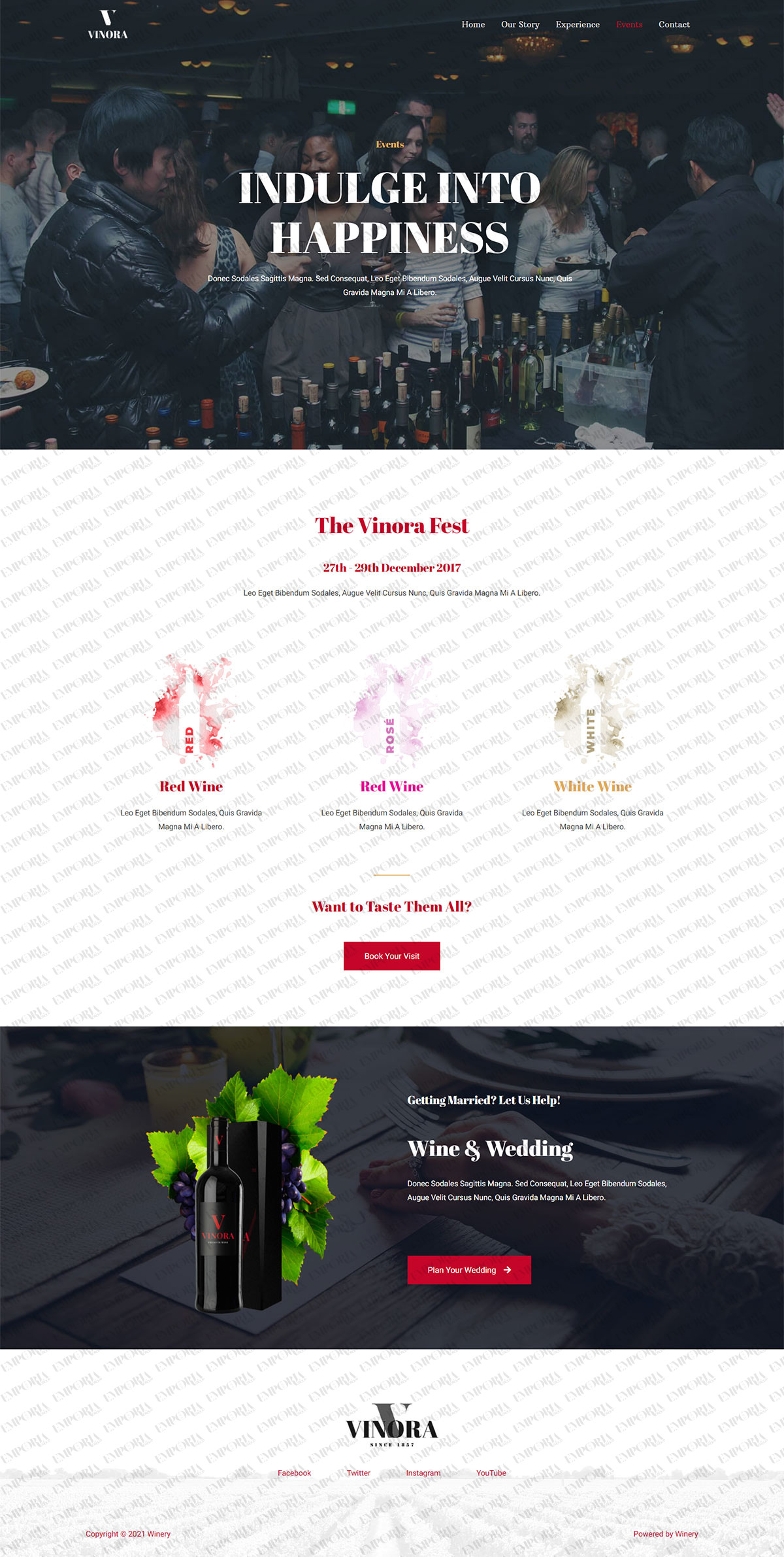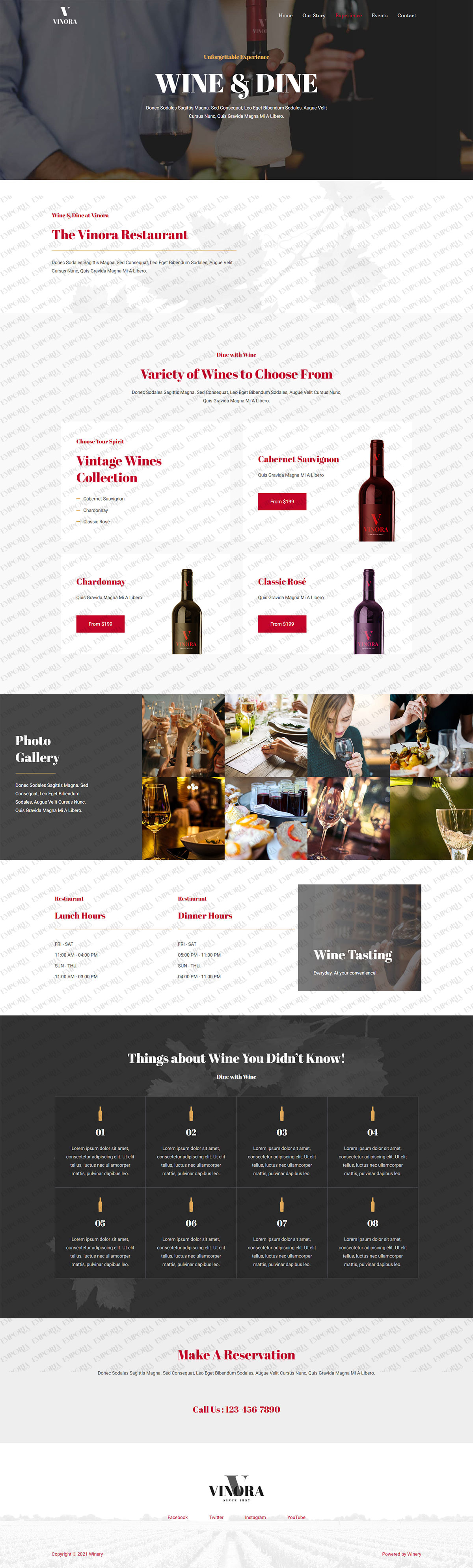 The Winery template makes its case immediately with a high quality image in the header. The rest of the homepage combines dark, light and a red contrast color to create that feeling of luxury you’re looking for.