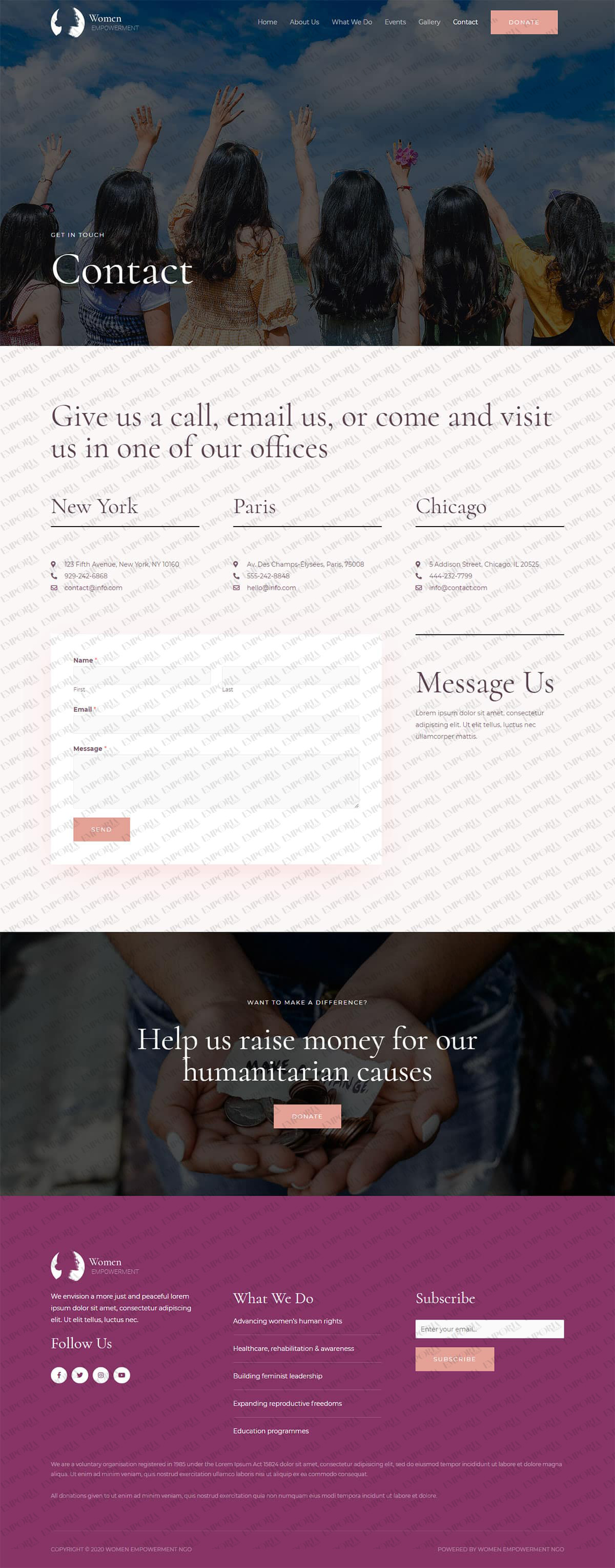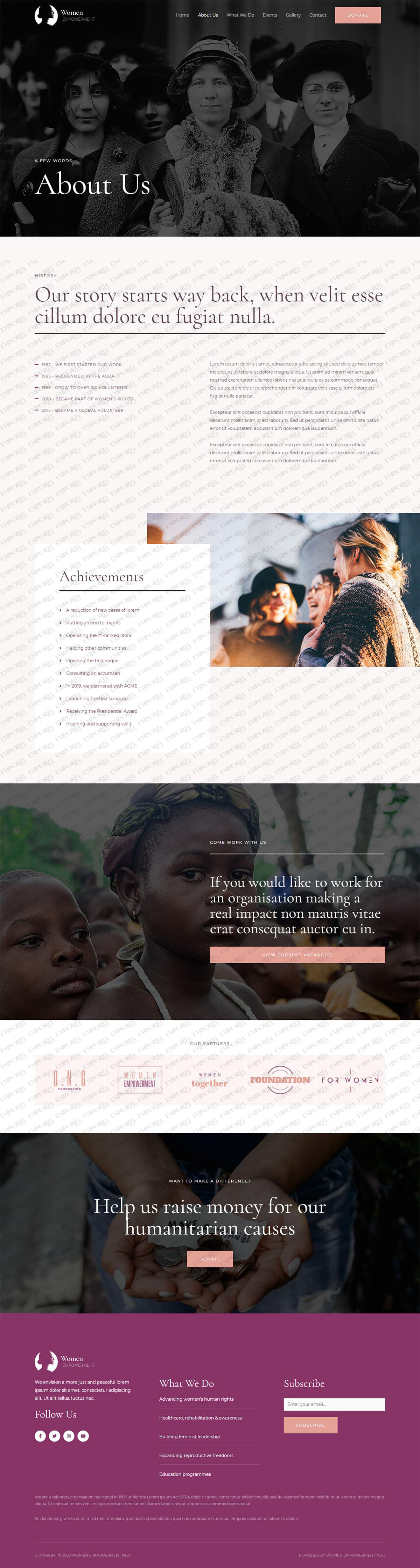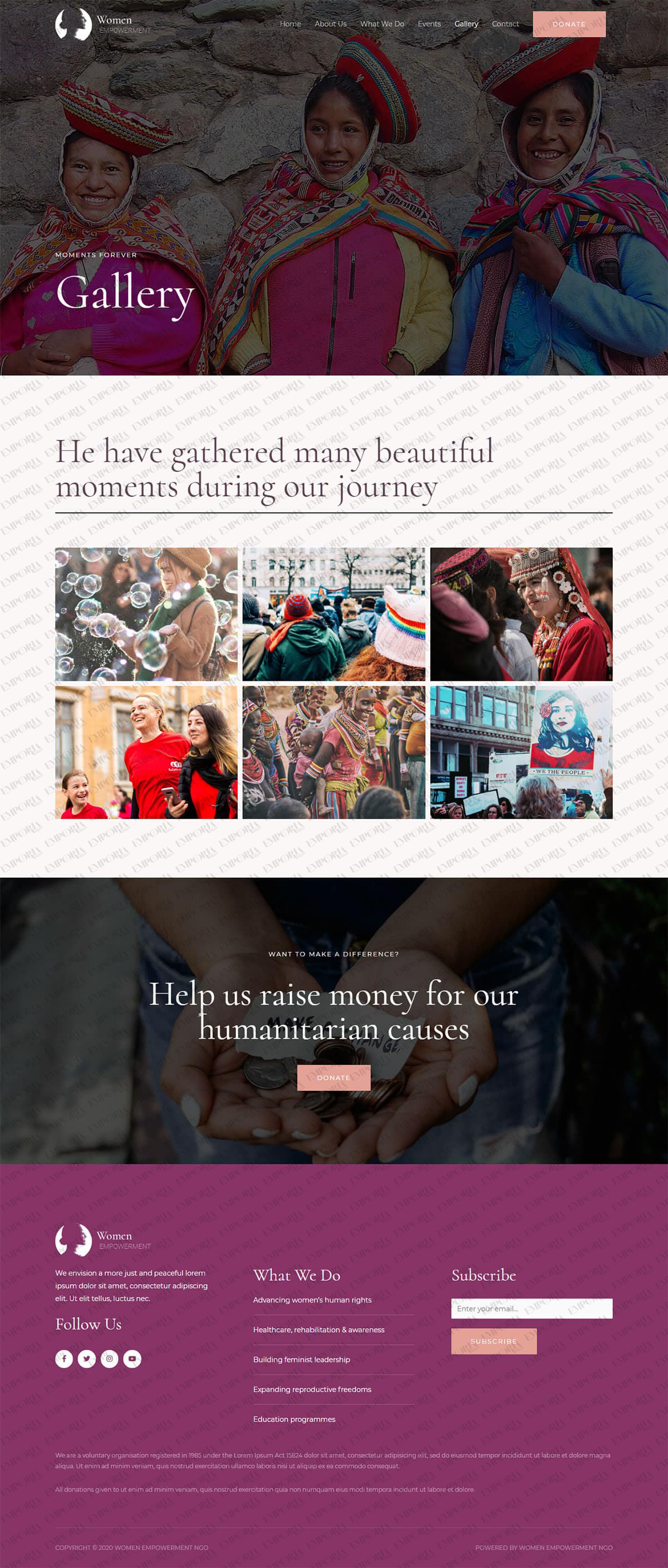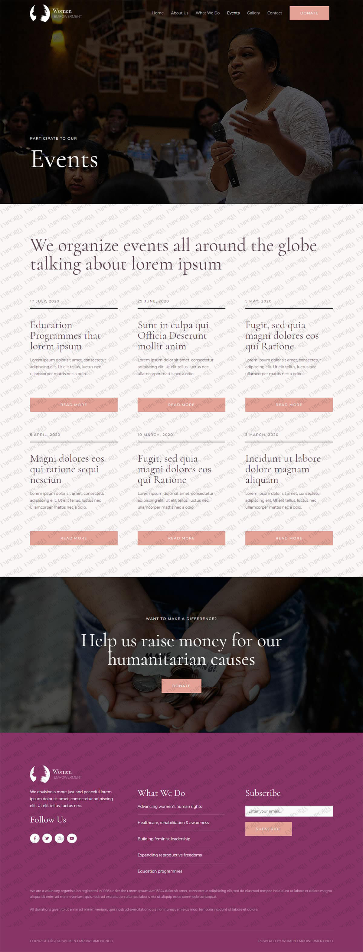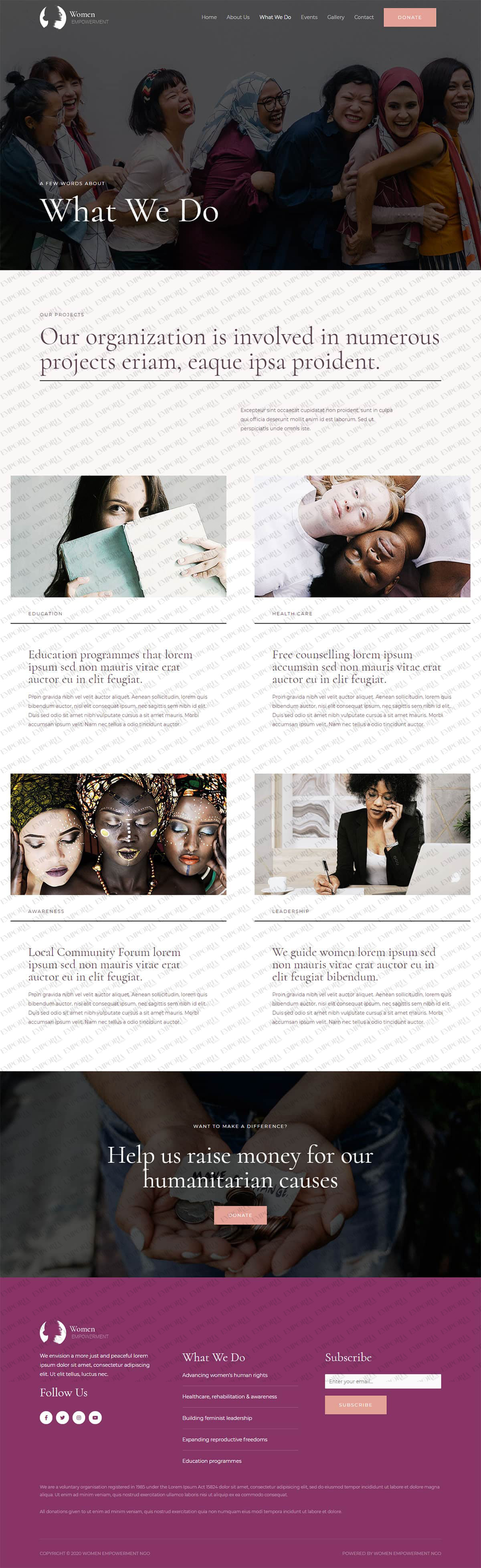 The Women Empowerment NGO template delivers a pleasant feel as soon as it loads. It opens with a fullscreen image header with soft colors and modest headline before flowing into an alternating light and dark homepage.