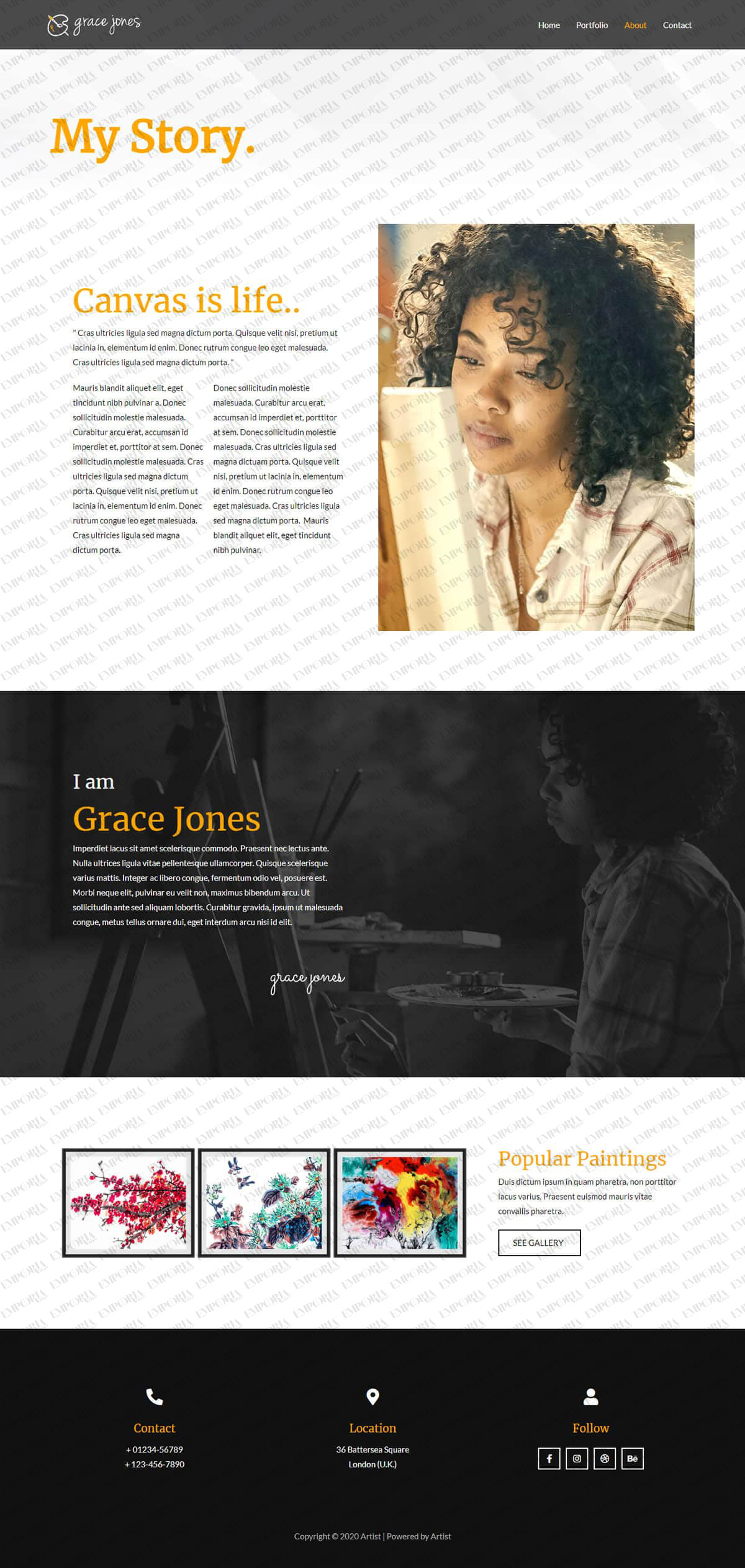 The Artist template tells your story through framed images within a compelling dark and light layout. It’s a well-balanced design with comfortable fonts, great contrast colors and those images front and center.