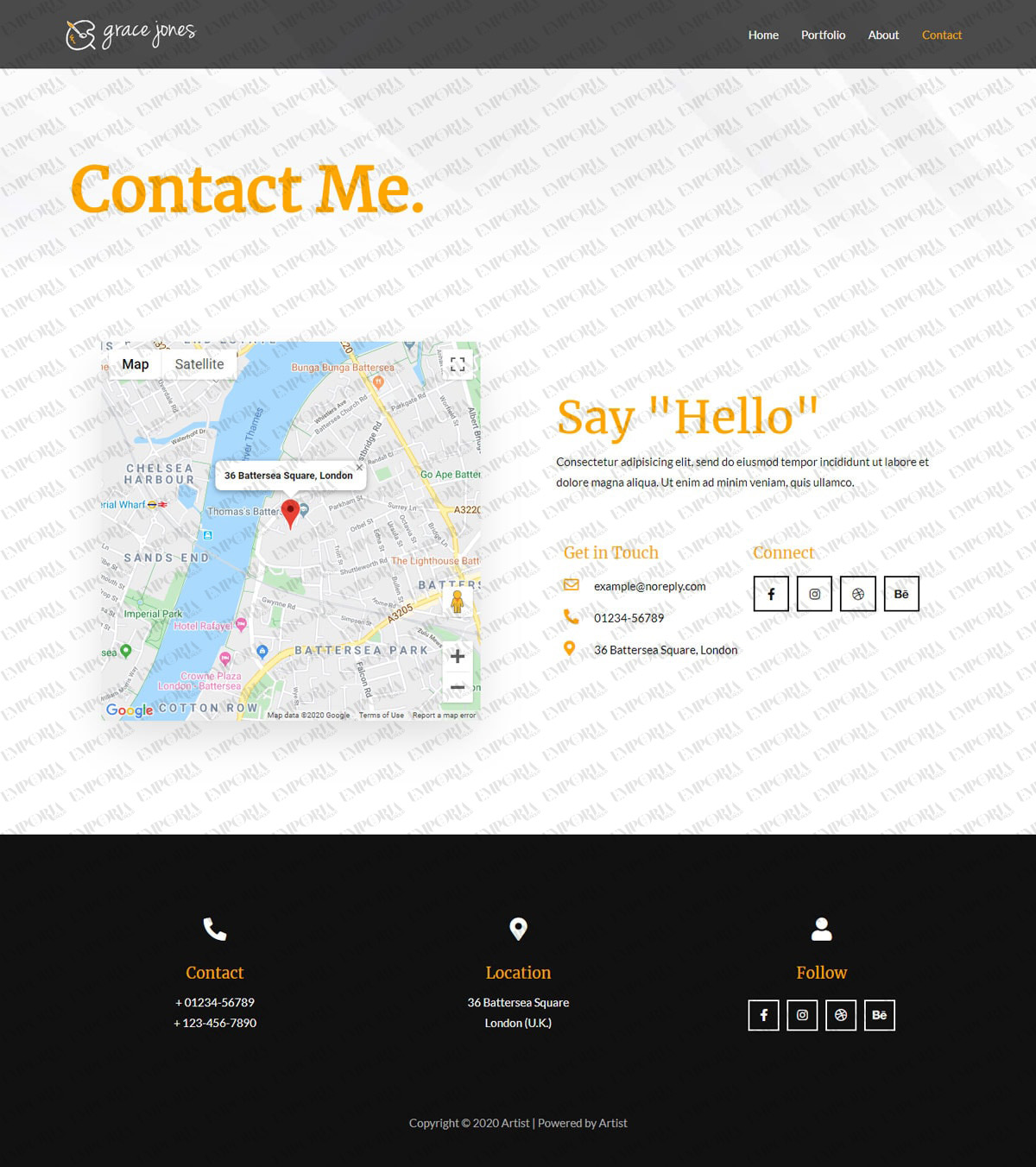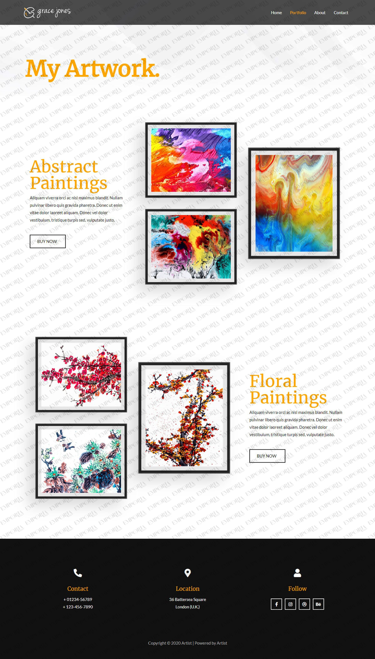 The template has a flowing layout that showcases your creations alongside modest content areas to add context. Each piece can have its own page or link to the readymade portfolio page that comes with this template.