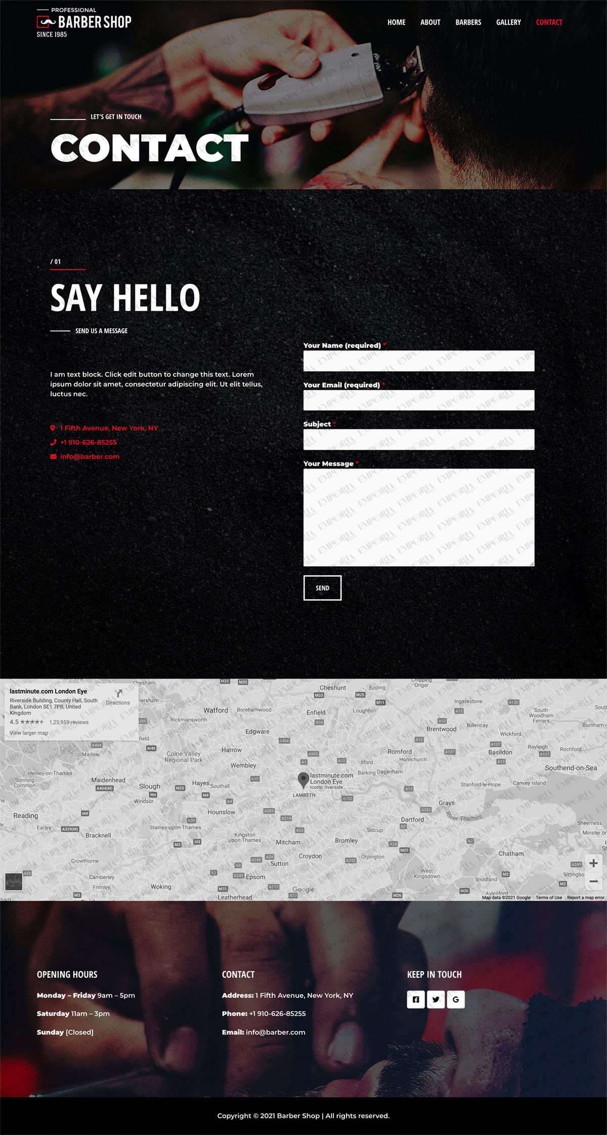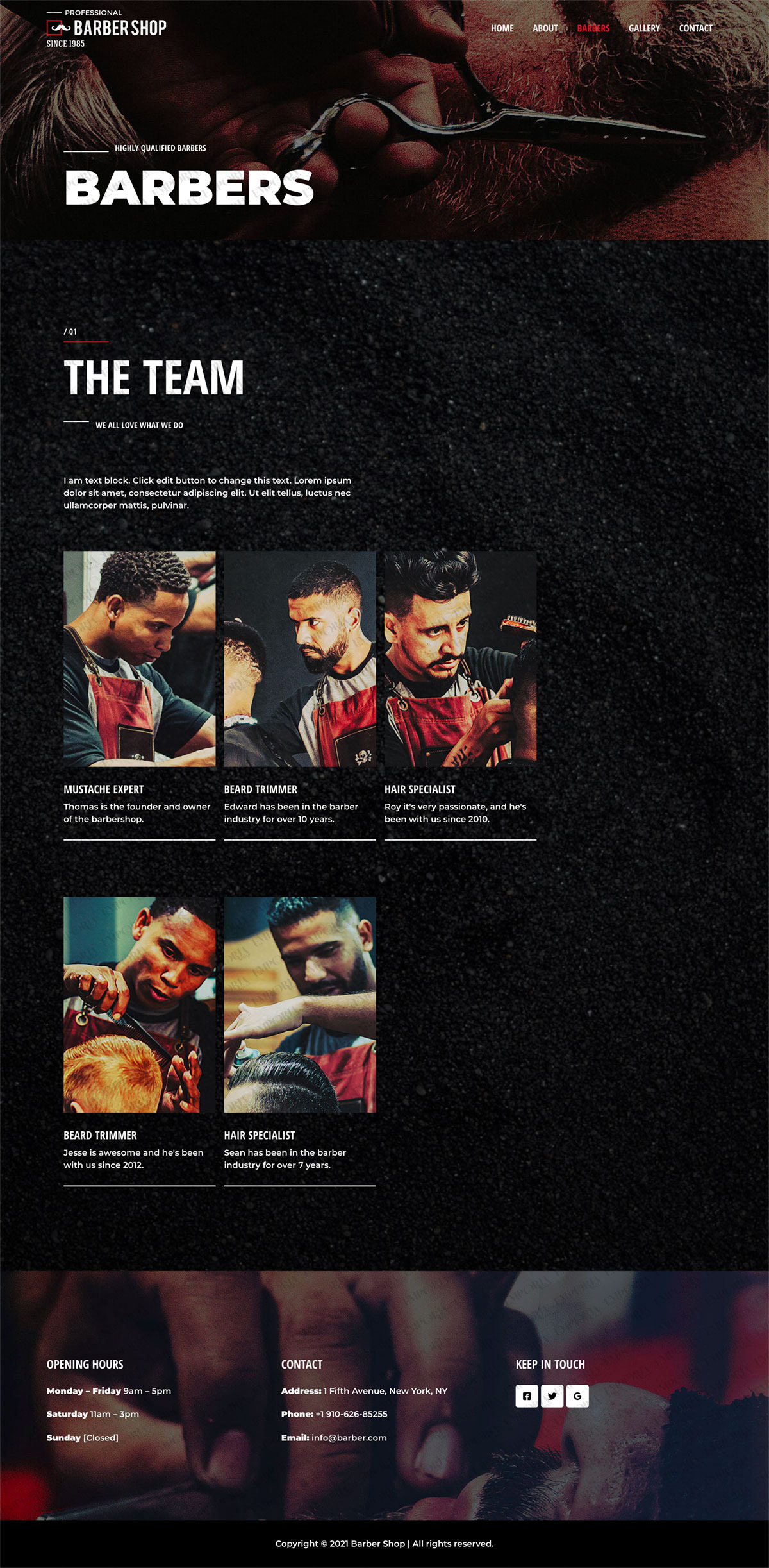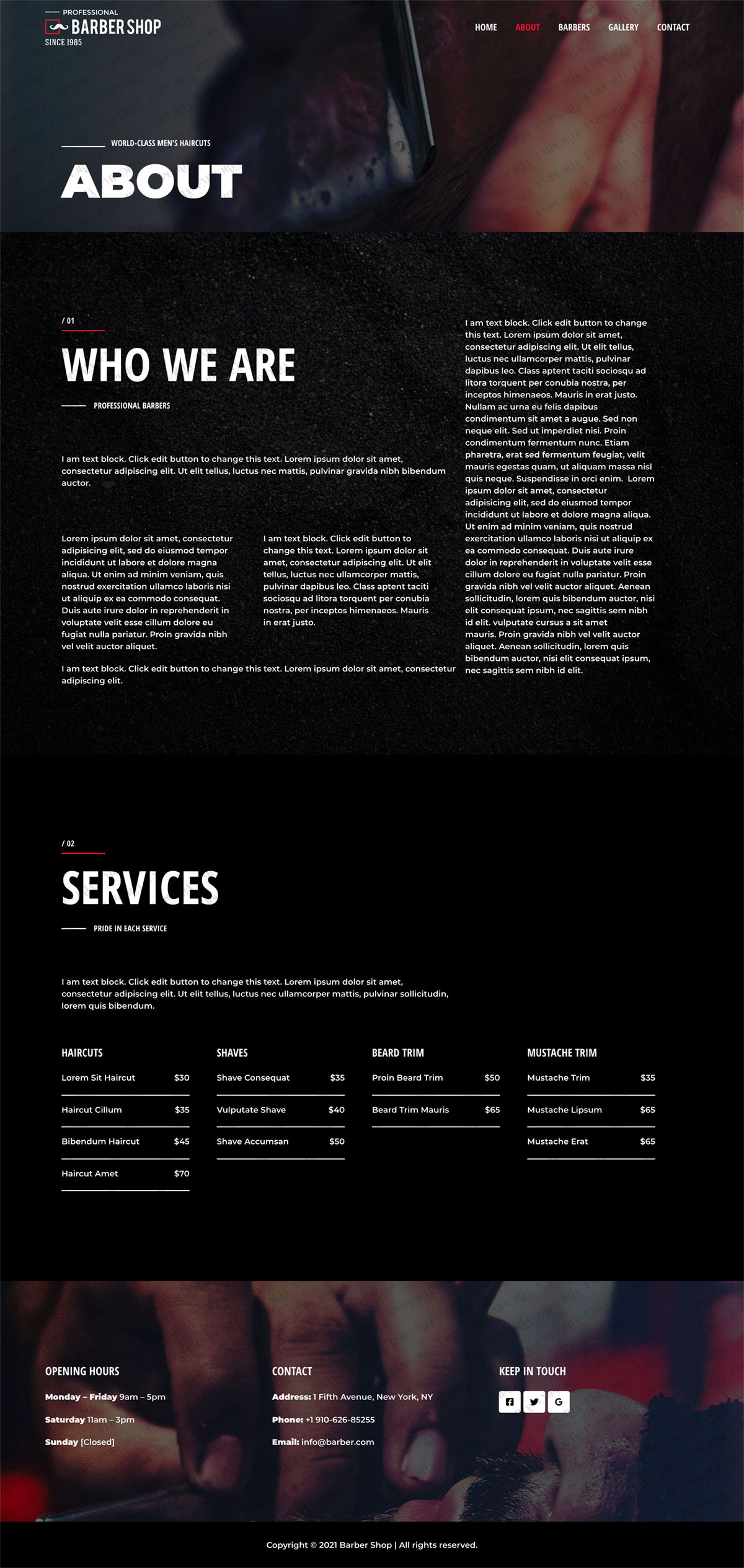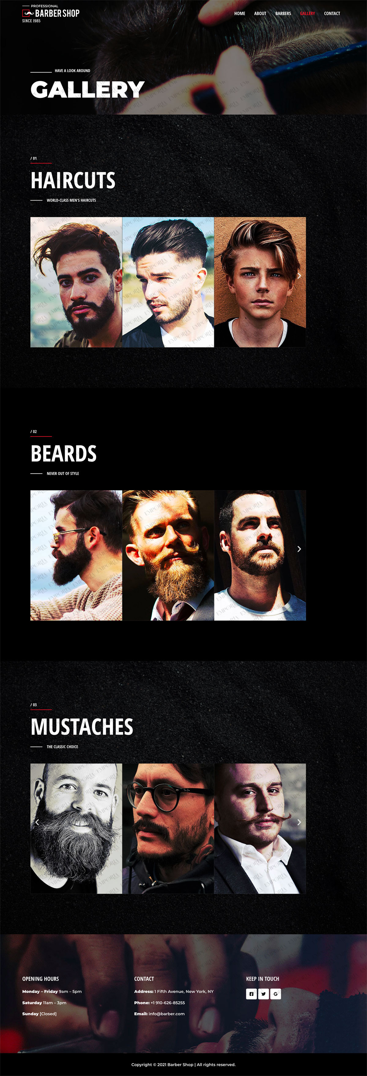 The template uses dark shaded images overlaid with white text using crisp sans serif fonts. Pages offer great balance and some nice content areas to showcase your products and services. It’s perfect website template for barbers and hairdressers!