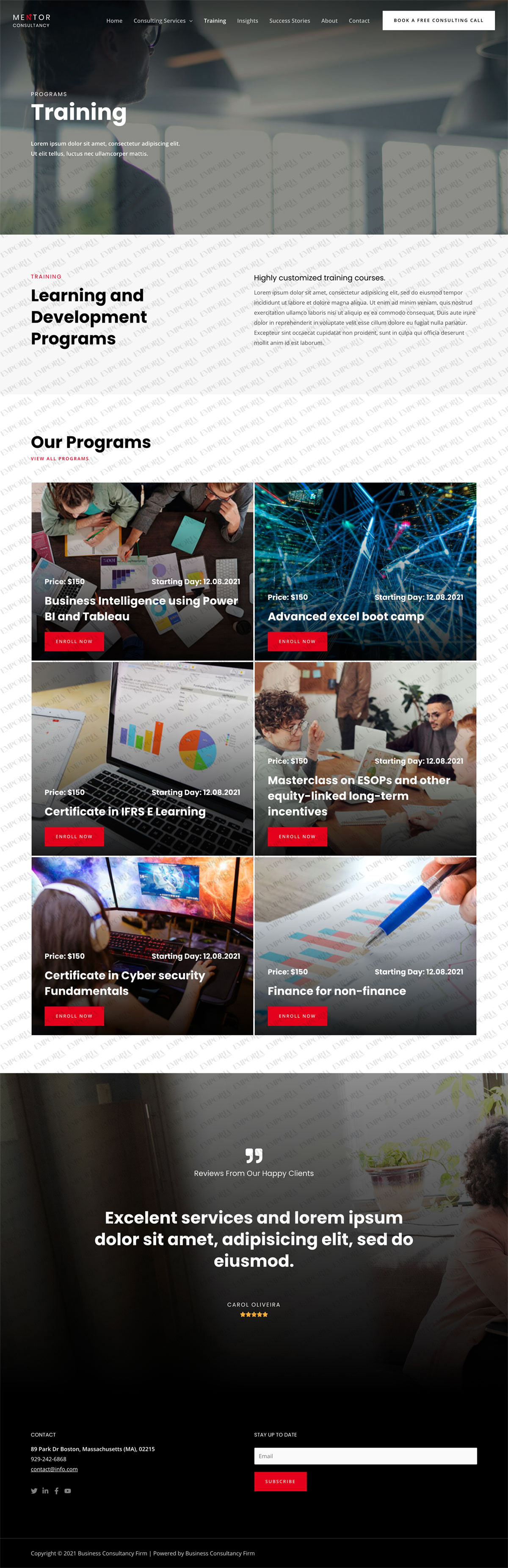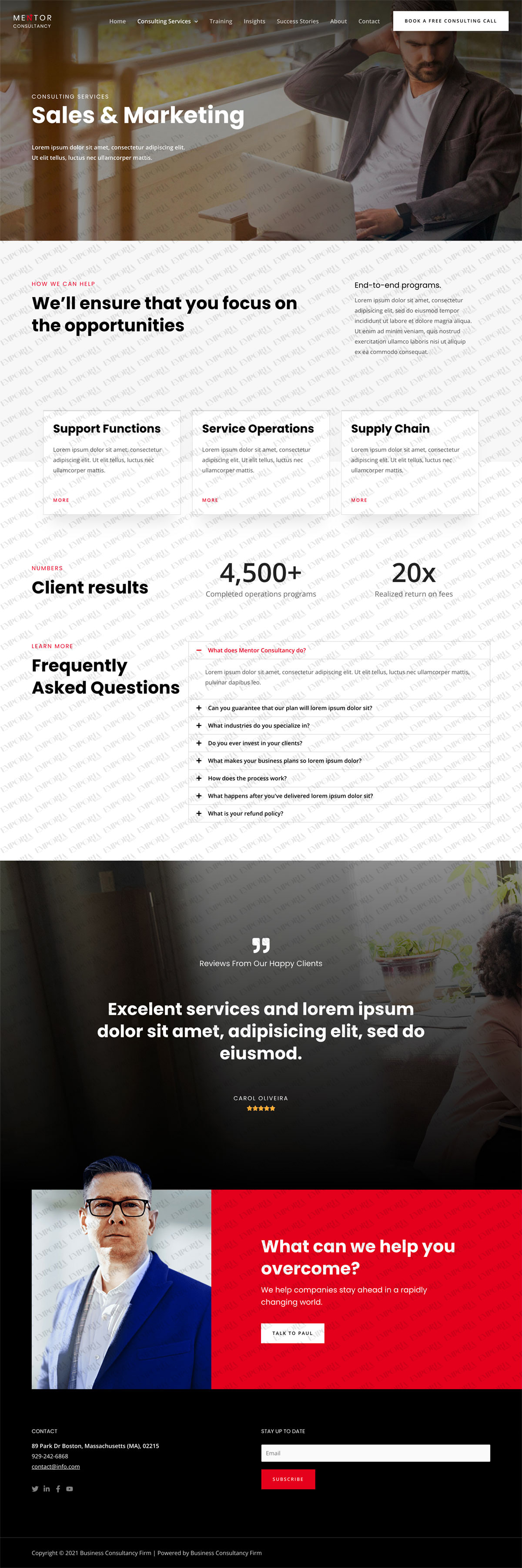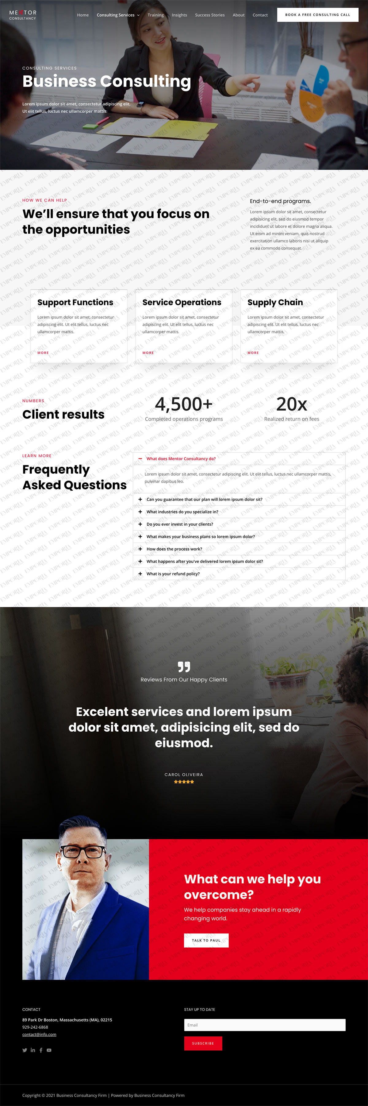 • A ‘book a free consulting call’ call to action button is integrated into the top menu