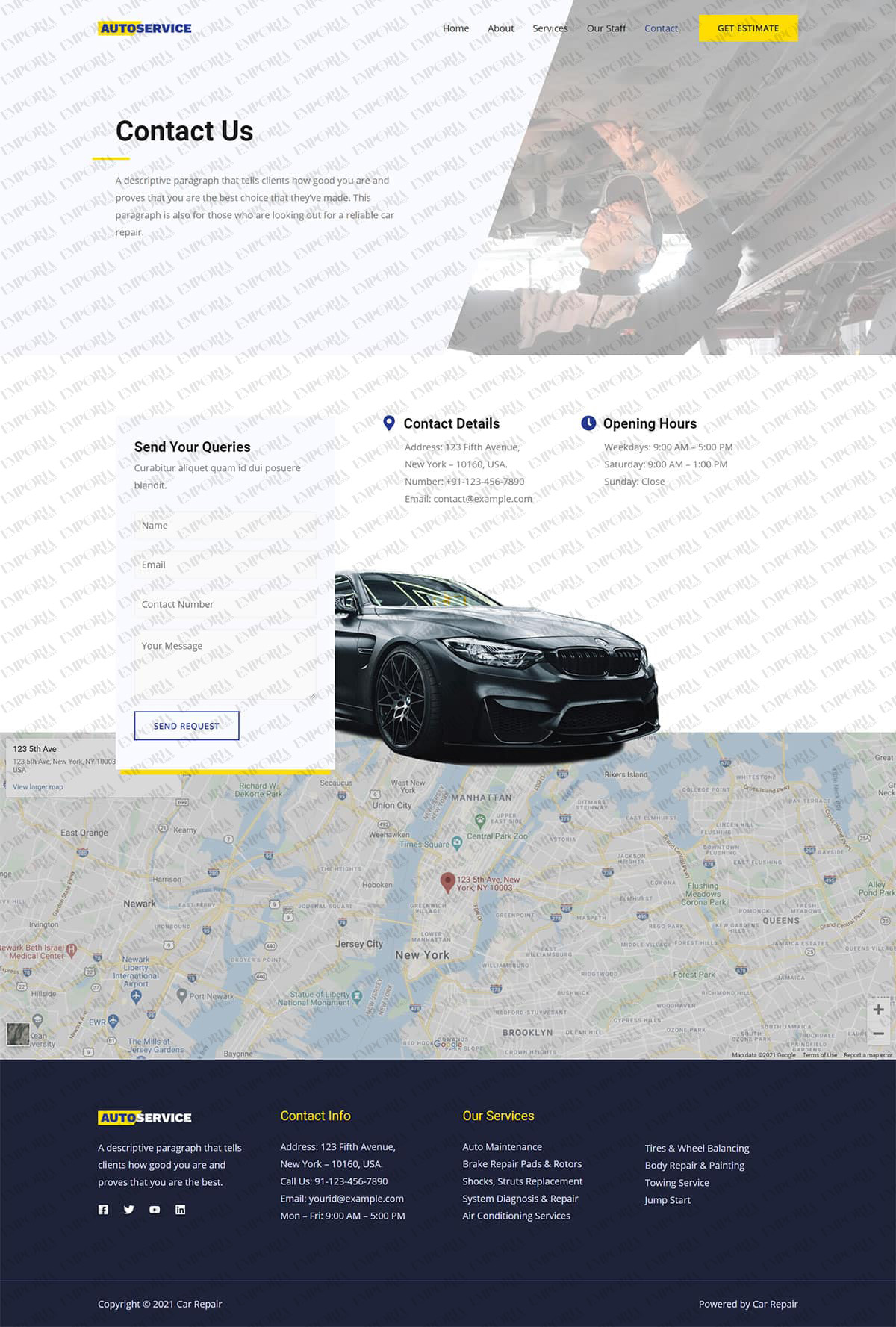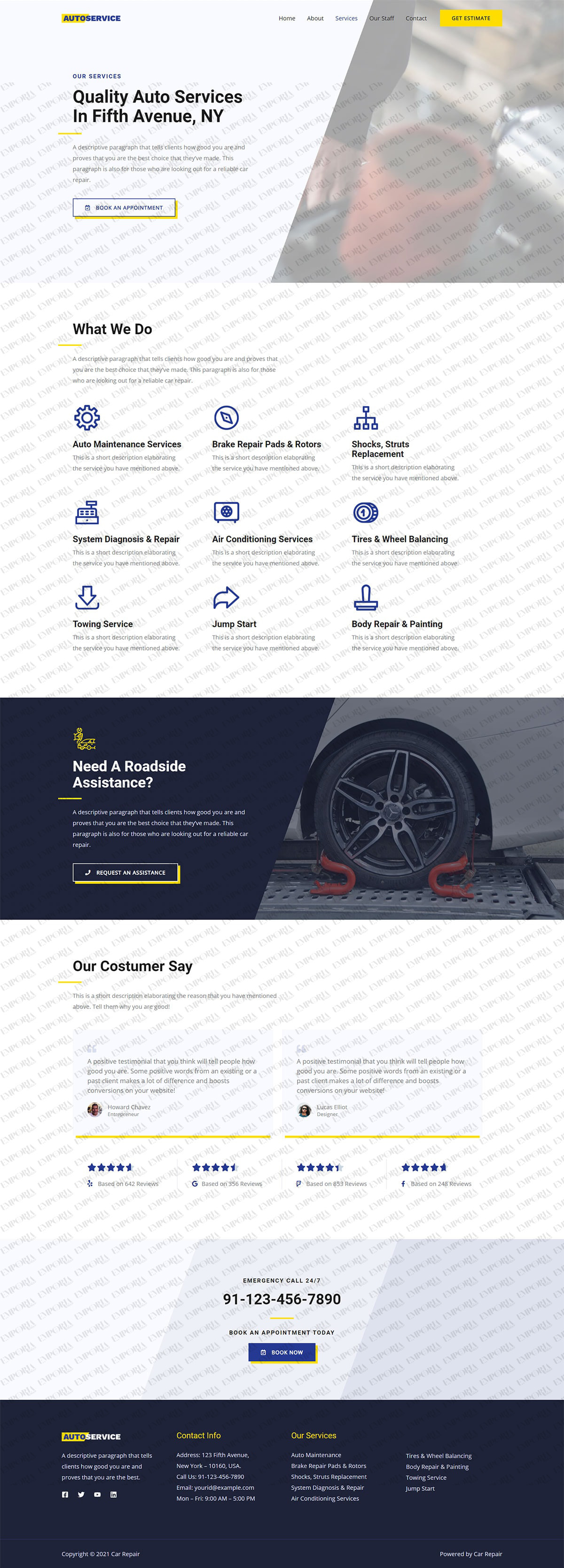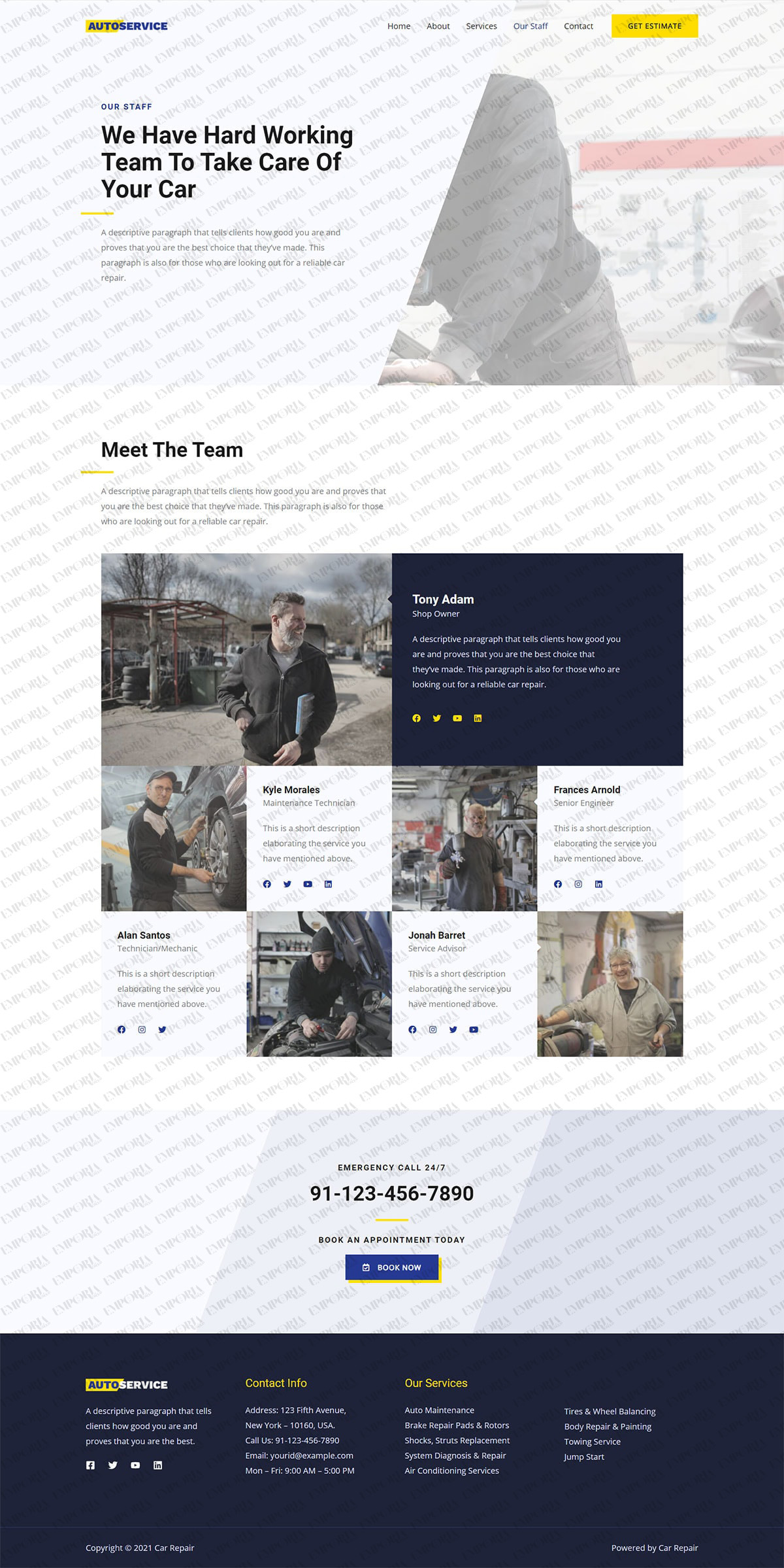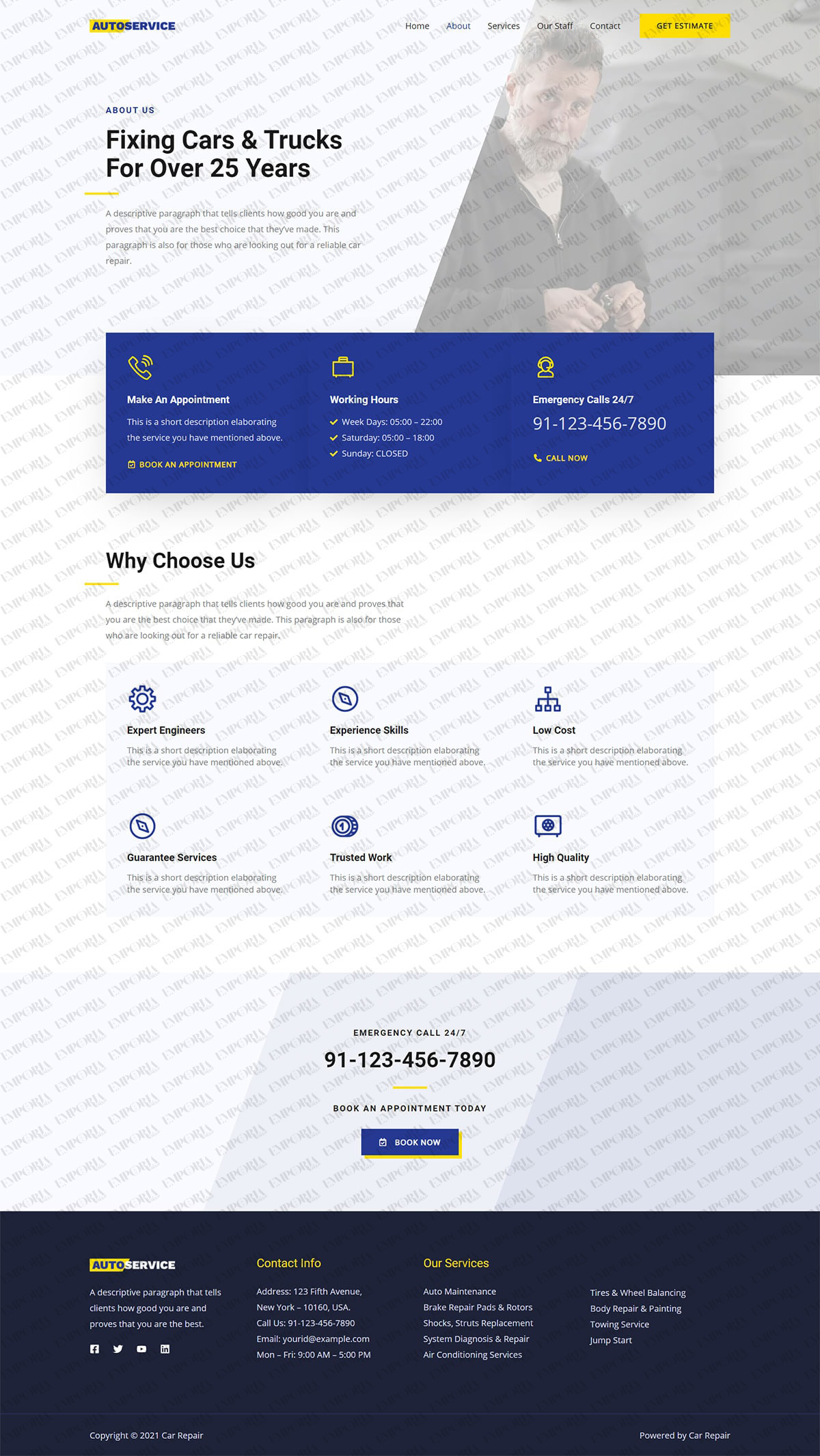 The Car Repair template has a light, refreshing design that draws you in from the very beginning. It opens with a large car image to set the scene, along with a strong call to action to deliver visitor intent.