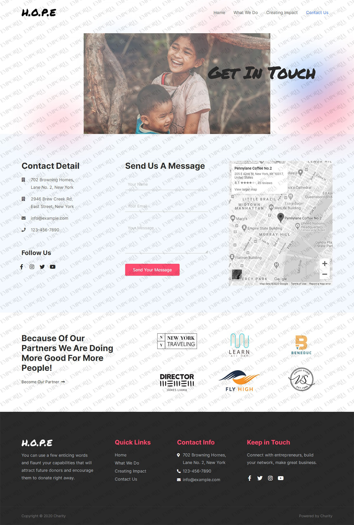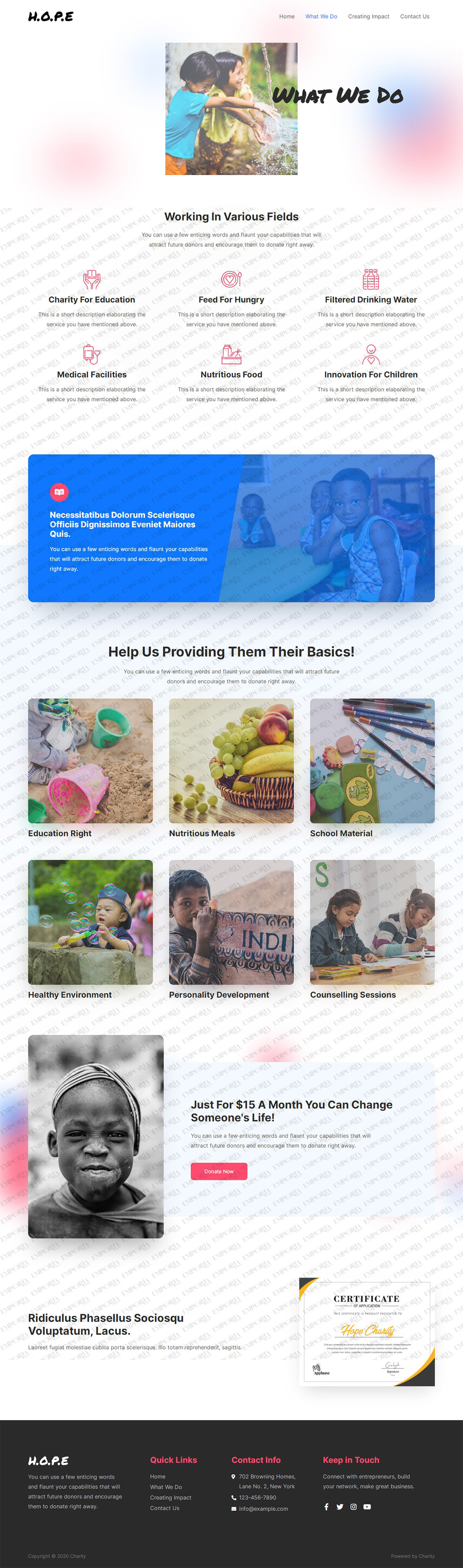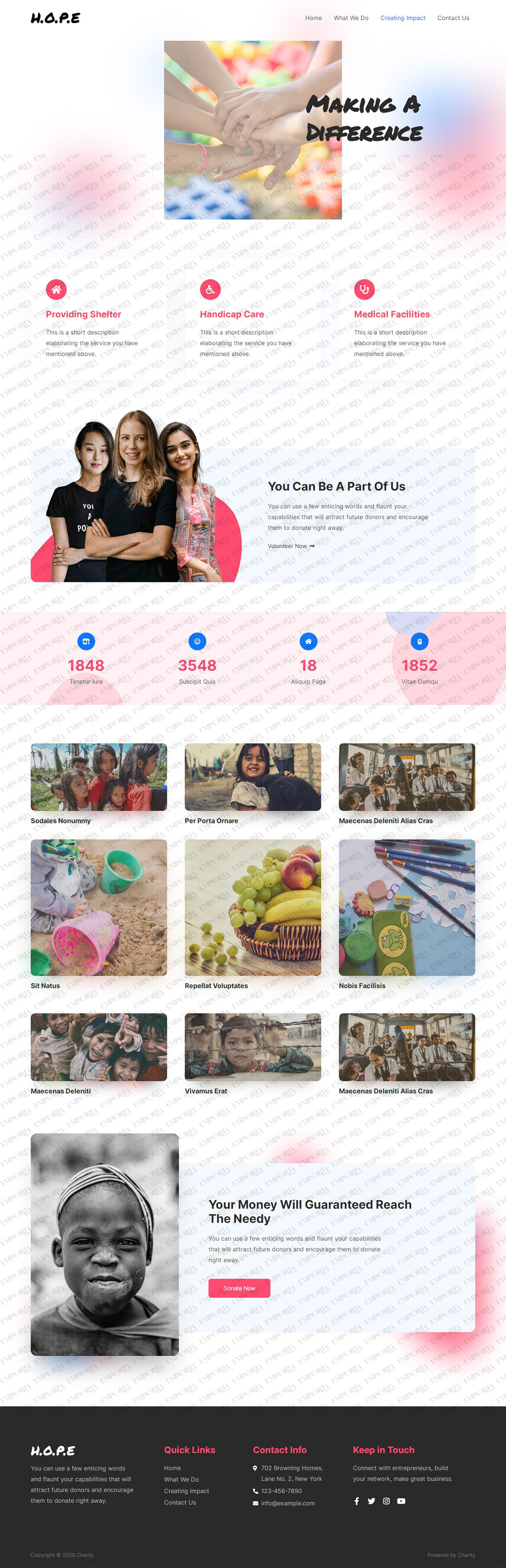The template includes service sections, a portfolio to showcase your good works, a donor section to give thanks, call to action sections to help encourage donations and lots of places to add any content you like.