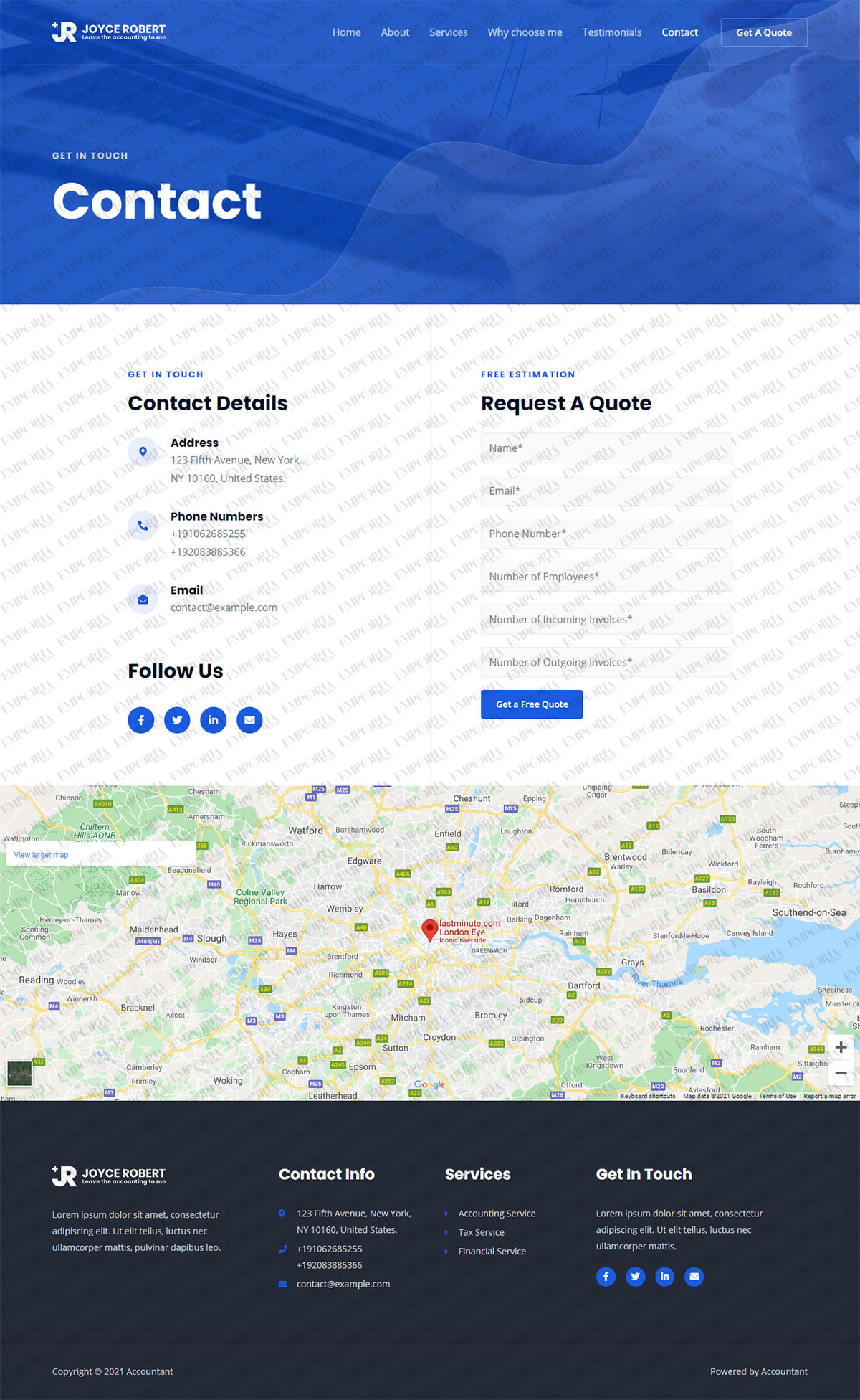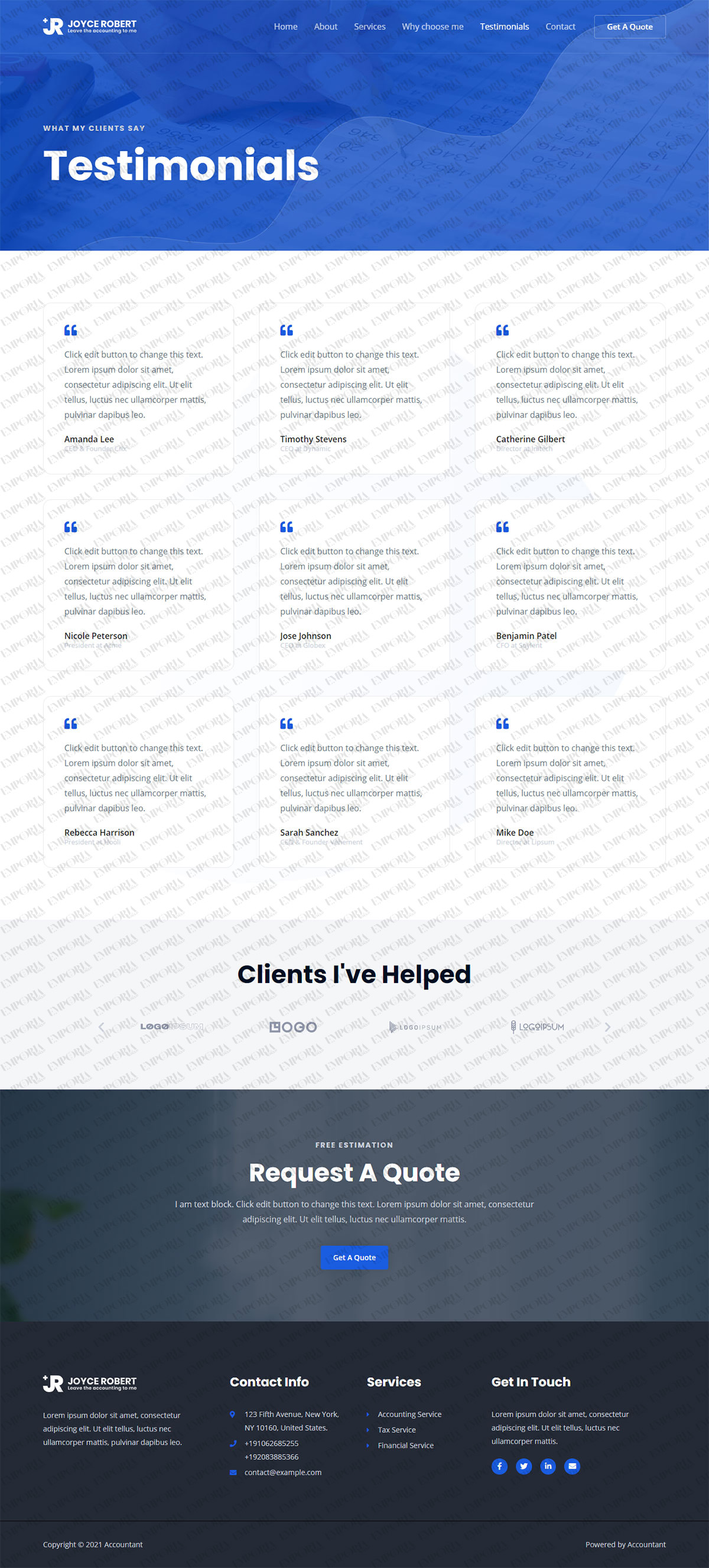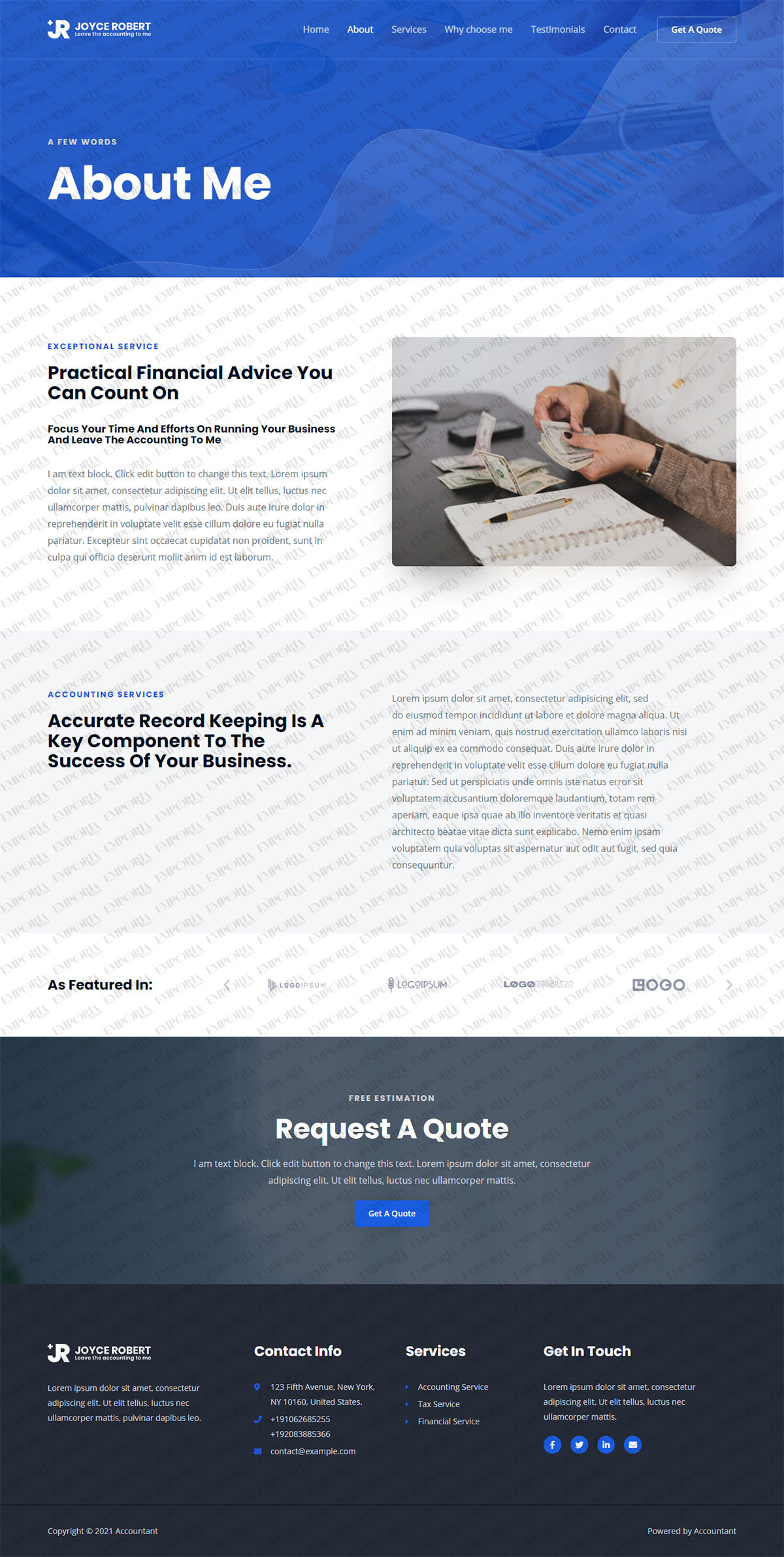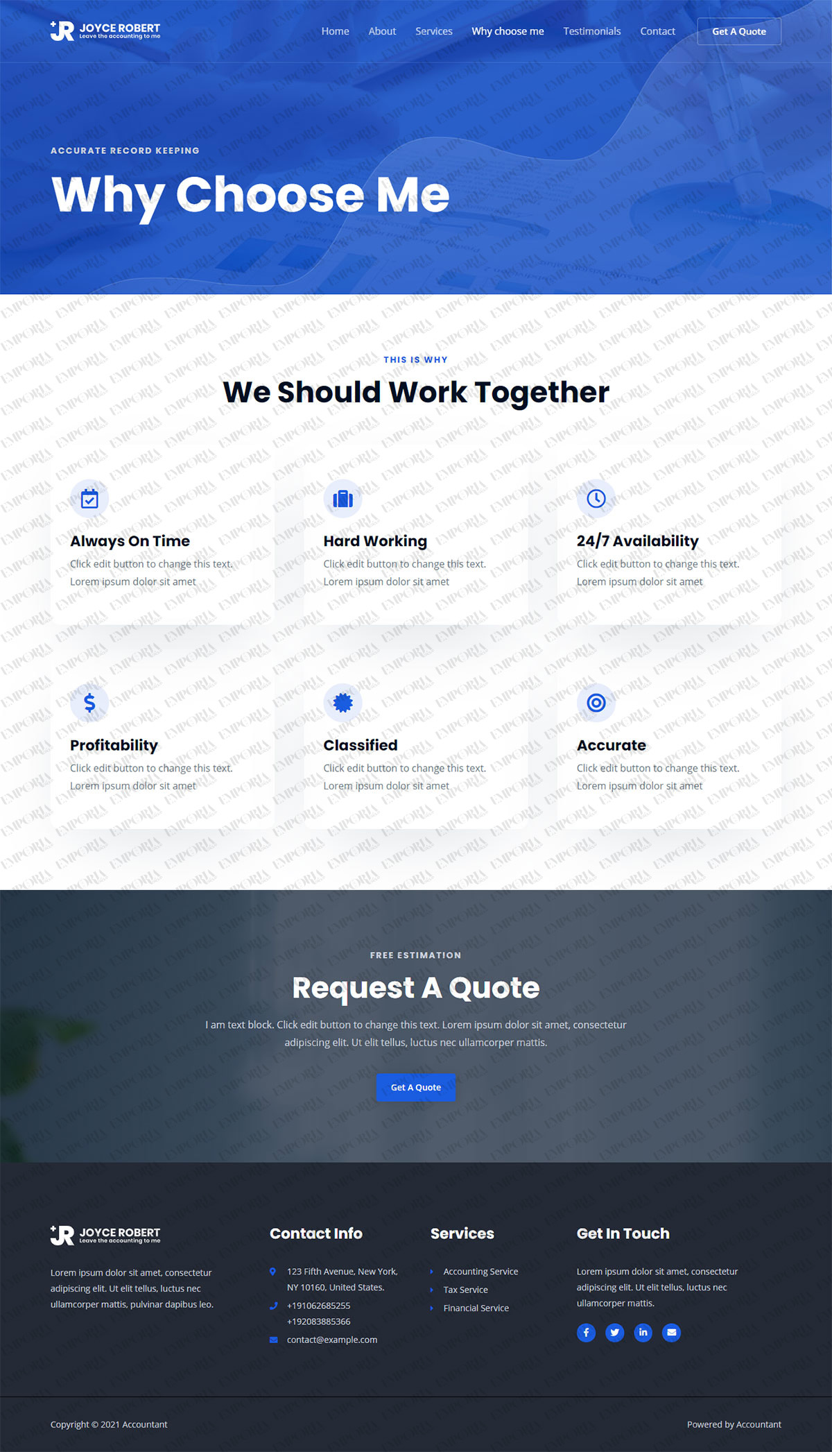 The Chartered Accountant template avoids the usual seriousness of the niche while building the authority it needs using modern design and a bright blue color.