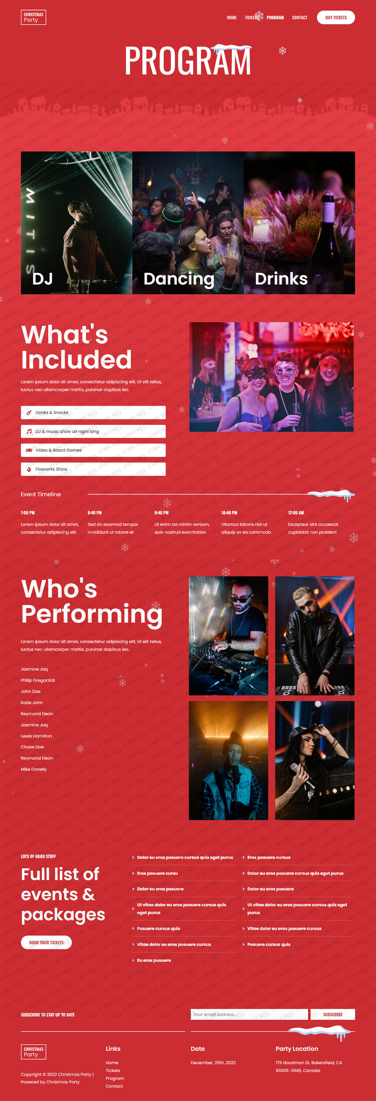 The Christmas Party template uses plenty of red with strong white fonts and a neat animated snowflake effect. The page includes elements to showcase the what, when and where of your event alongside customizable areas to use as you need.