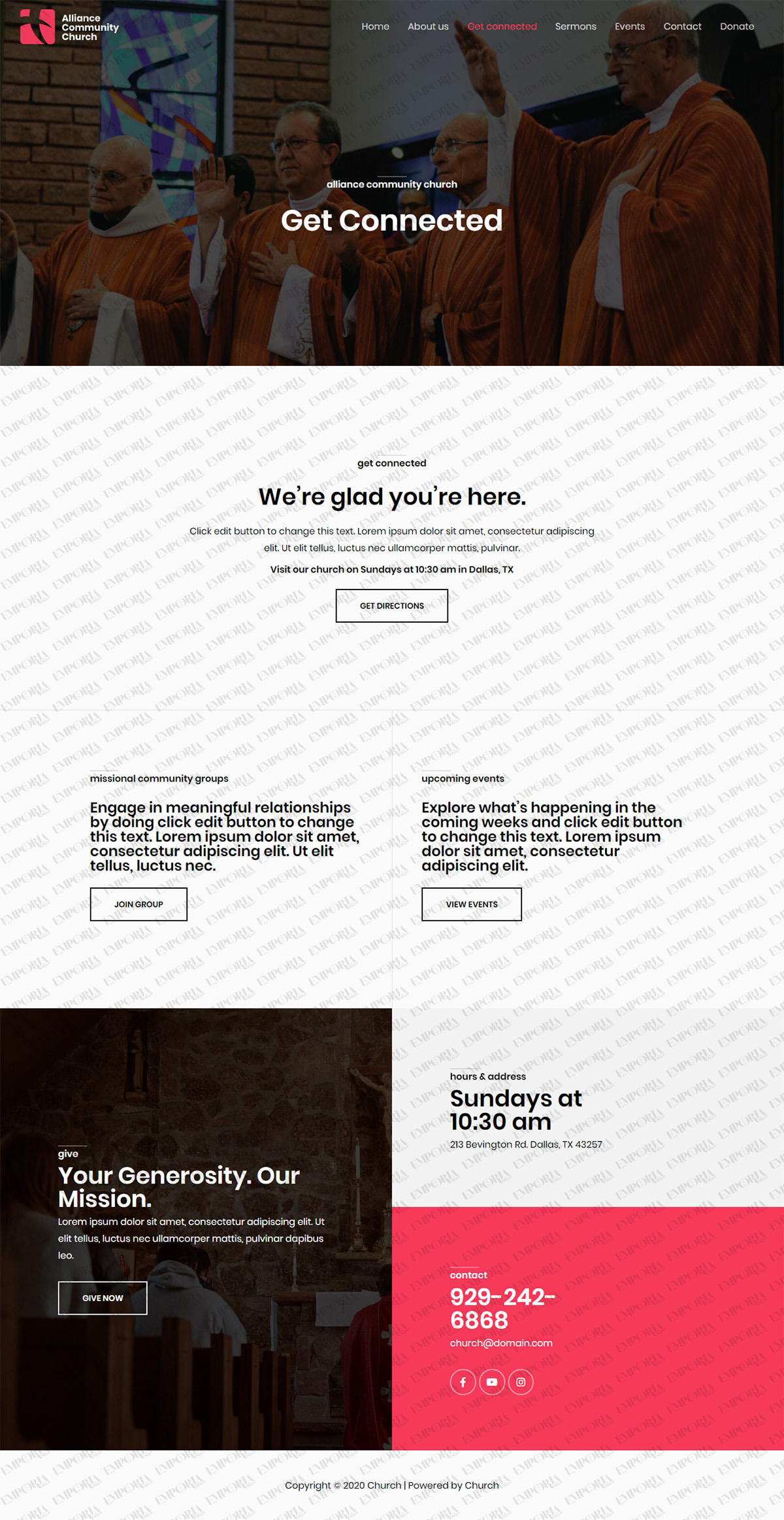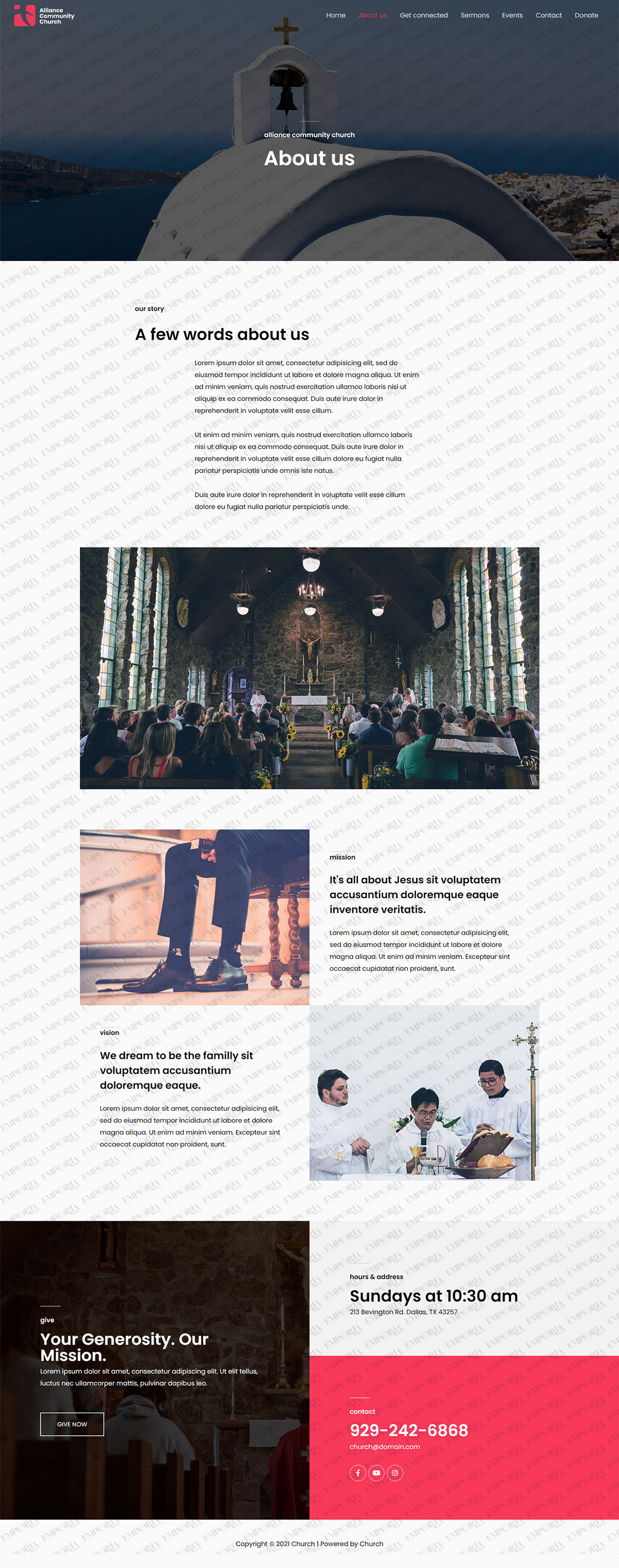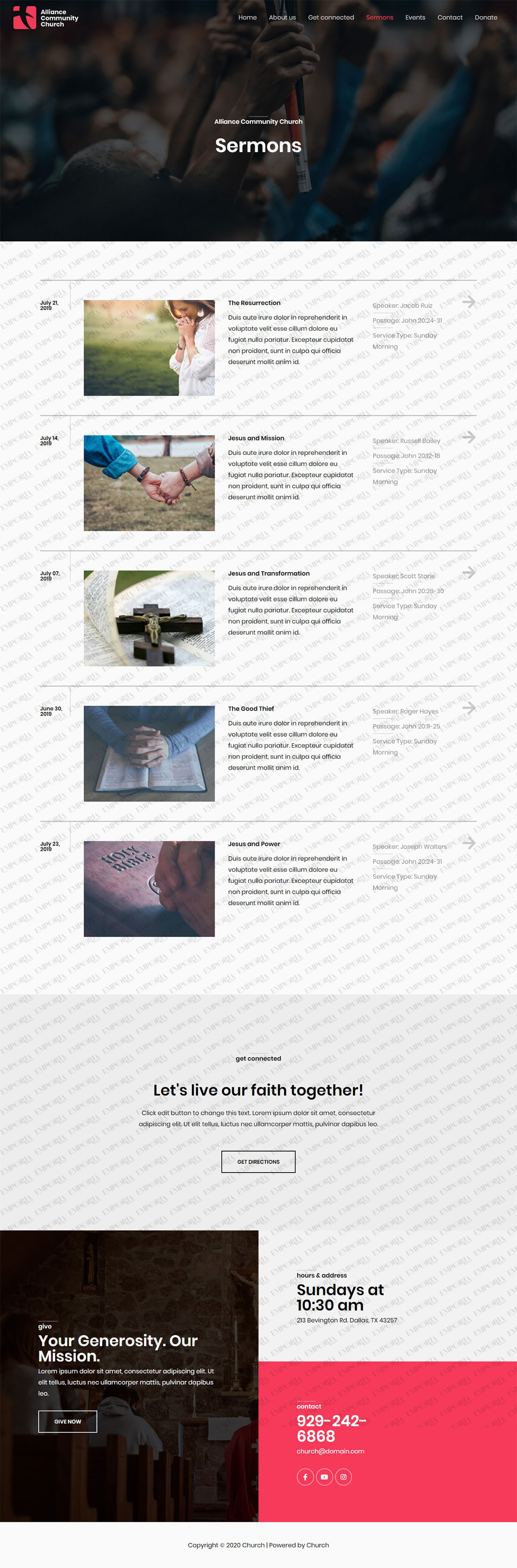 The Church website template has a serene feel while portraying the seriousness of the subject in a welcoming manner. The template opens with a full screen image and strong headlines and call to action.