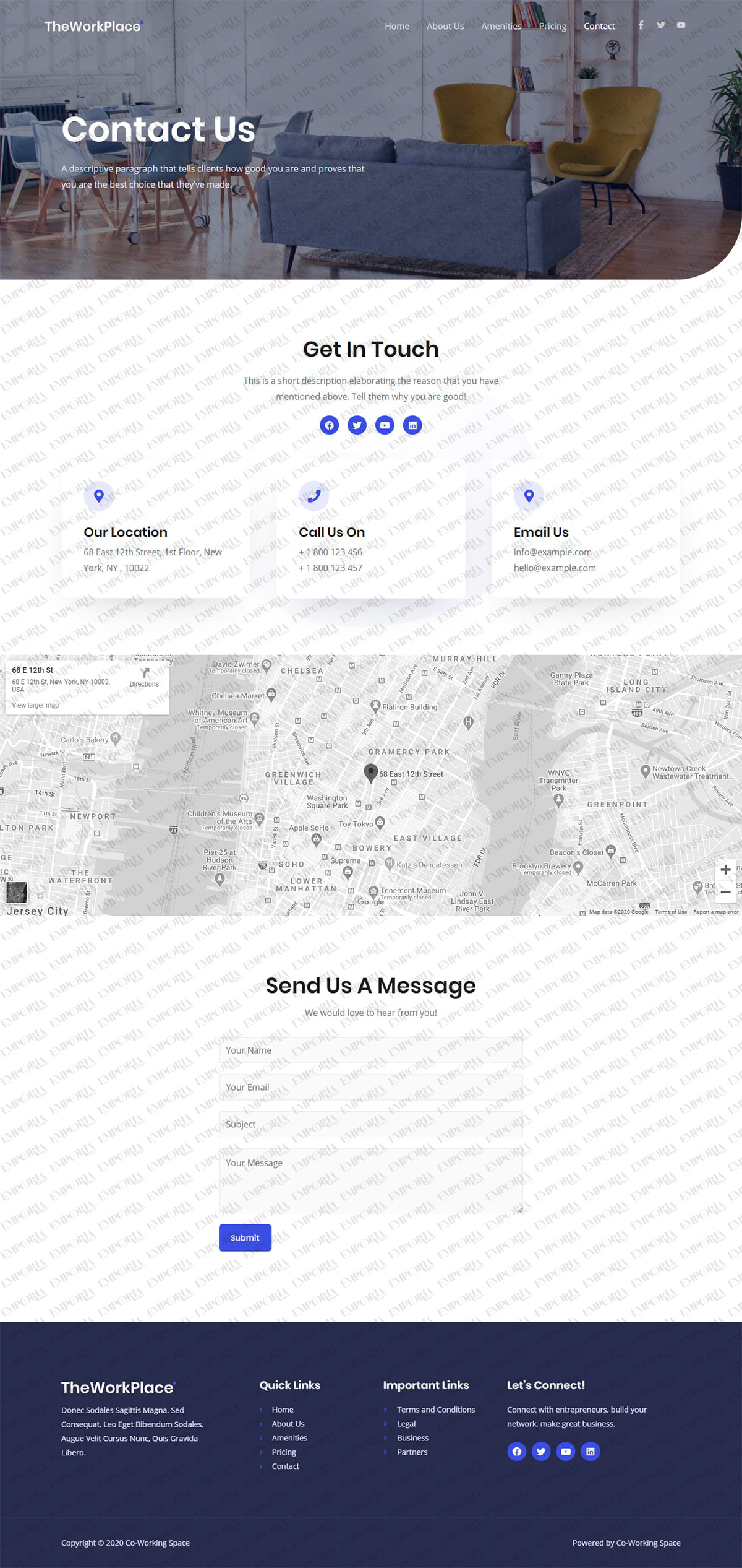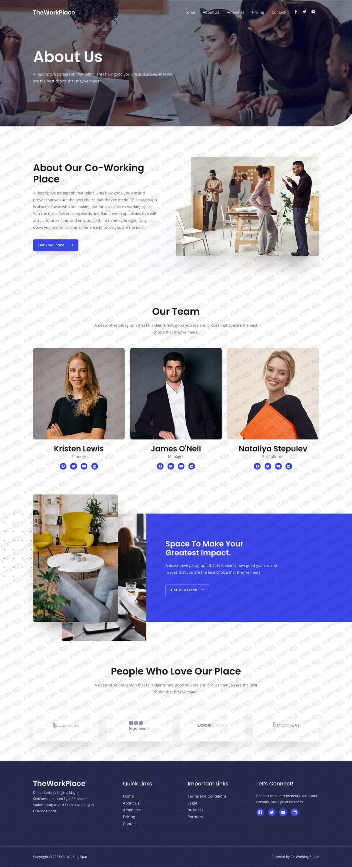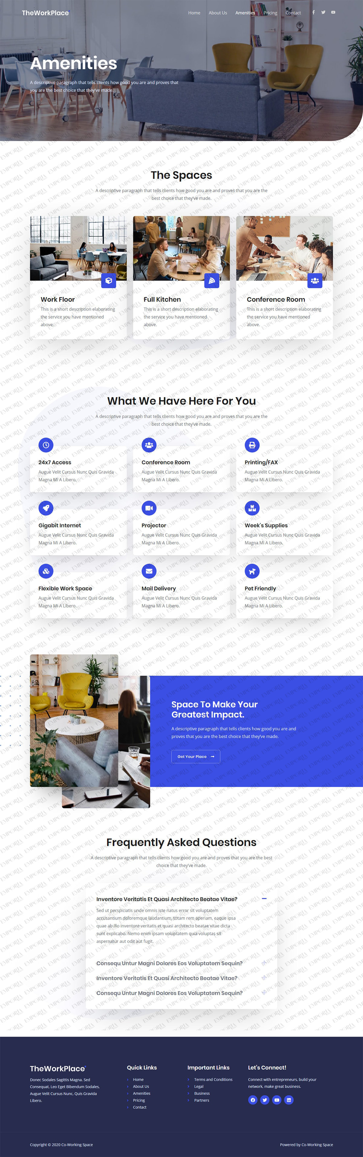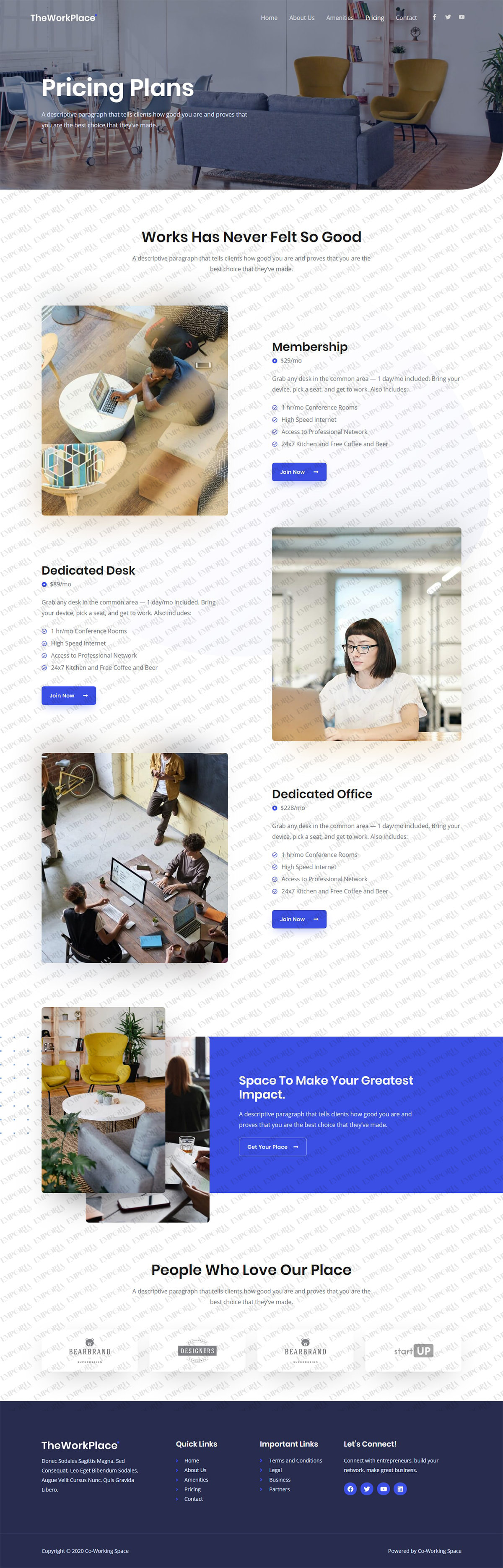 The Co-Working Space template provides all the ingredients you need to build an engaging business website. While configured for a coworking space, it could easily be personalized to suit any organization.