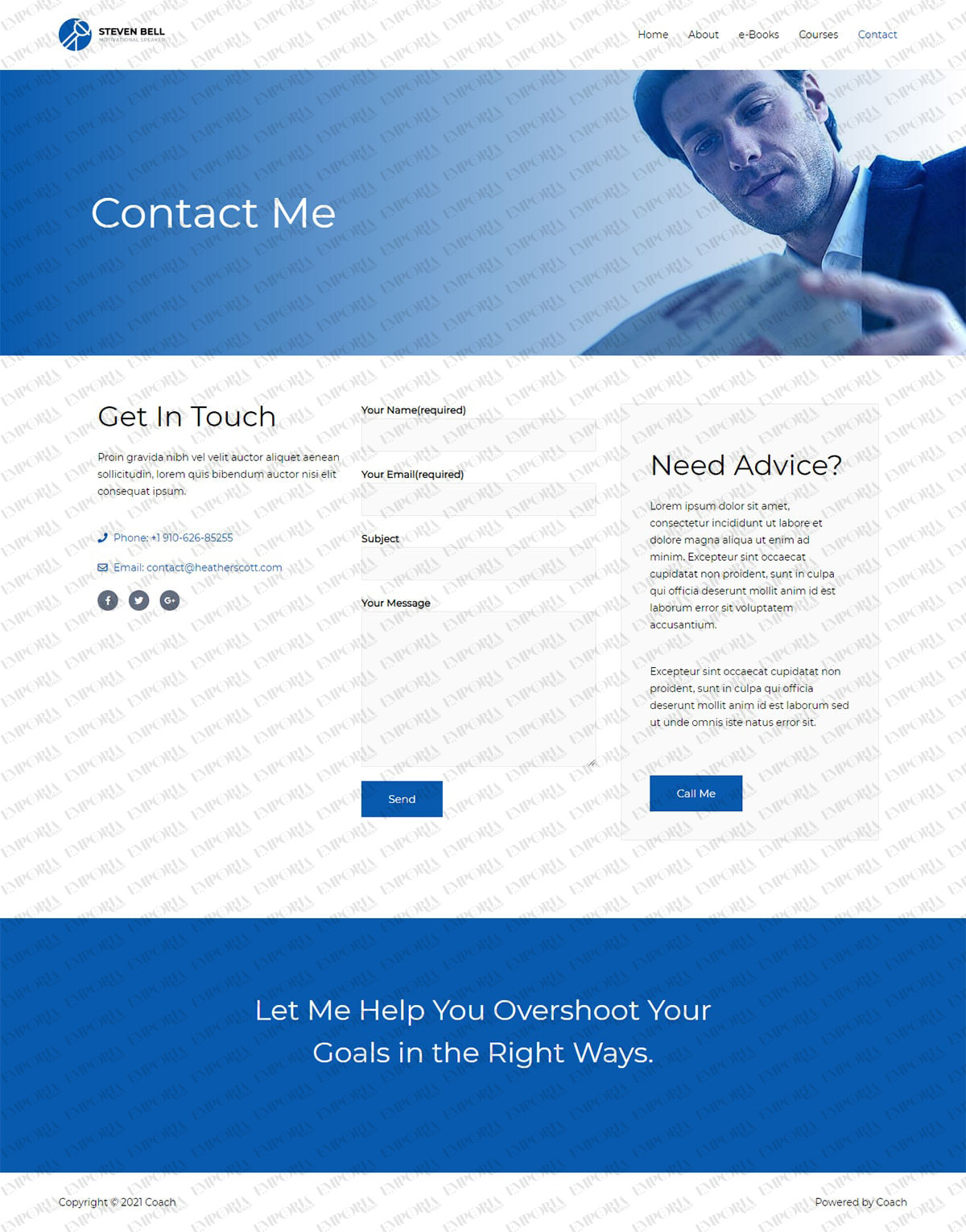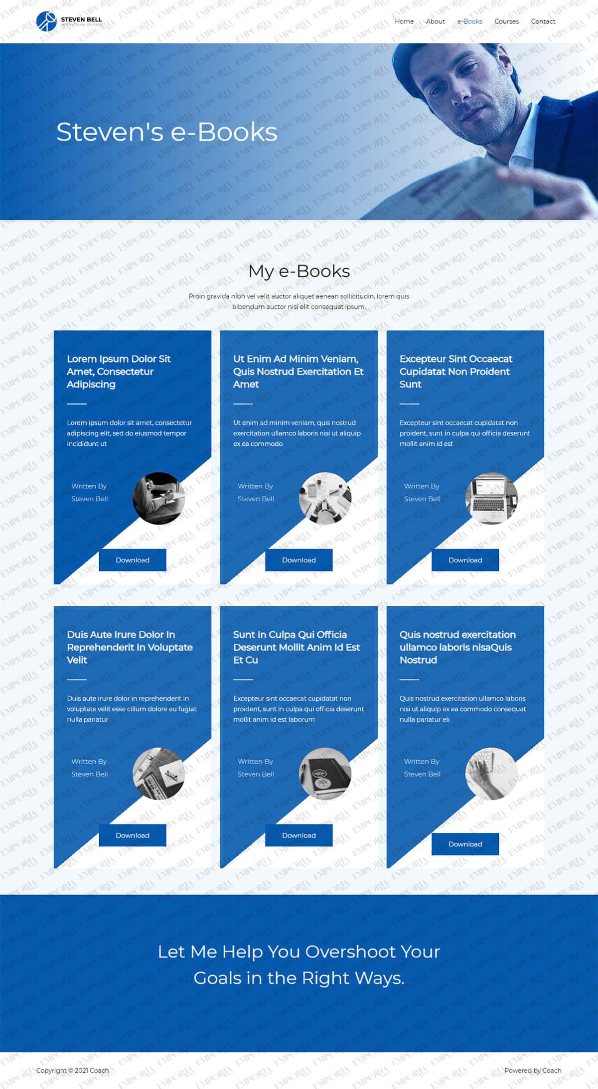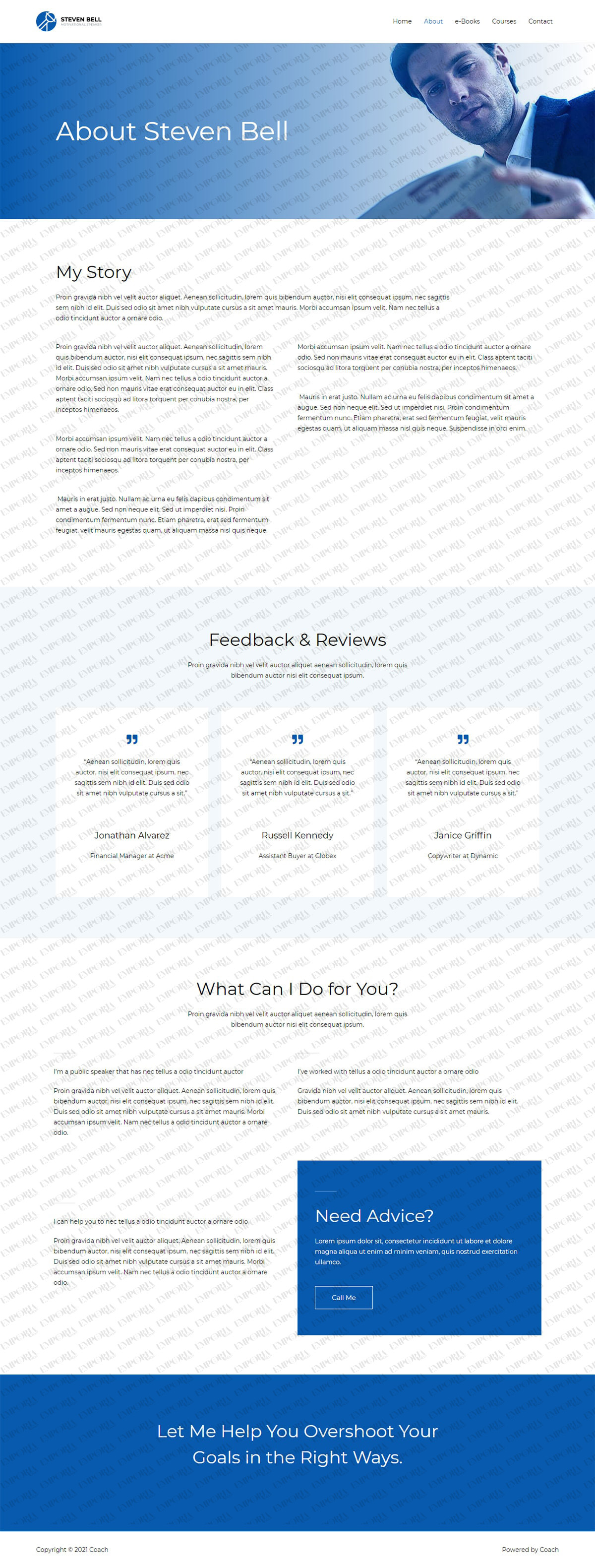 The Coach template uses a reassuring blue color known to give confidence. That’s a great choice for a coach, trainer or instructor but can be changed to fit your brand with ease.