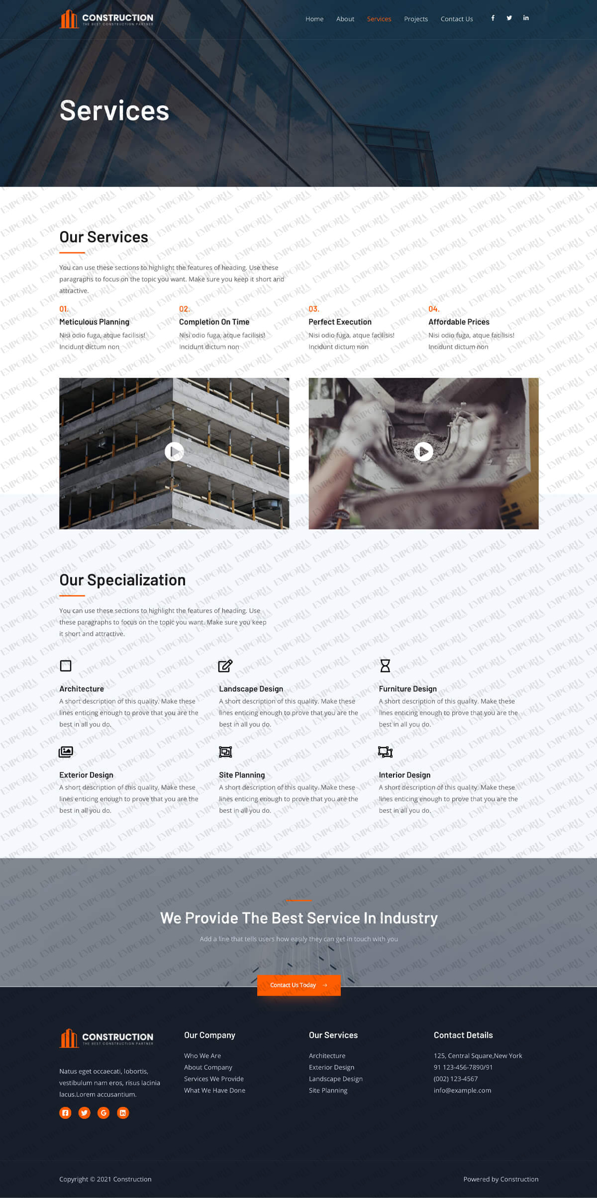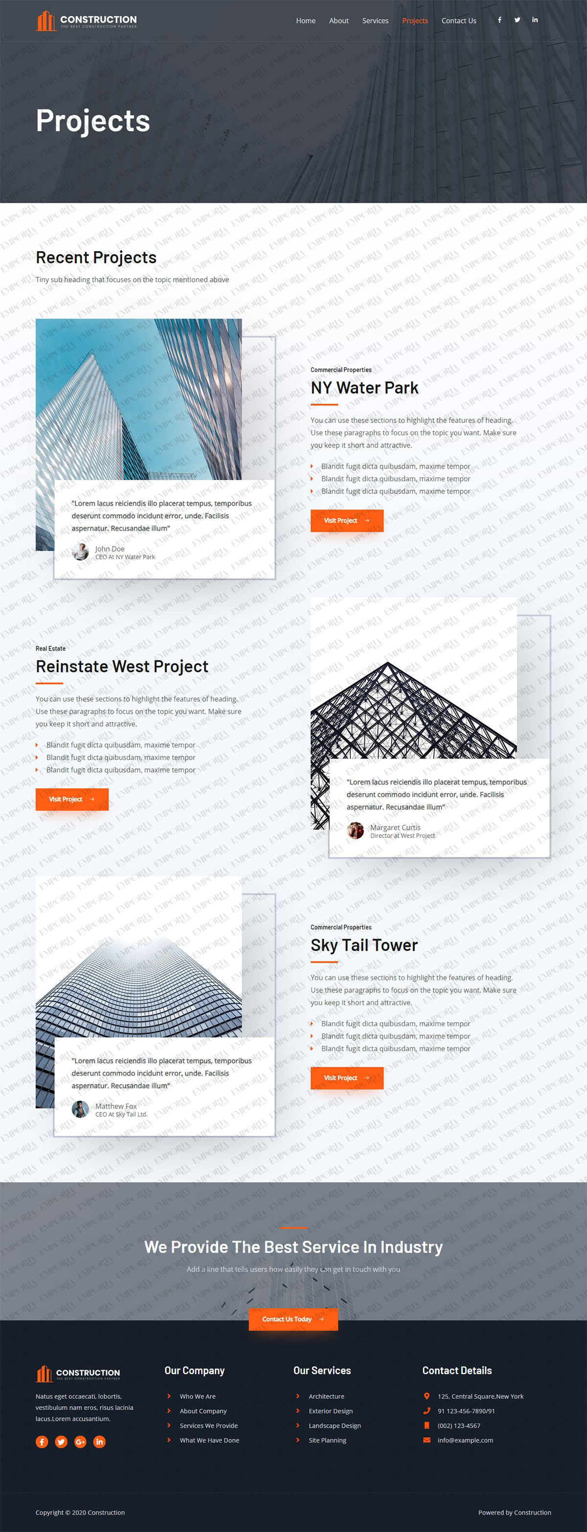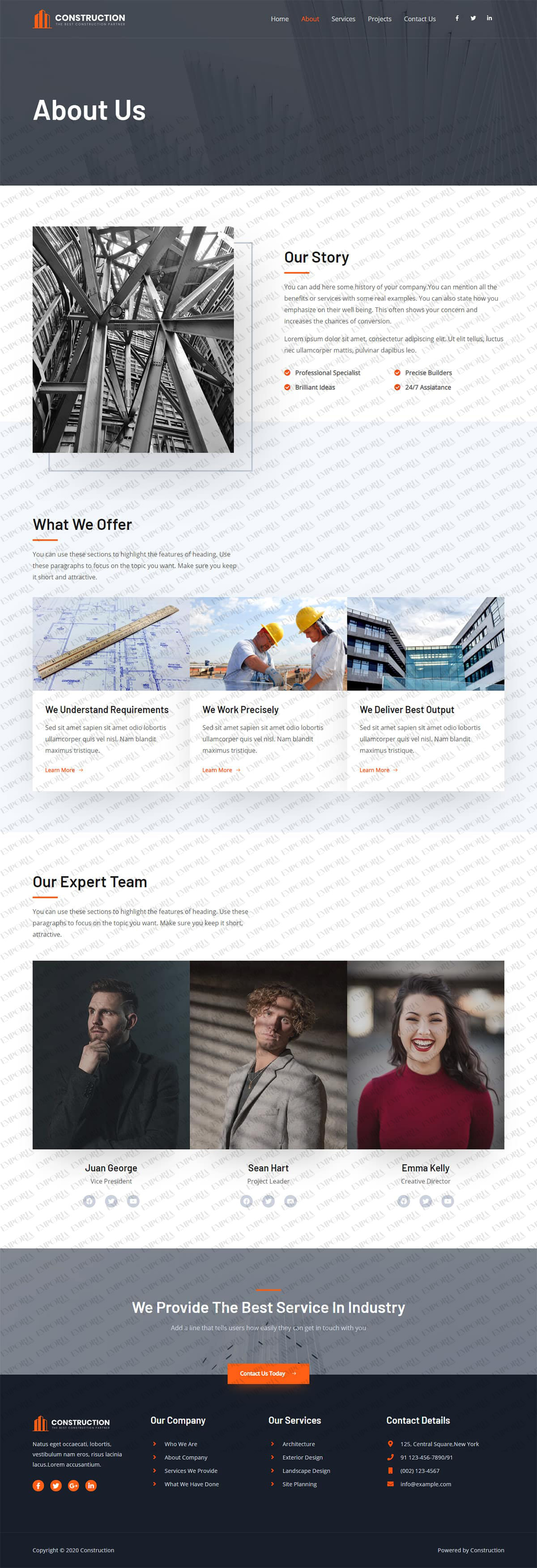 The Construction template is very clean and crisp, ideal for forward-looking businesses. While set up for construction, you could easily use it for architecture, real estate and other business types.