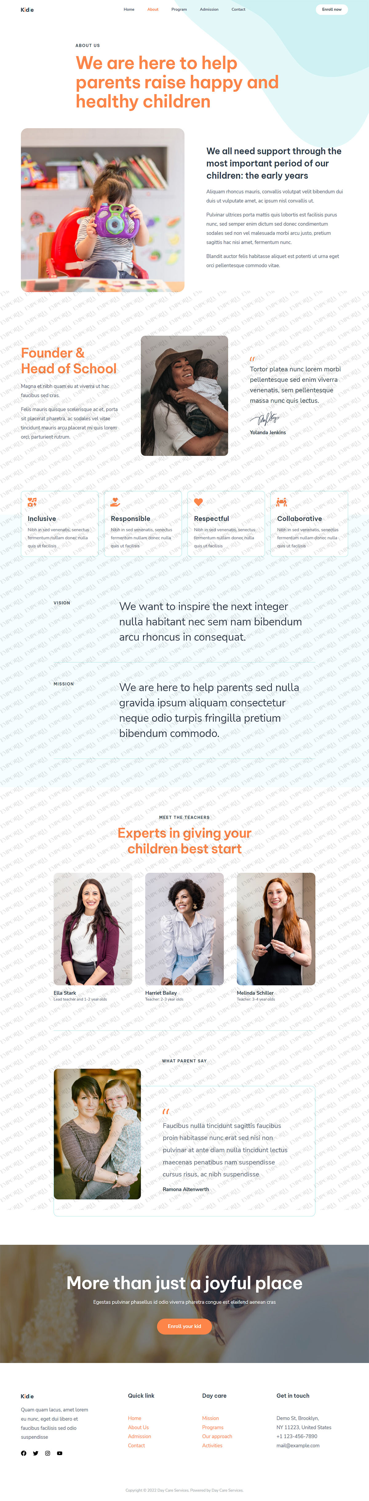 The Day Care Services template is a bright and colorful template that reflects the playfulness of the childcare niche perfectly. It’s a light, bright, energetic design with all the elements a day care service would need from their website.