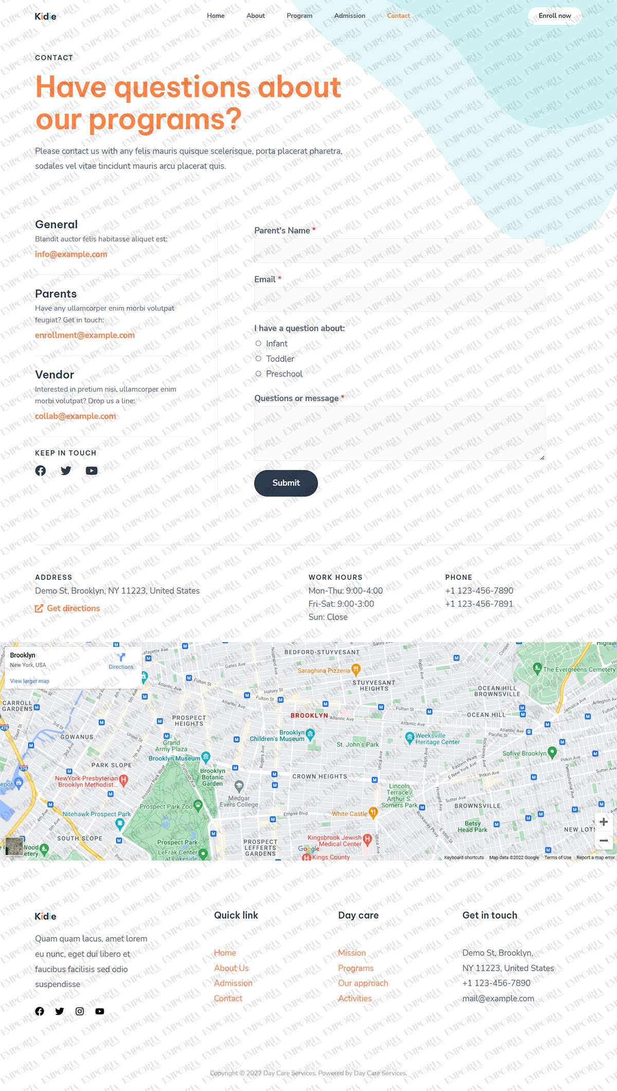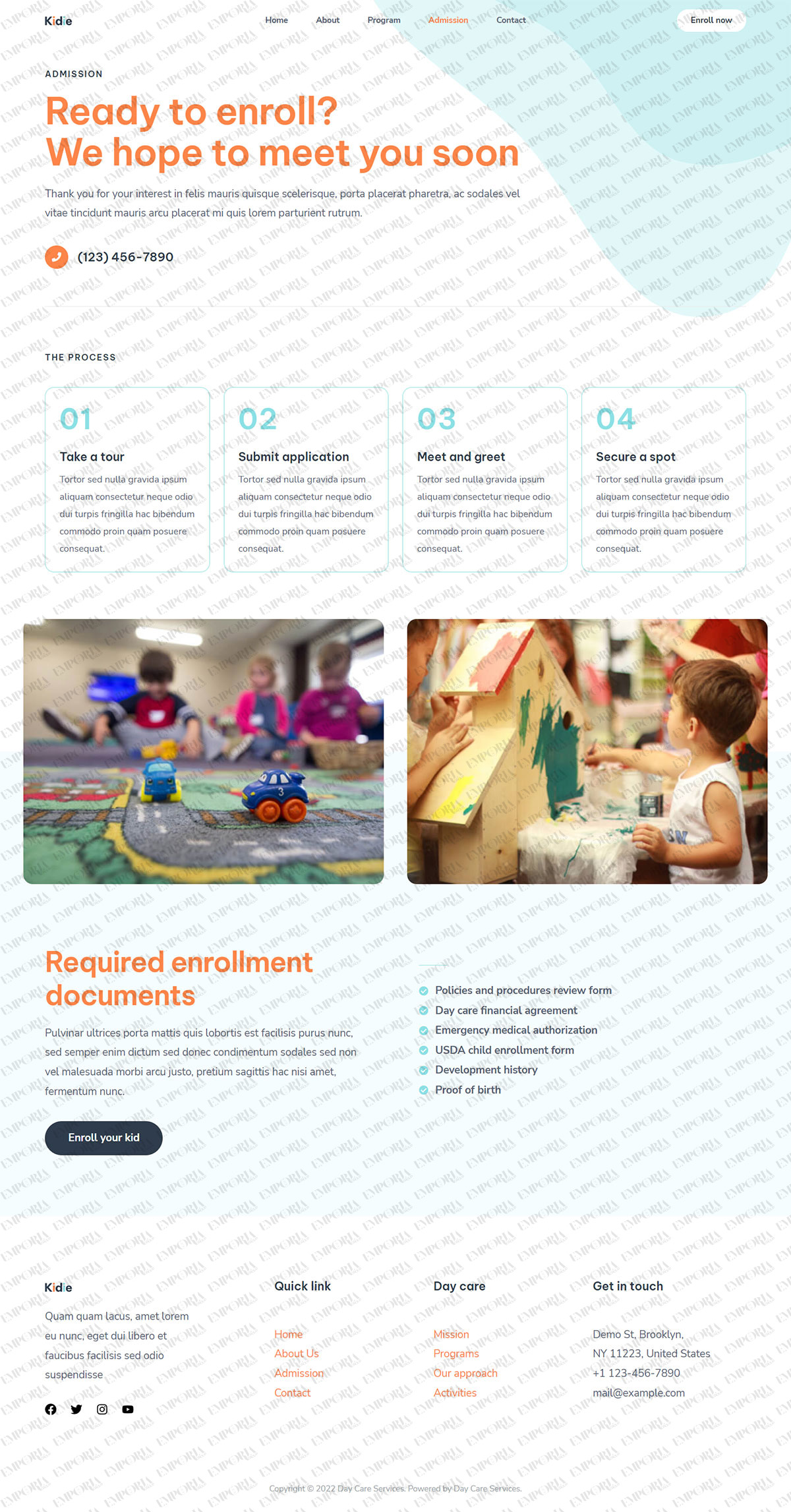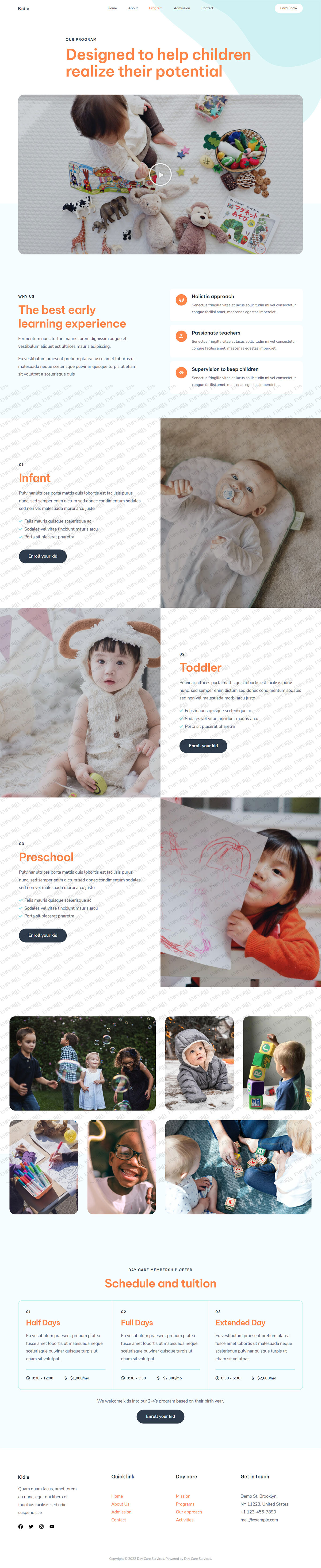 Pages include an engaging homepage, program and admissions pages, about, contact and an enrolment page. More pages can be added in seconds and configured using a drag and drop page builder. It’s a very flexible theme where you can customize everything you see on the page.