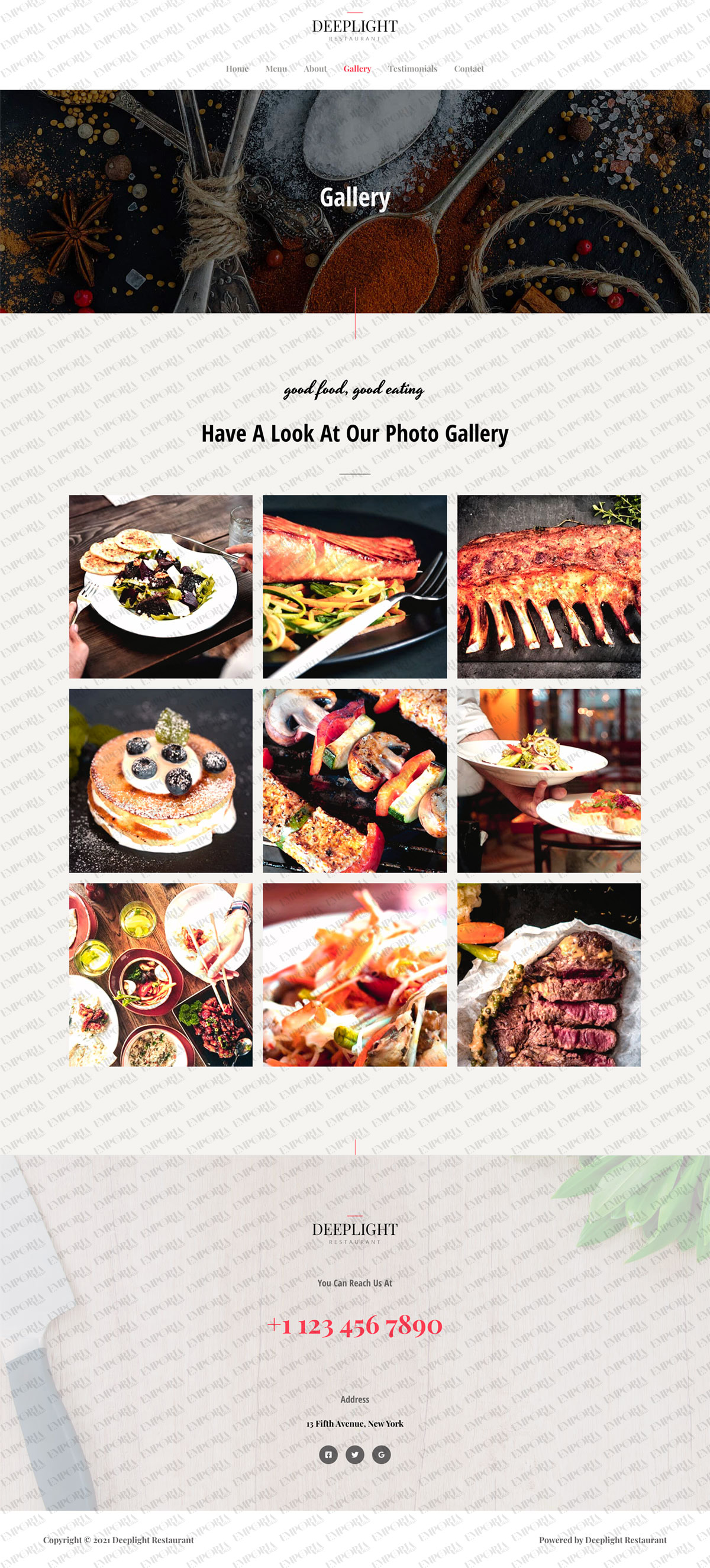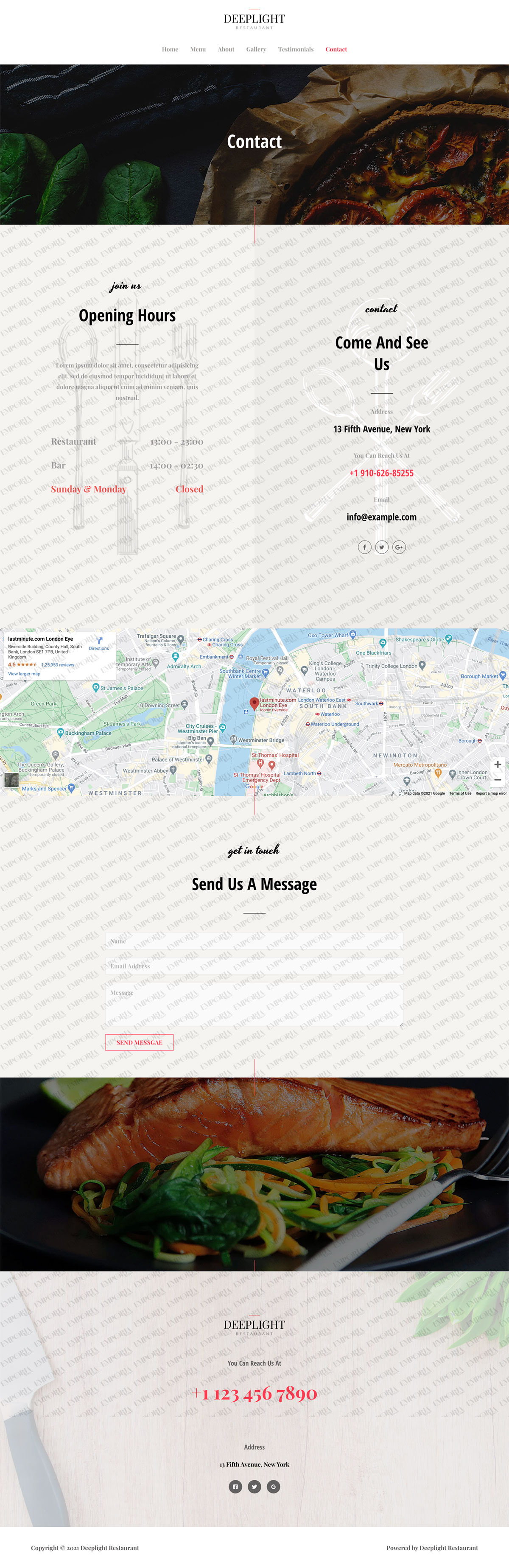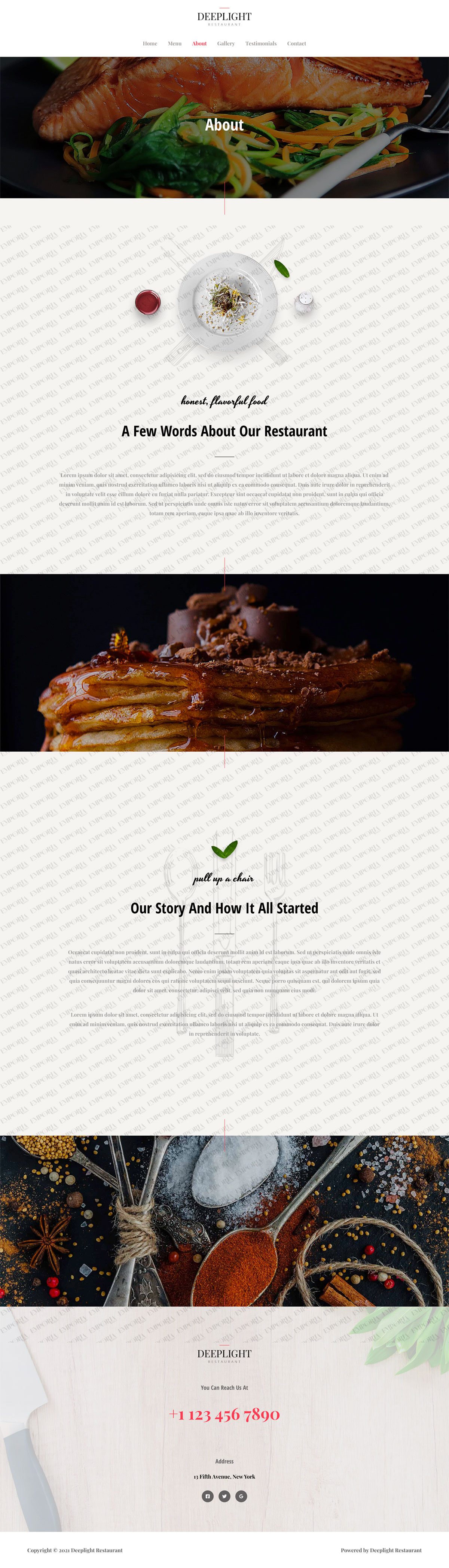 The Deeplight Restaurant template is a cool, contemporary design with a full screen image, central navigation and a subtle arrow directing you down. Further down the homepage, things lighten up with a white background and lots of image options.