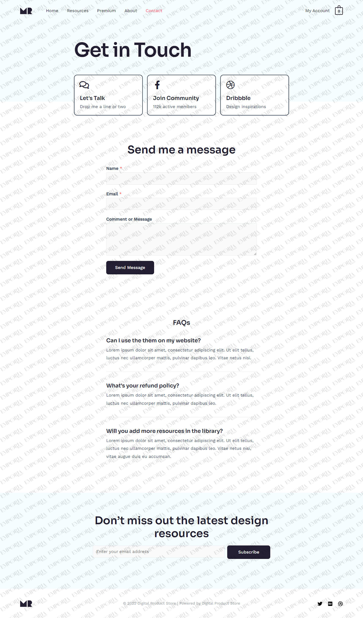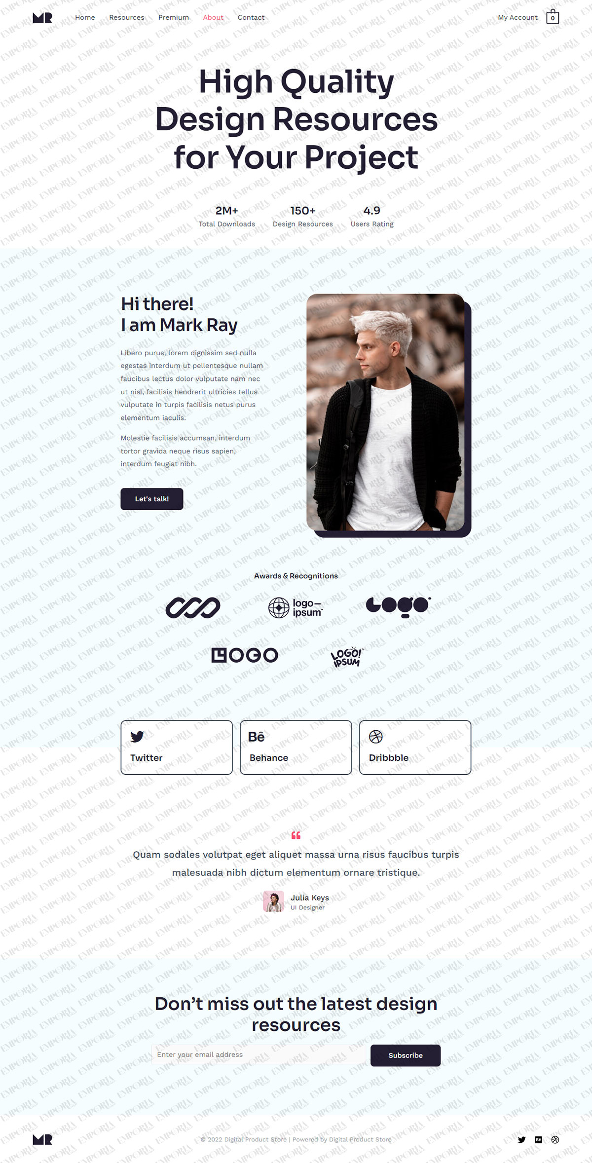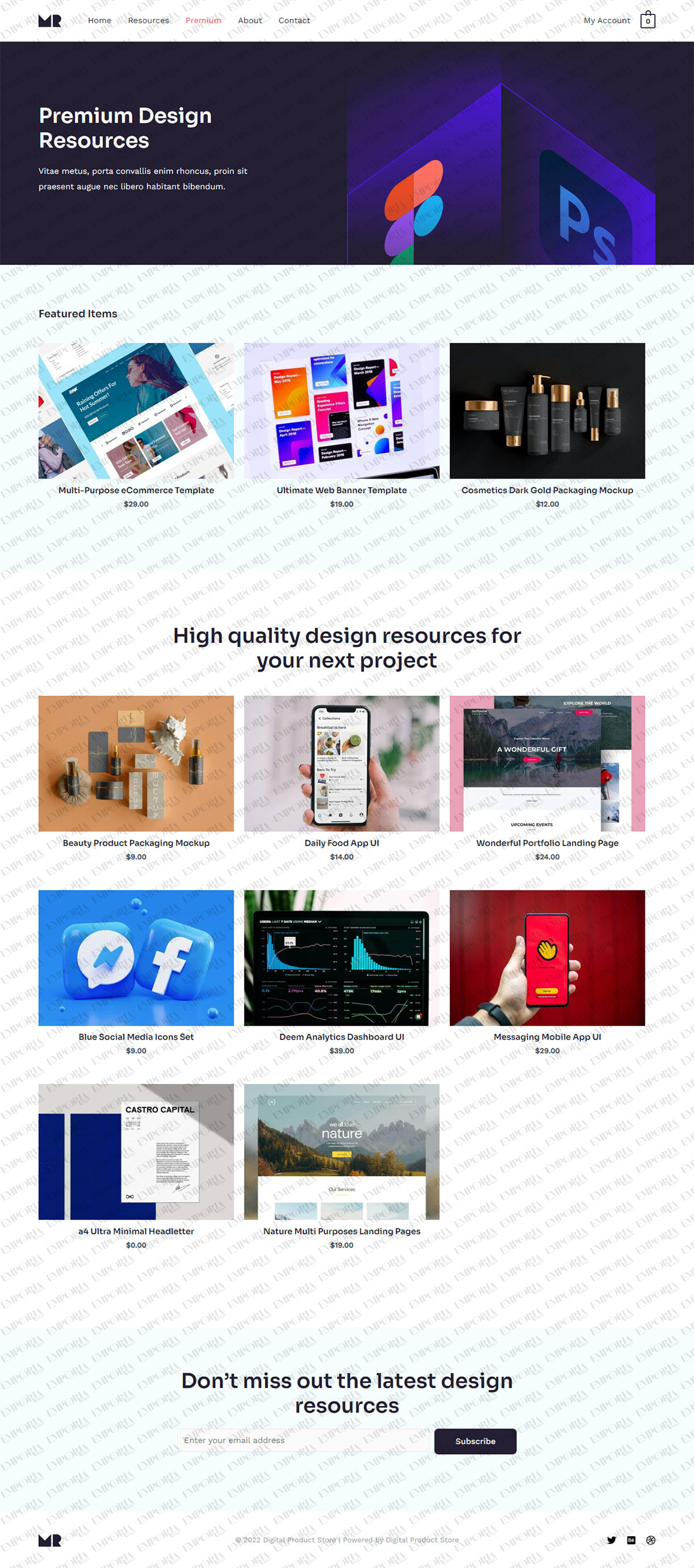 The Digital Product Store template includes highlighted product areas, icon-driven navigation, testimonials, subscription option and attractive supplementary pages. The entire design can be fully customized to suit any products or type of store.