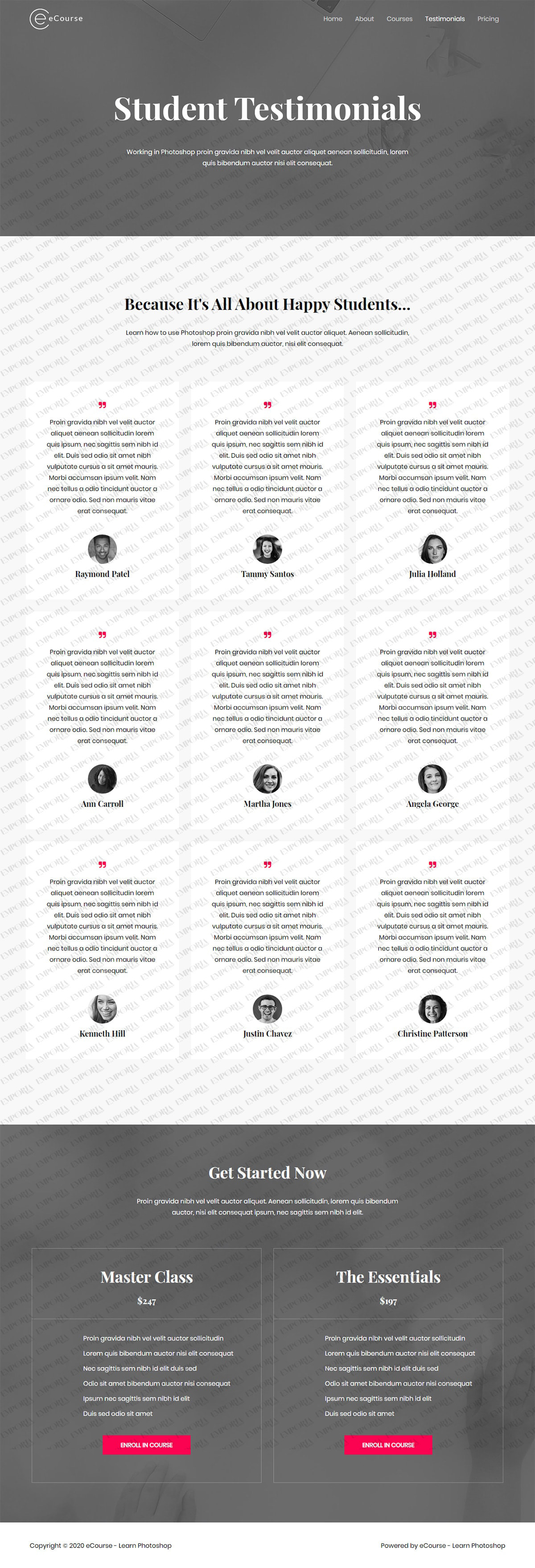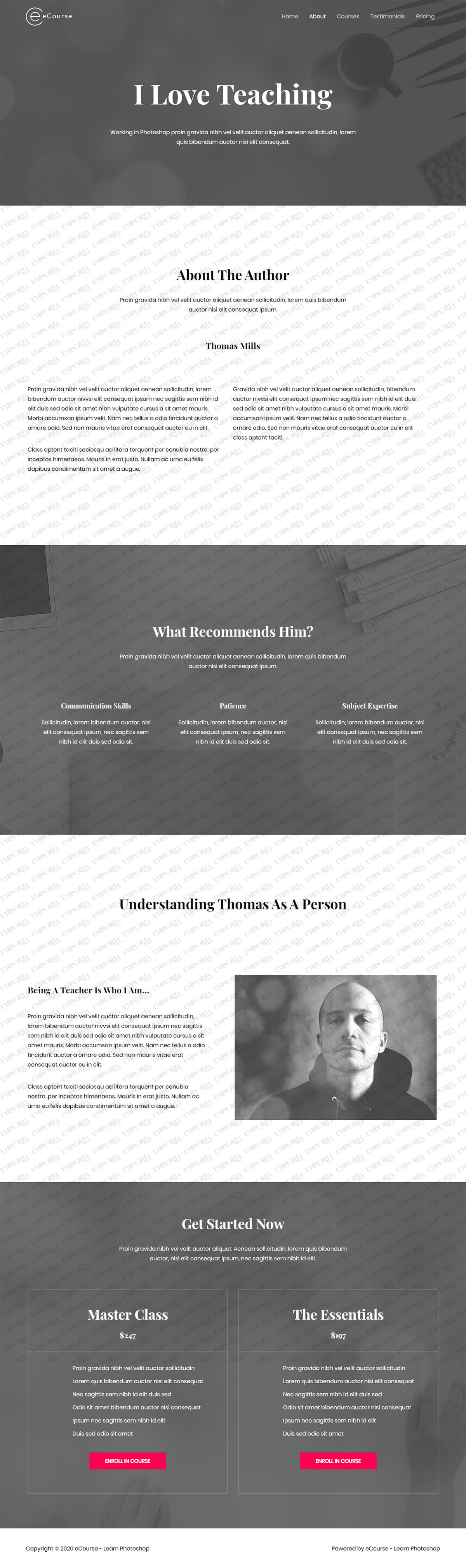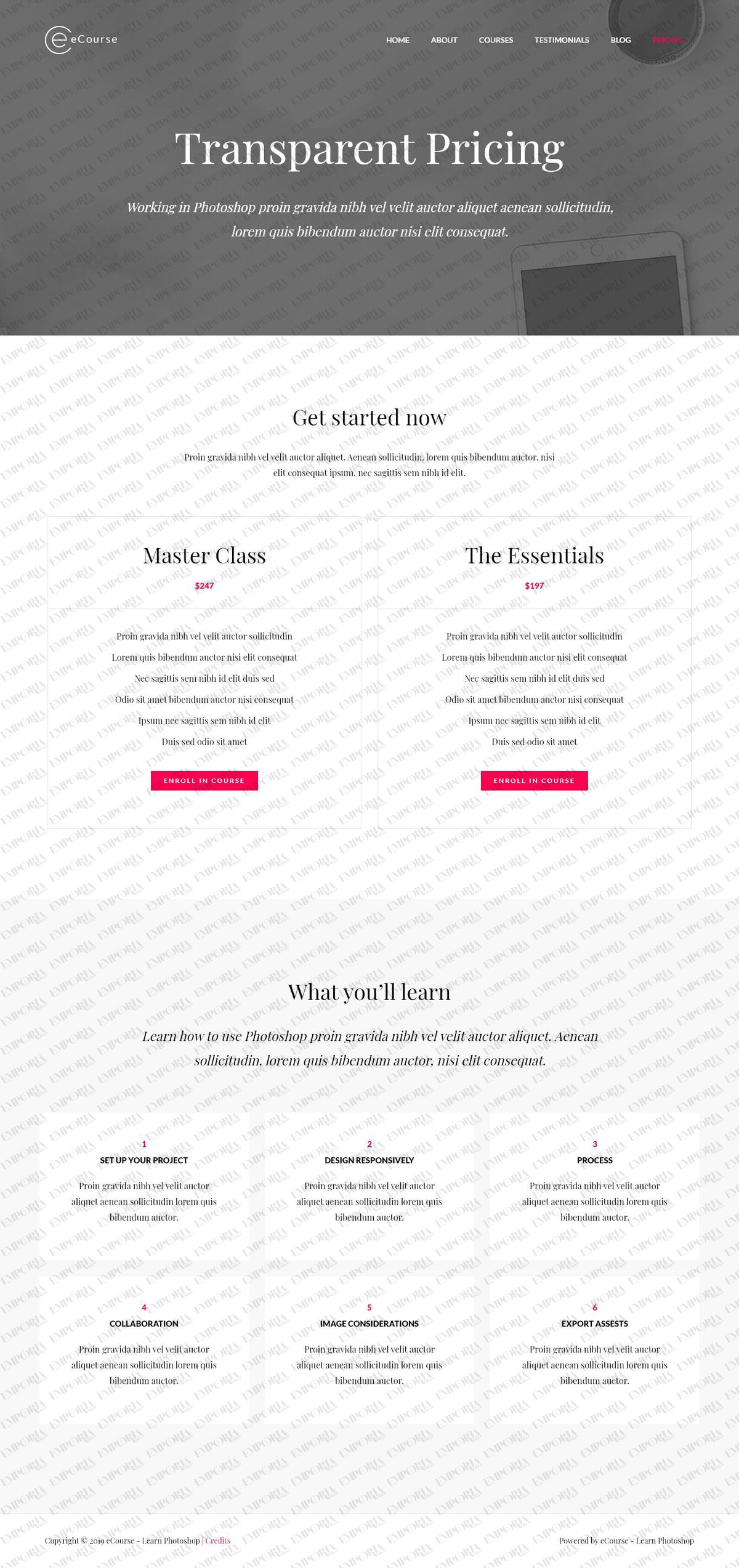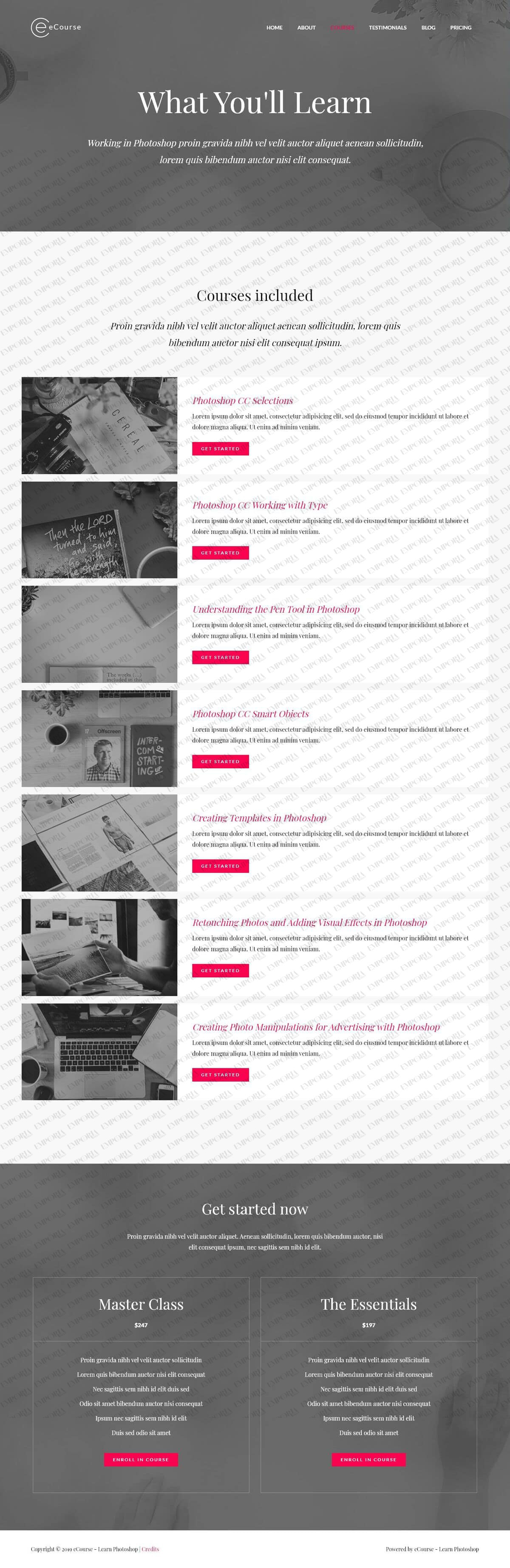The eCourse & Learn Photoshop template is a crisp, modern template ideal for online learning. It uses reassuring colors and a clean layout with alternating shaded and white areas with a bold color for calls to action.