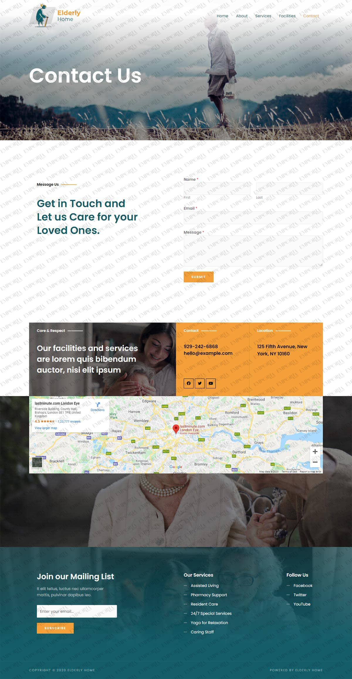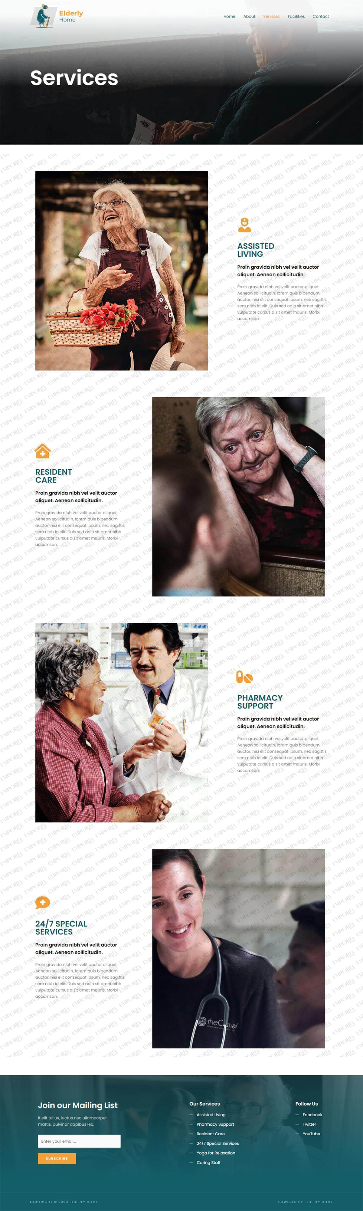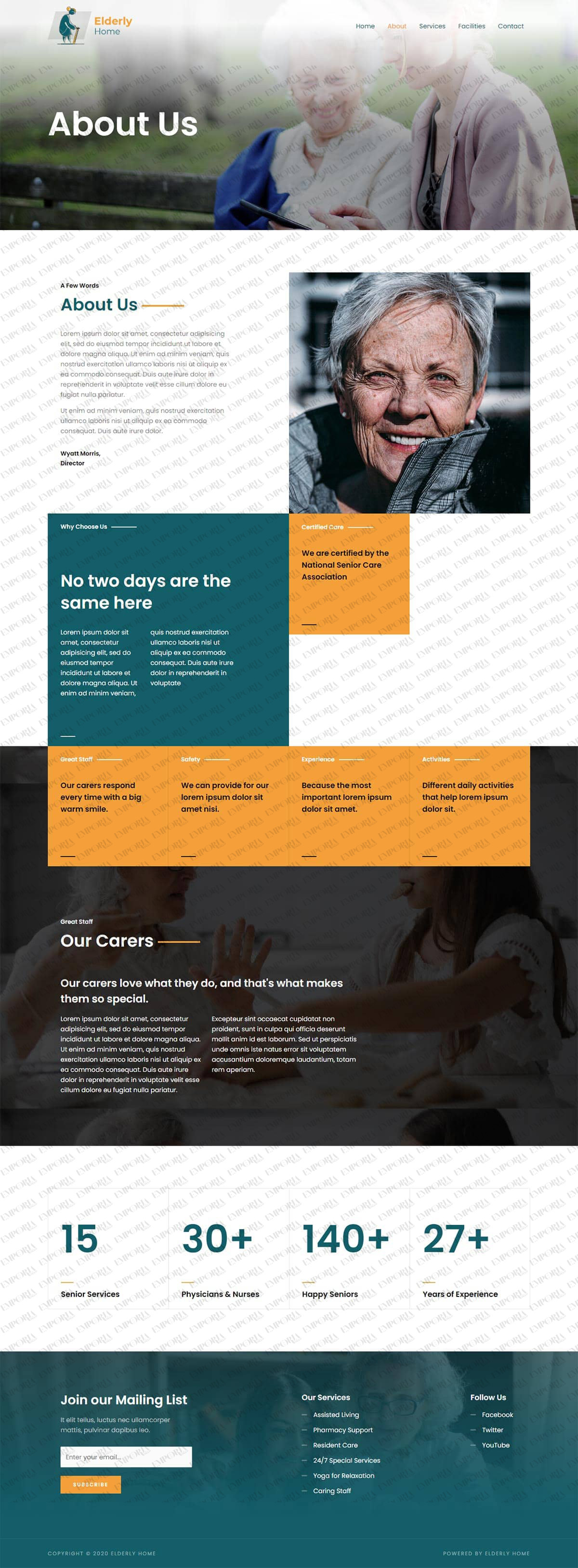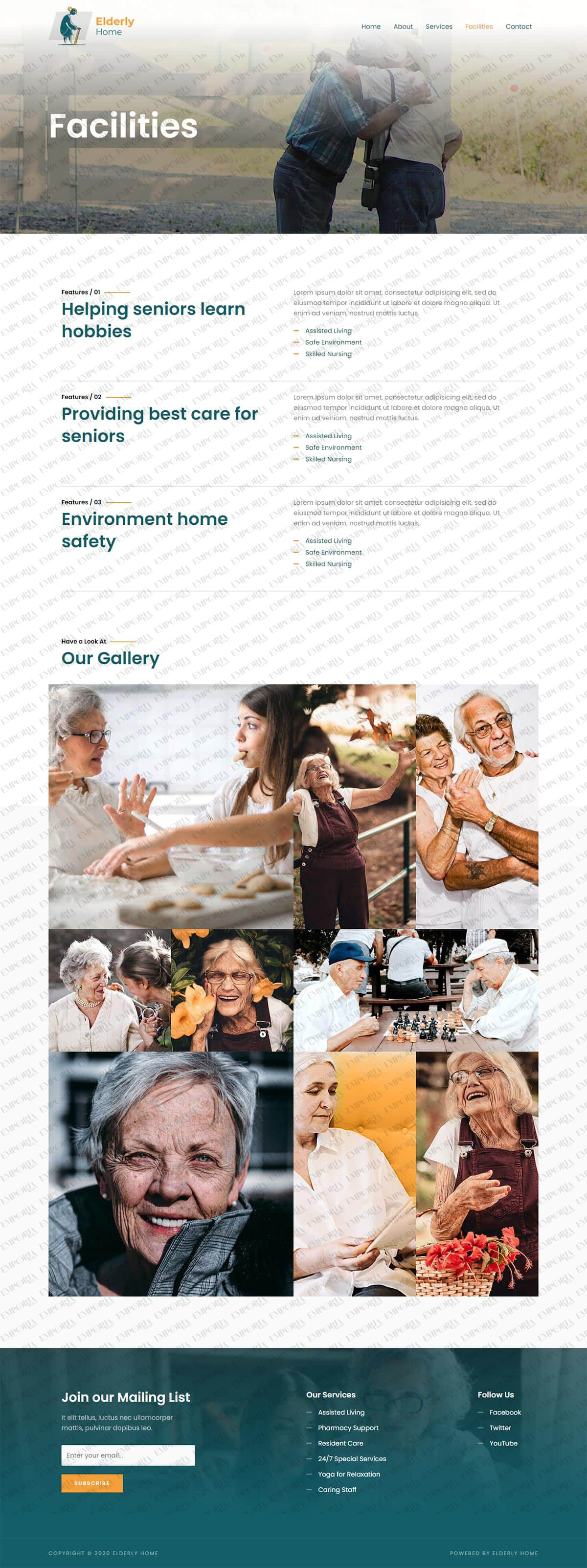 The Elderly Home template has a friendly feel with a full screen image and calm colors throughout. The homepage opens with a full screen image and contact details front and center before unfolding into a white background with a selection of relevant content areas.